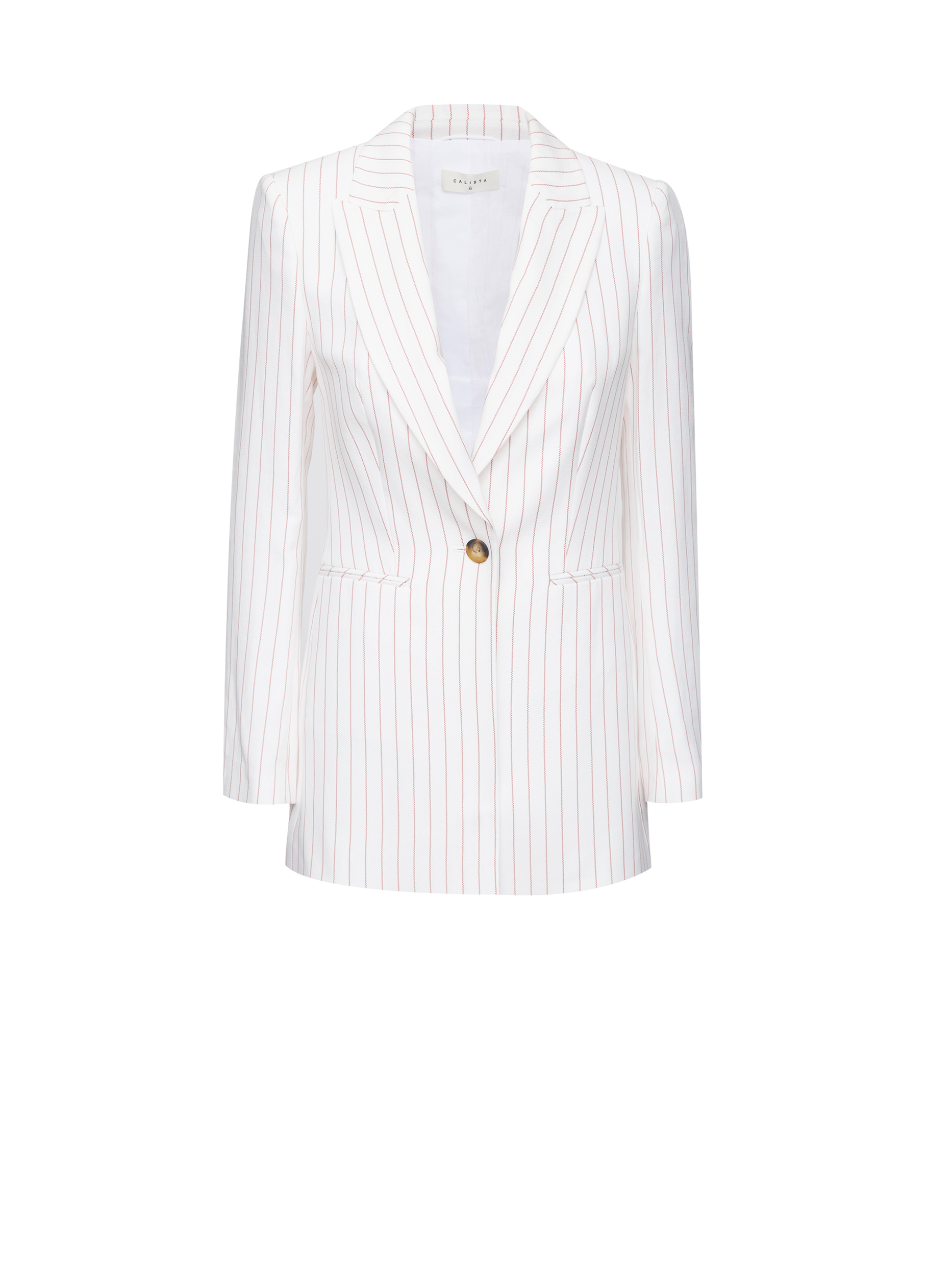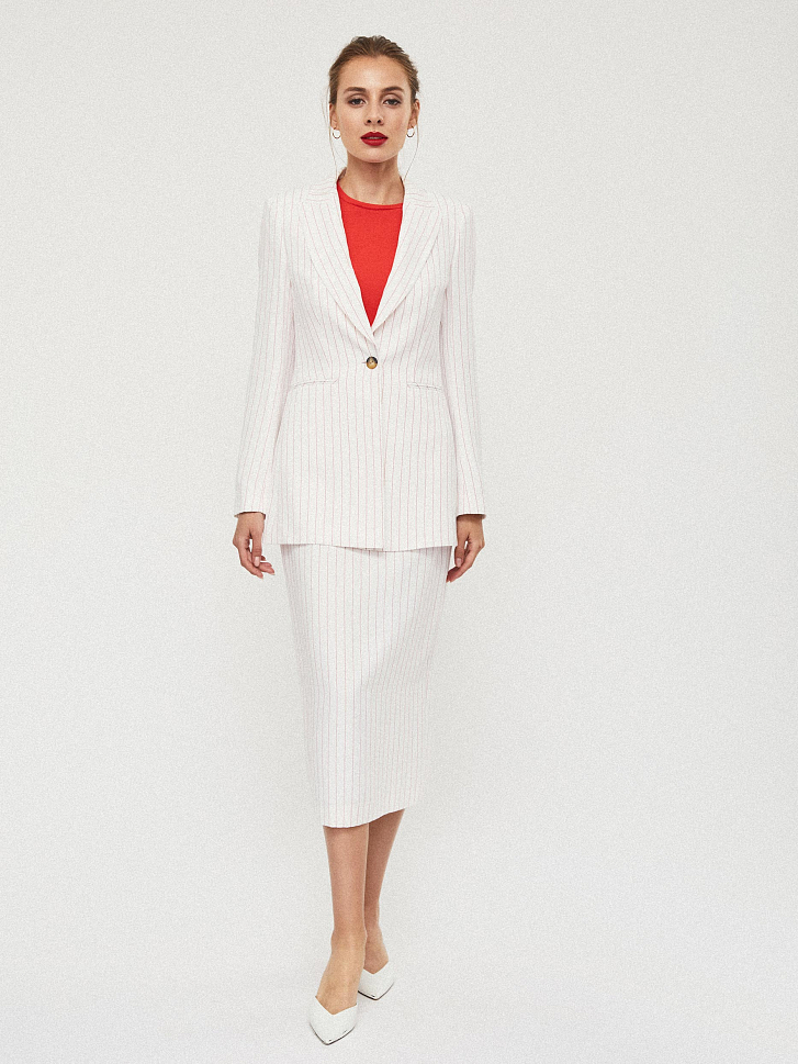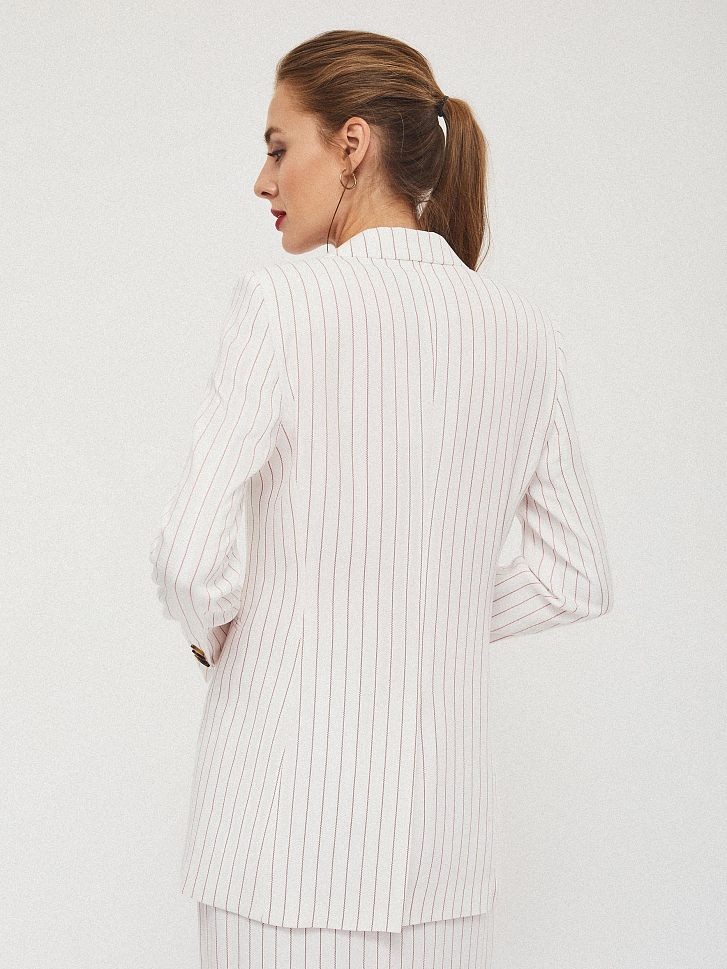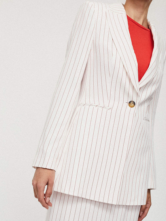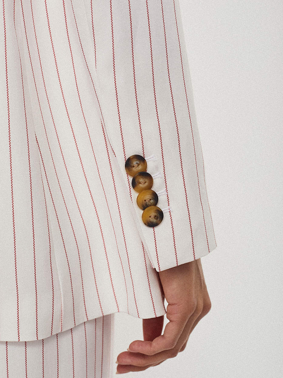 Удлиненный однобортный жакет приталенного кроя. Декоративные передние карманы, на рукавах ряды крупных контрастных пуговиц, шлица сзади.