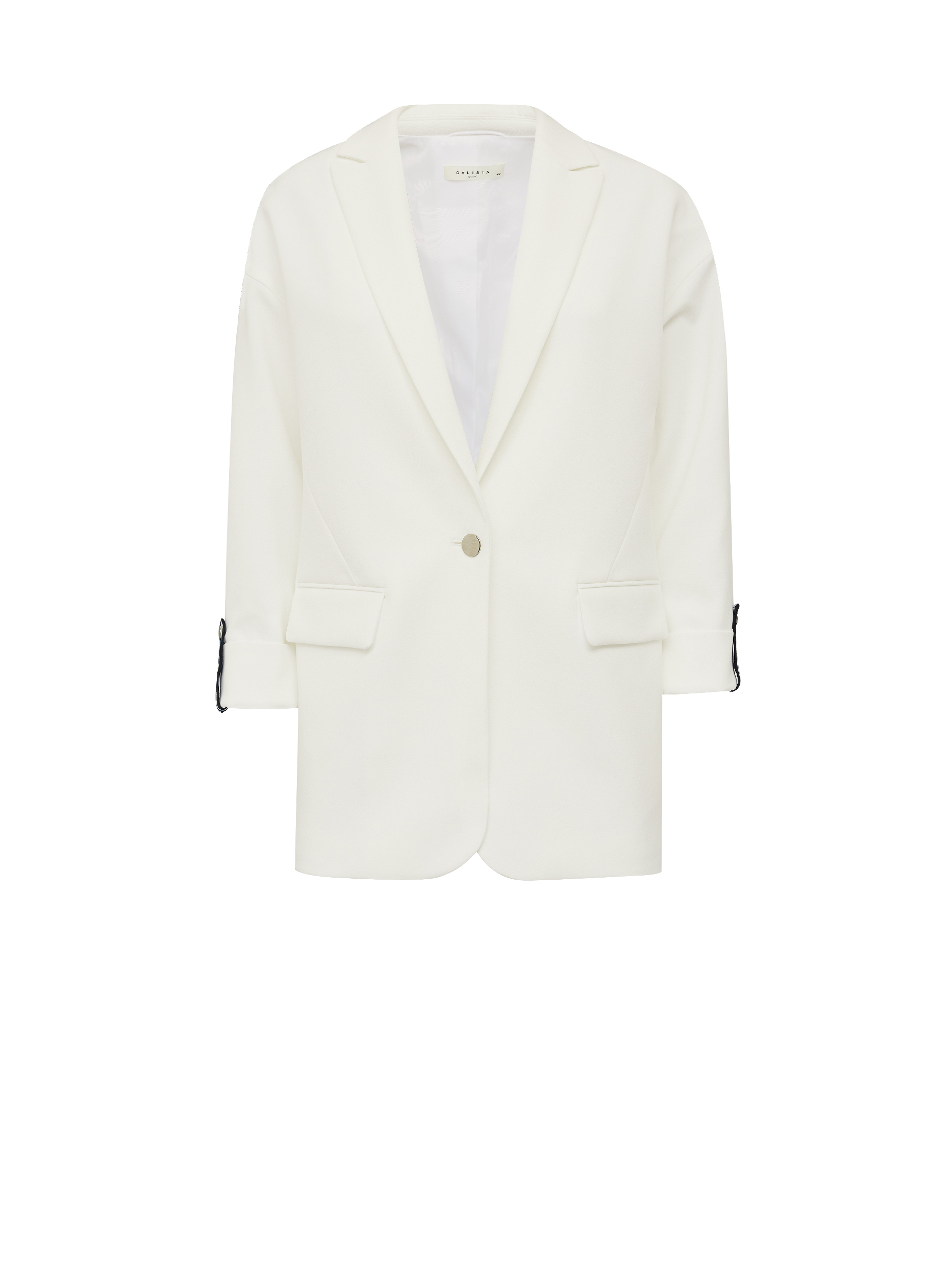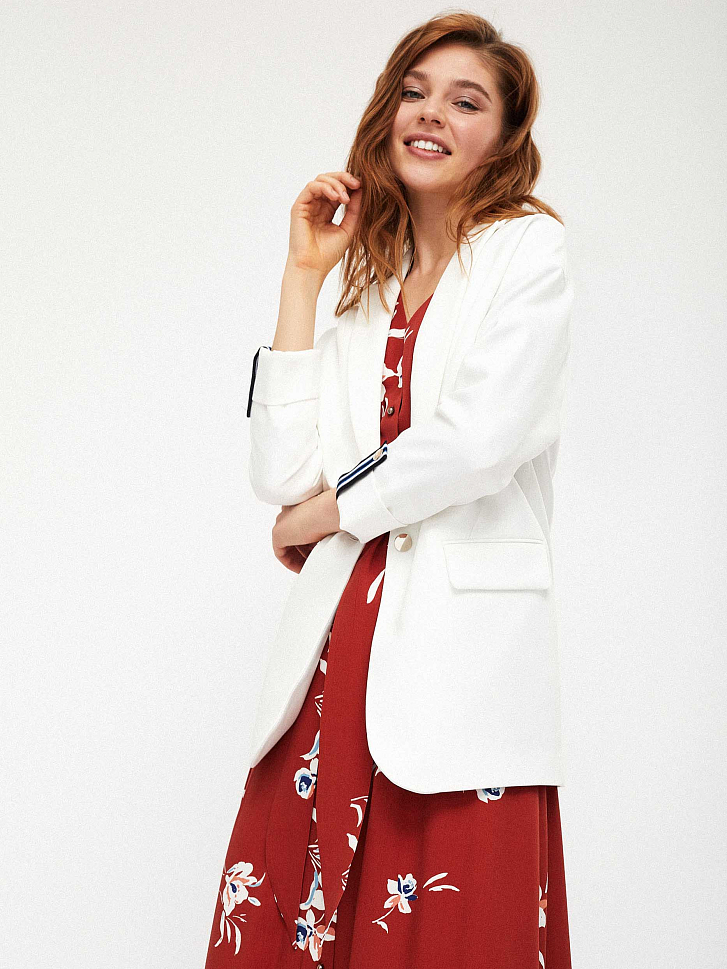 Удлиненный жакет oversize с  воротником и лацканами.  Застёжка на металлическую  пуговицу. Изделие с прорезными  карманами с клапанами спереди.  Изделие на подкладке. Рост модели 176  см, размер 42 (российский)
