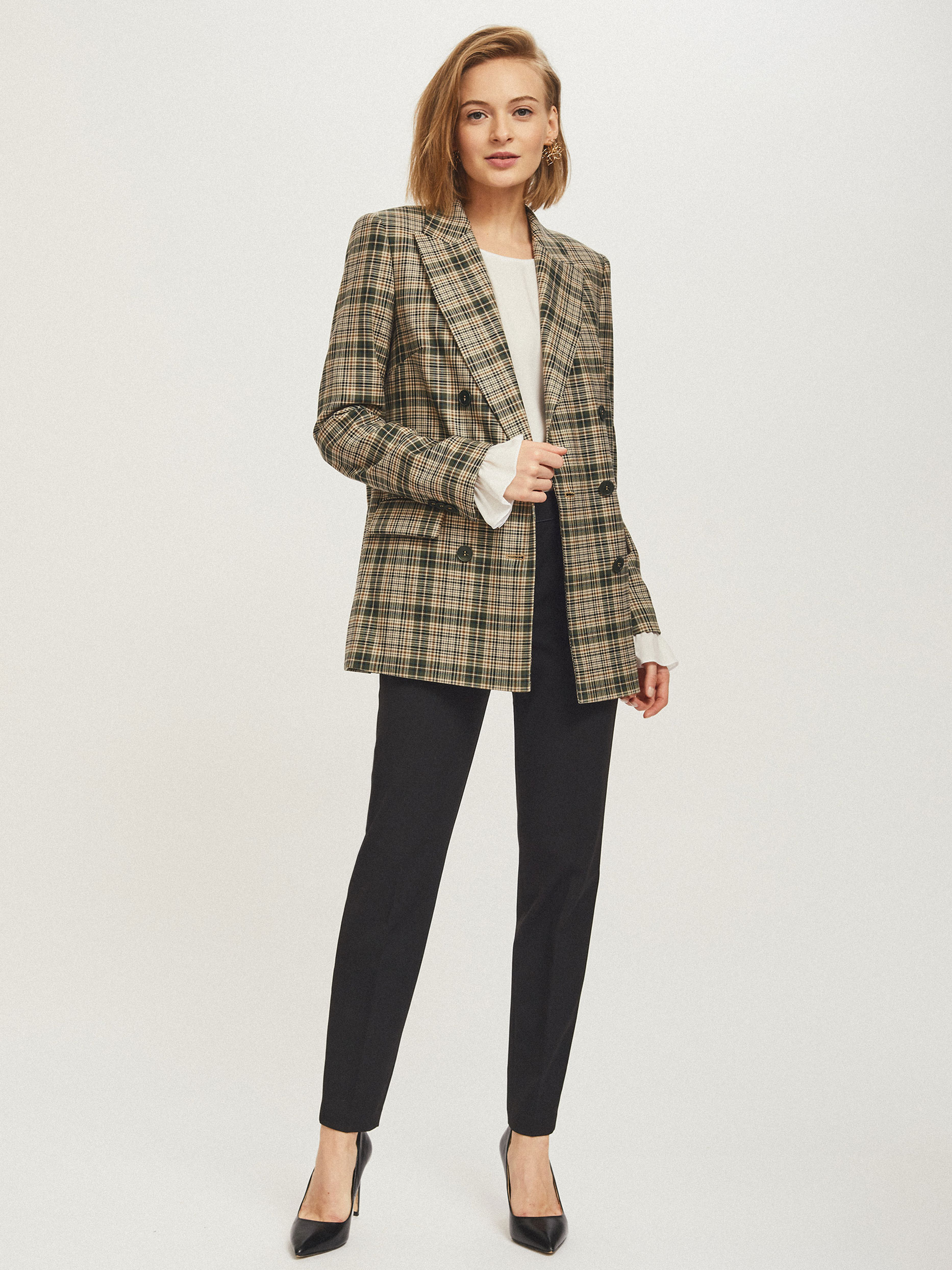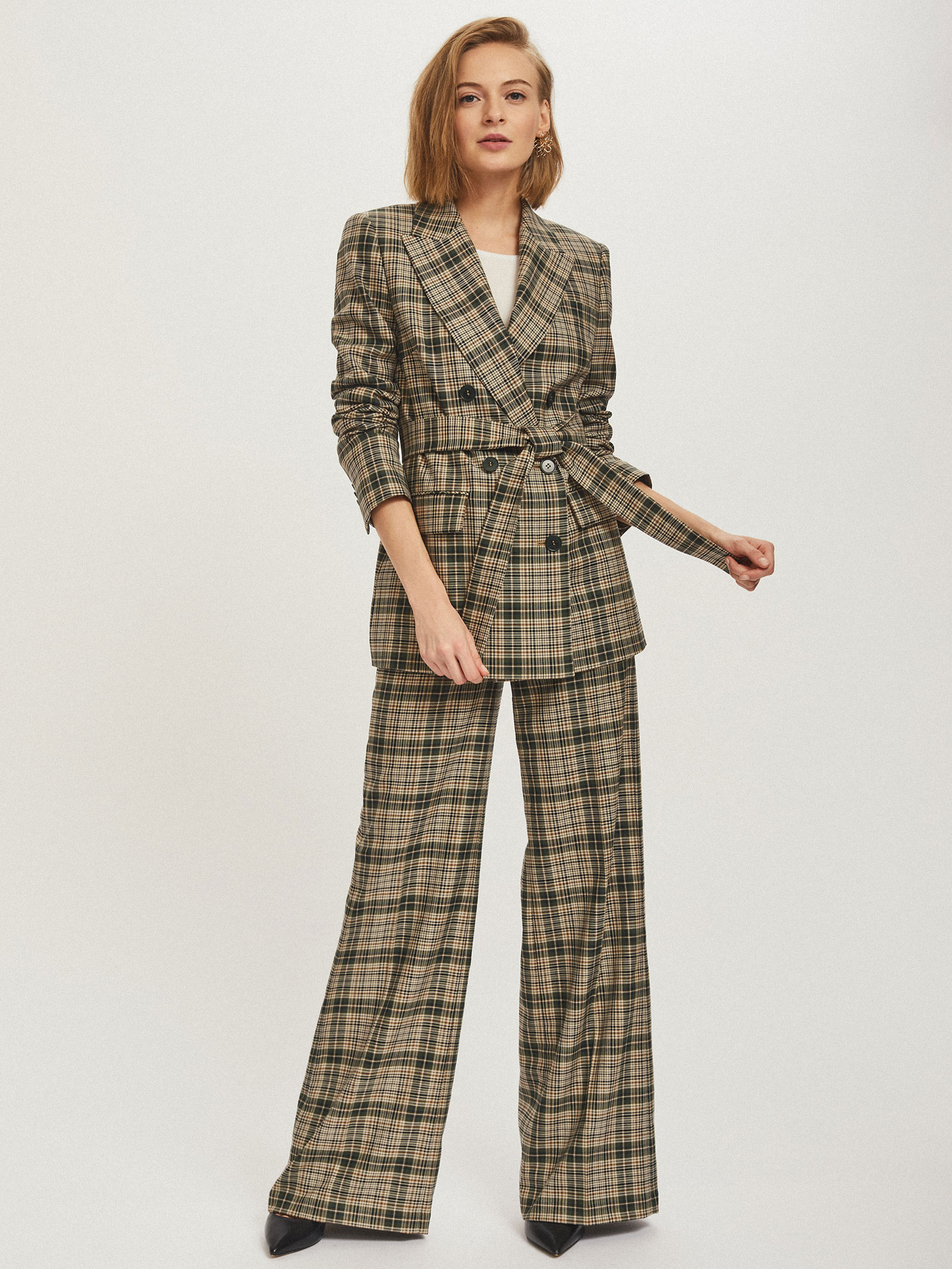 Жакет прямого силуэта, выполненный из плотной смесовой вискозы. Лацканы, декоративный нагрудный карман, прорезные карманы с клапанами, двубортная застежка на пуговицы. В комплекте пояс-хомут из этой же ткани. Изделие на подкладке