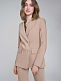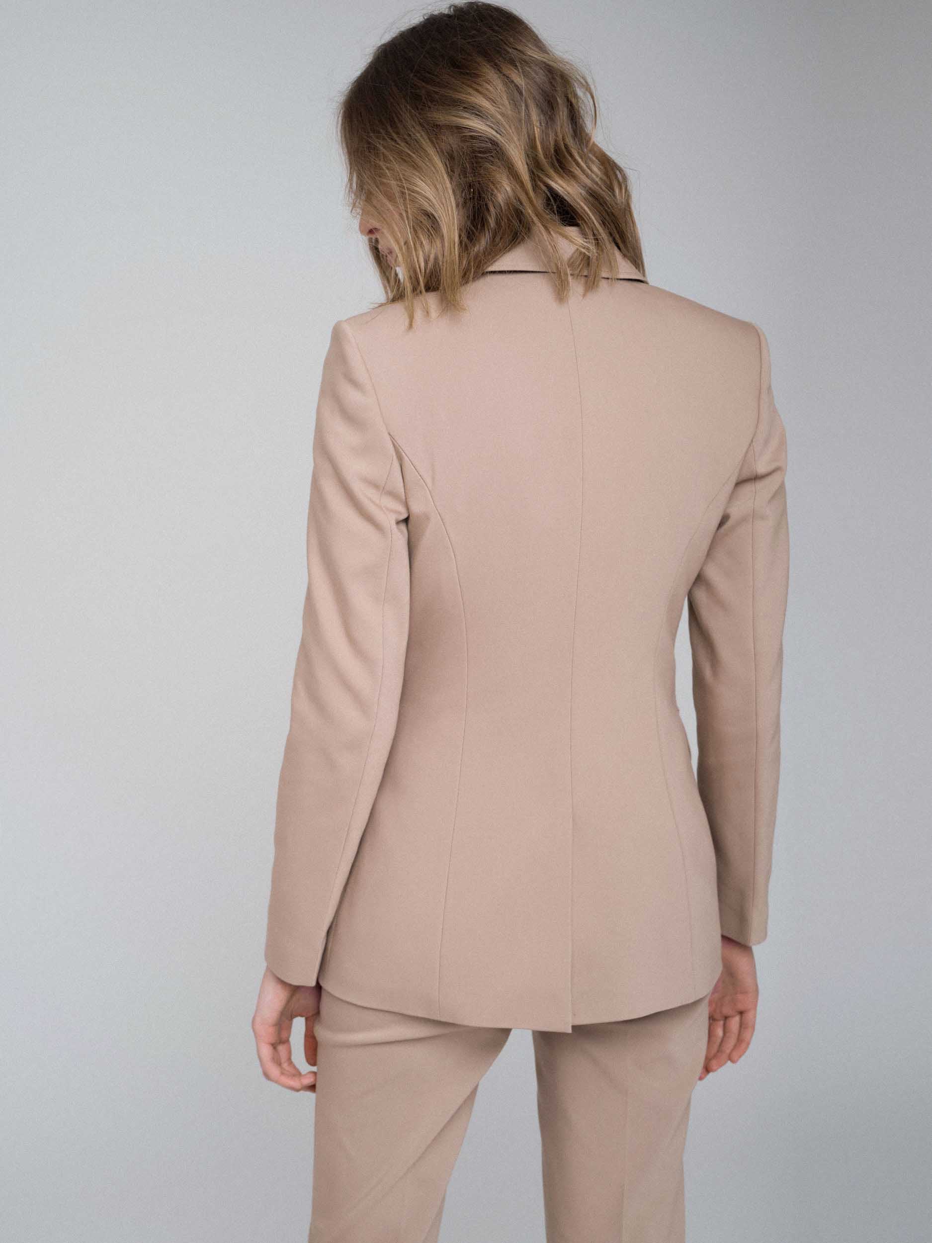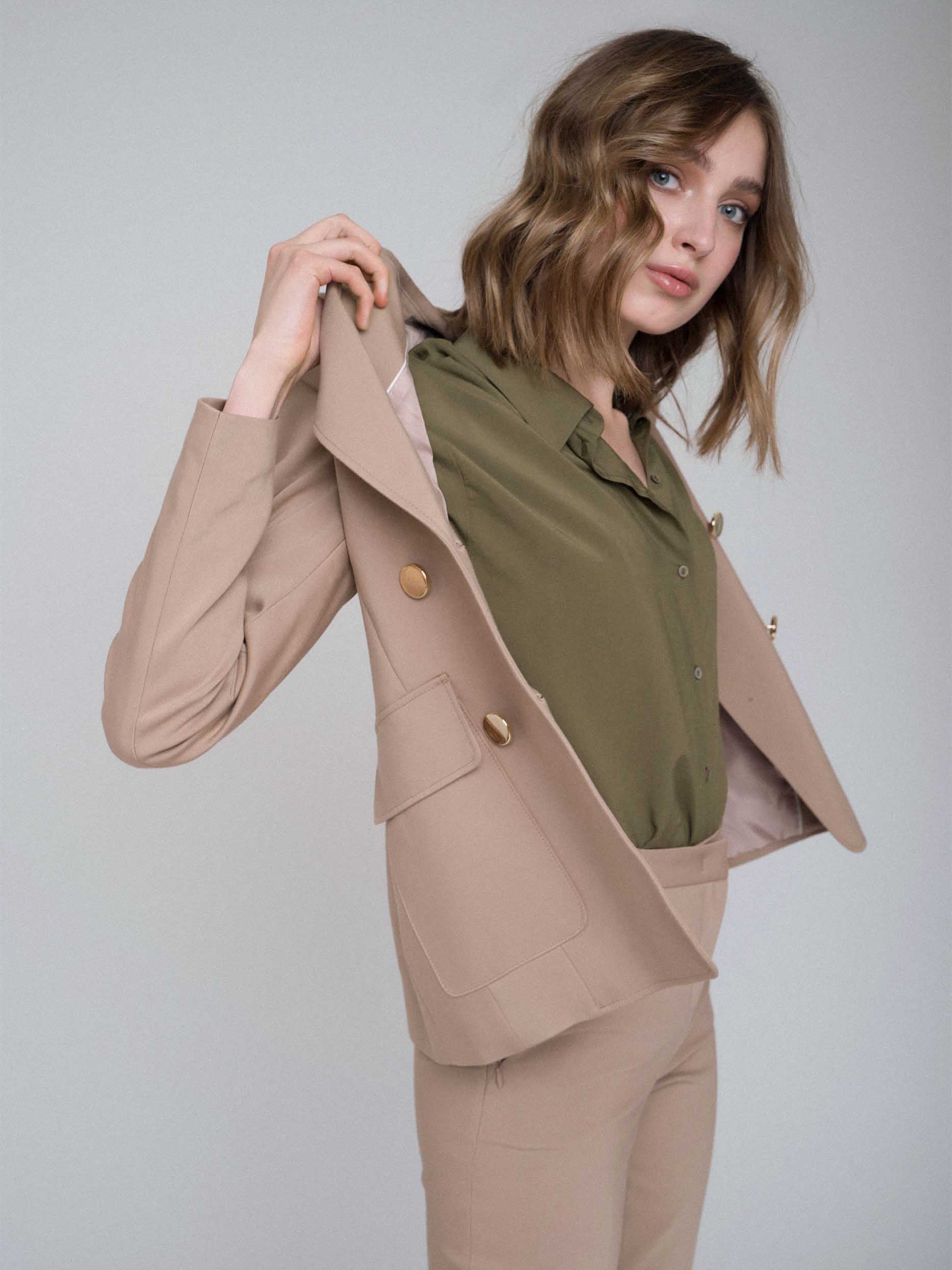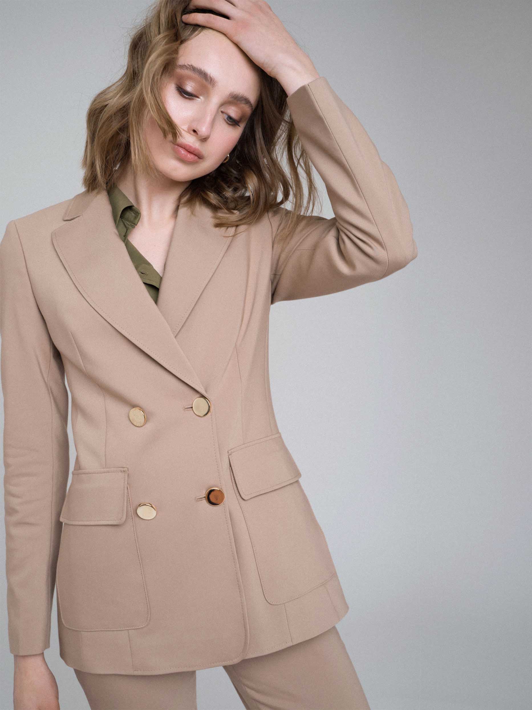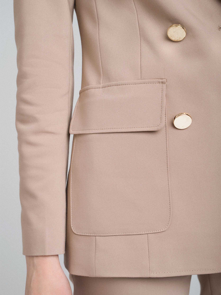 Удлиненный жакет приталенного кроя. Накладные карманы с клапанами, пуговицы на рукавах, шлица. Застегивается на два ряда крупных металлических пуговиц.
