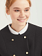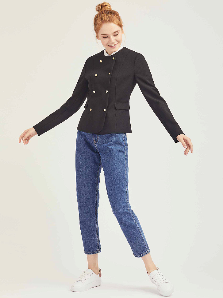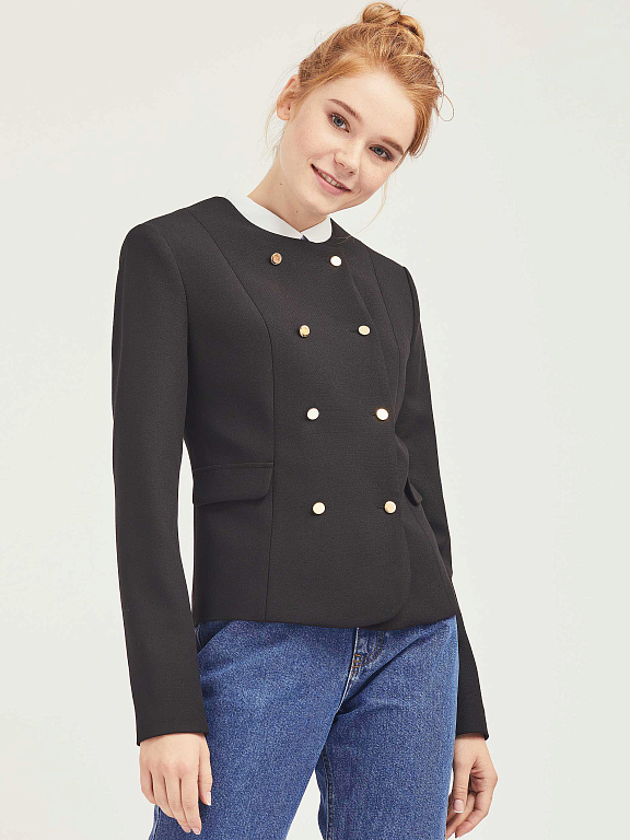 Двубортный жакет приталенного кроя. Округлый вырез, декоративные карманы с клапанами, двубортная застежка на металлические пуговицы. Изделие на подкладке.