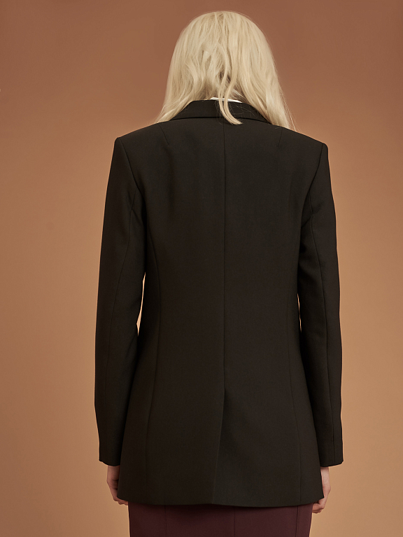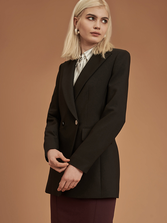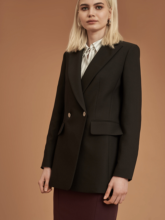 Двубортный жакет прямого кроя. Лацканы, карманы с клапанами. Застегивается на крупные металлические пуговицы. Изделие на подкладке.
