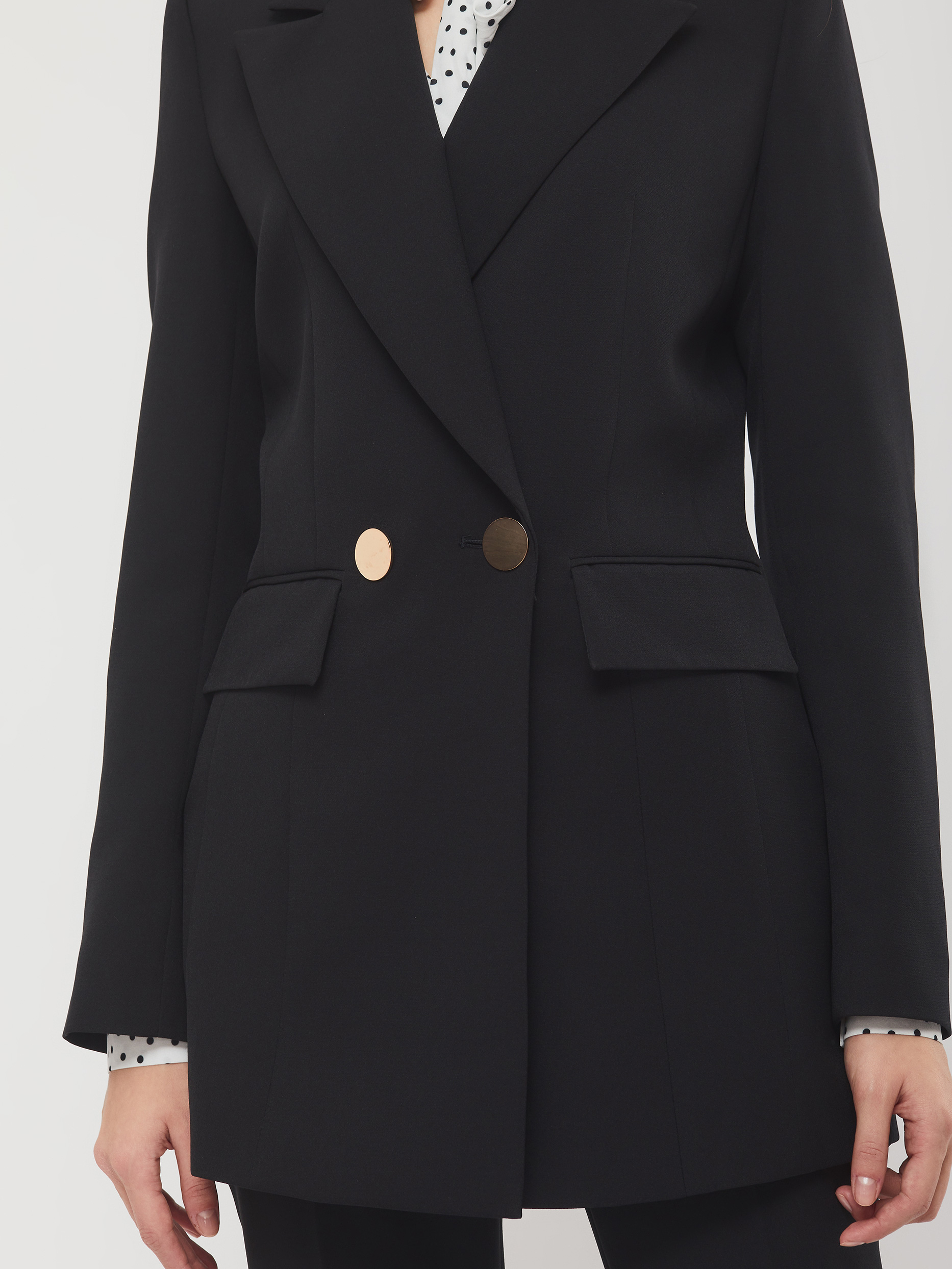 Удлиненный двубортный жакет прямого силуэта с отложным воротником и лацканами. Изделие с застёжкой на металлические  пуговицы и боковыми карманами с клапанами.  Силуэт подчёркнут тонкими подплечниками. Изделие на  подкладке.  Рост модели 176 см, размер 42 (российский)
