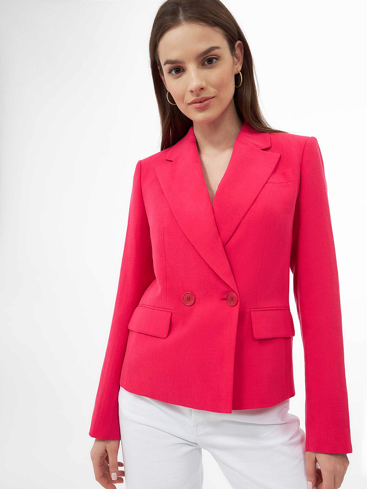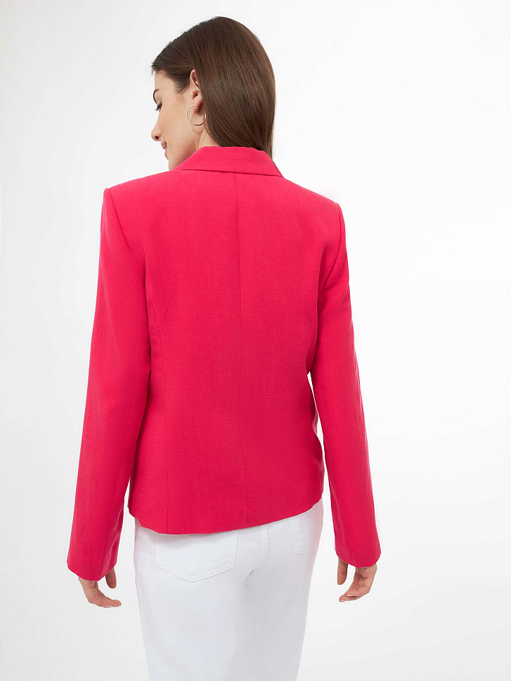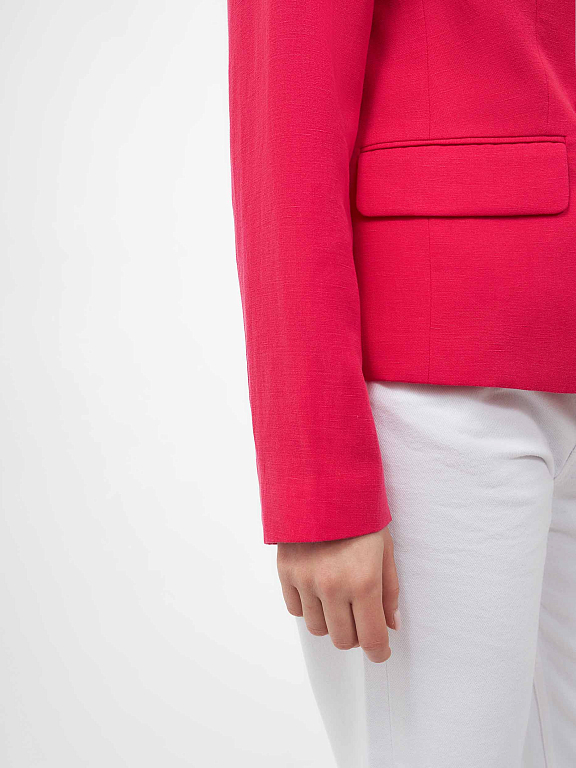 Укороченный жакет изо льна слегка приталенного кроя. Отложной воротник с лацканами, подплечники, подклад.