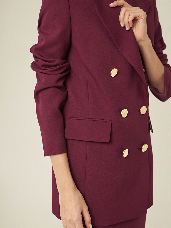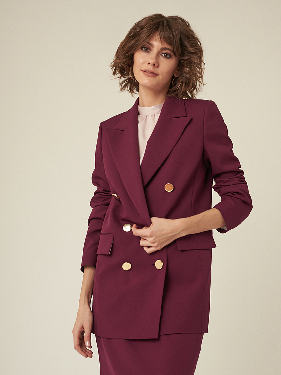 Удлиненный жакет прямого кроя. Лацканы, карманы с клапанами. Застегивается на два ряда крупных металлических пуговиц. Изделие на подкладке.