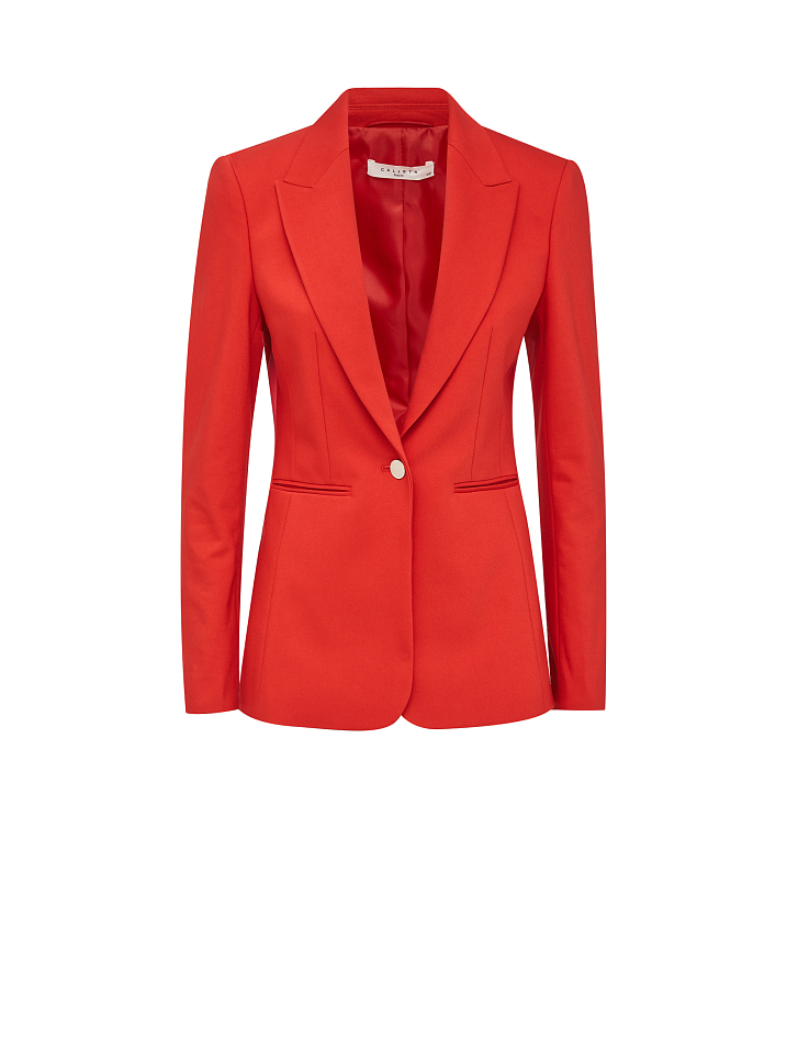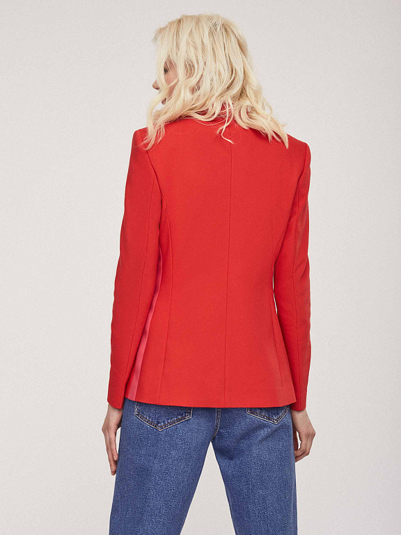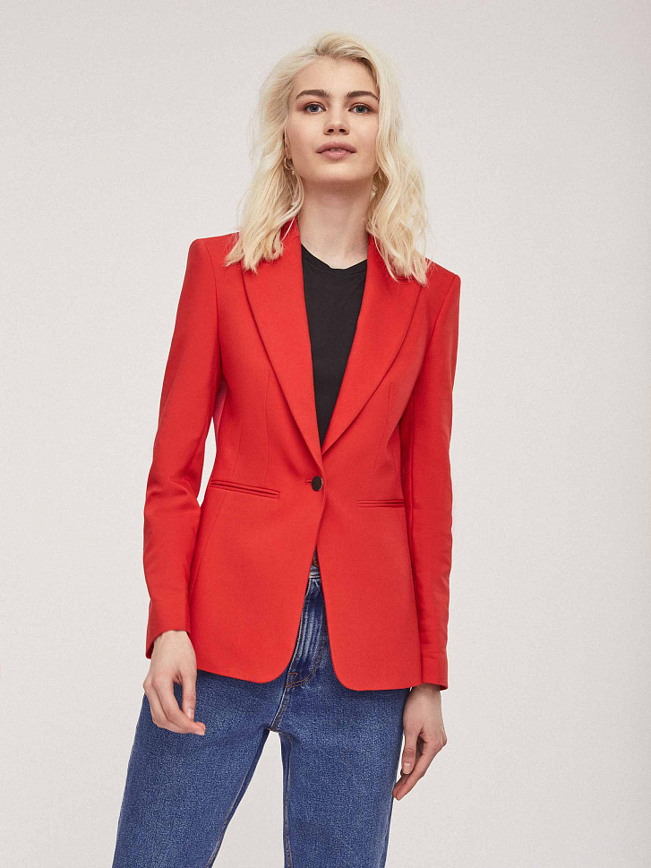 Приталенный однобортный жакет, выполненный из смесового хлопка. Лацканы, длинные рукава. Застегивается на металлическую глянцевую пуговицу. Изделие на подкладке.