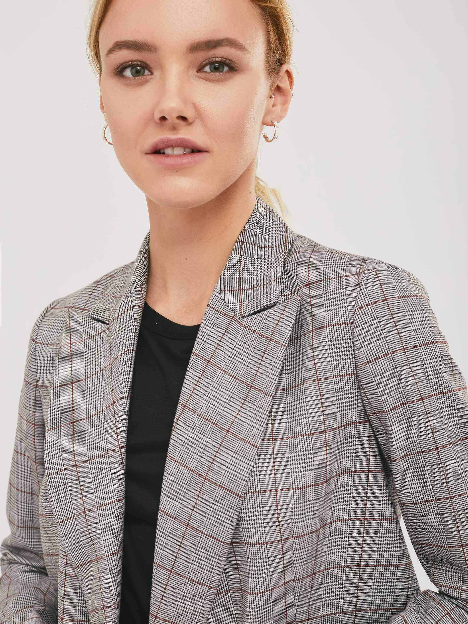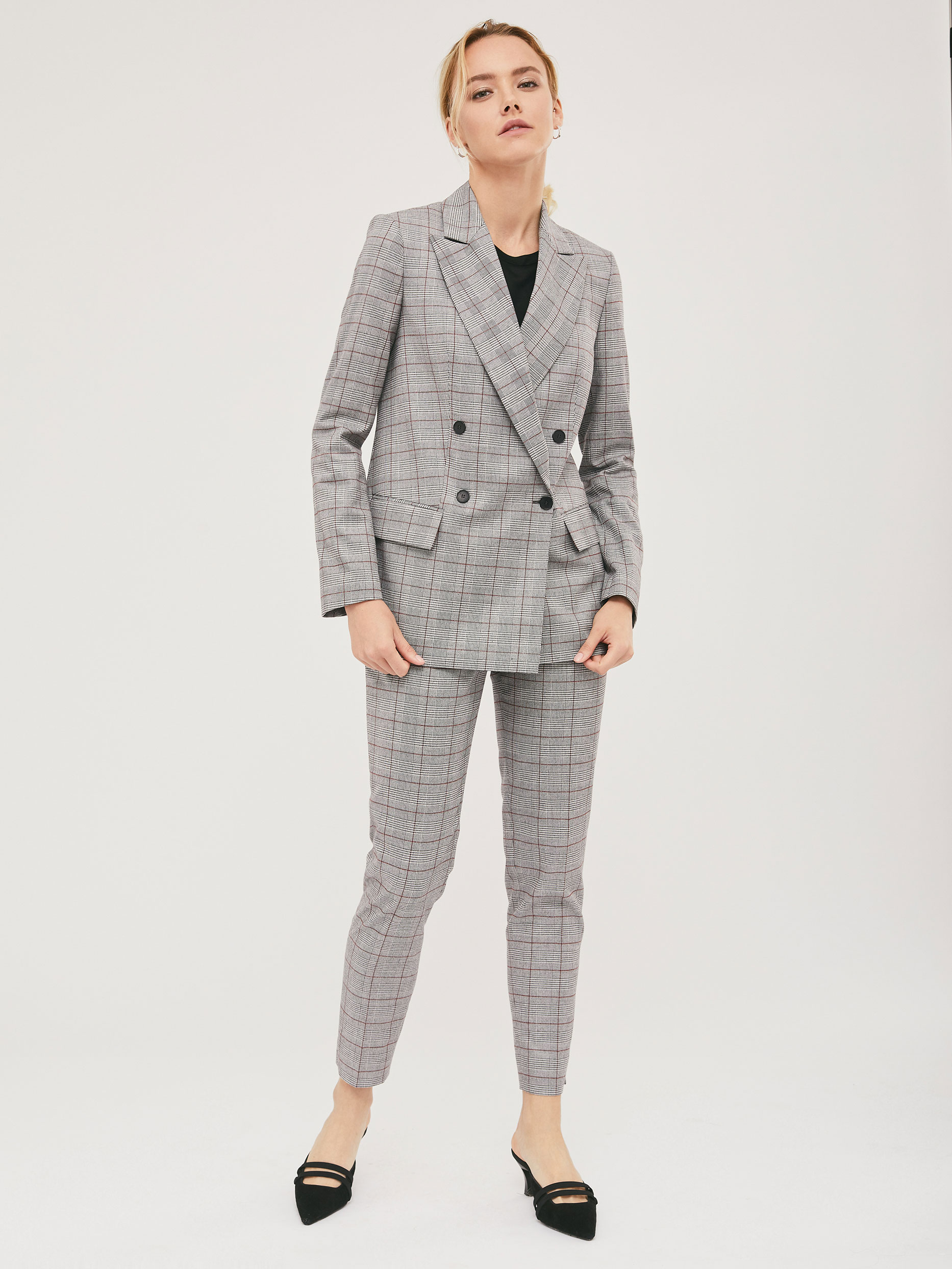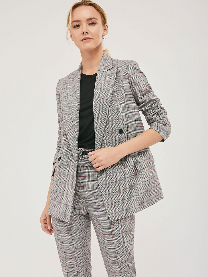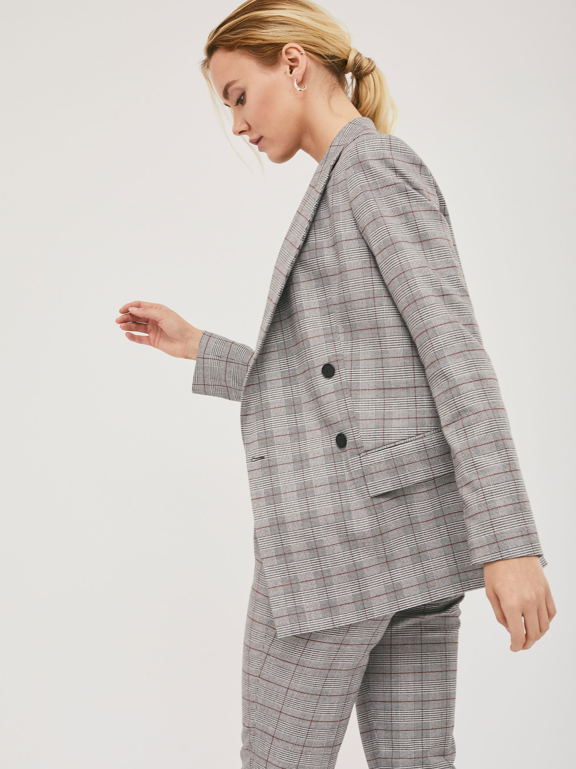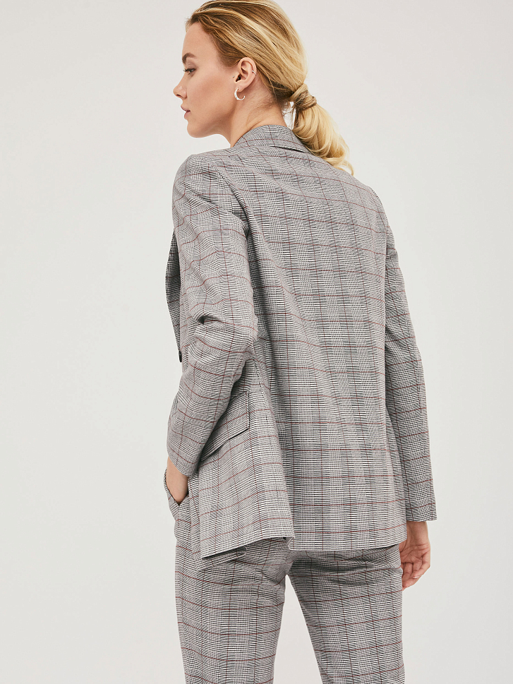 Двубортный пиджак в клетку прямого силуэта с отложным воротником и лацканами. Изделие с застёжкой на пуговицы и боковыми карманами с клапанами.  Силуэт подчёркнут тонкими подплечниками. Изделие на  подкладке.  Рост модели 176 см, размер 42 (российский)