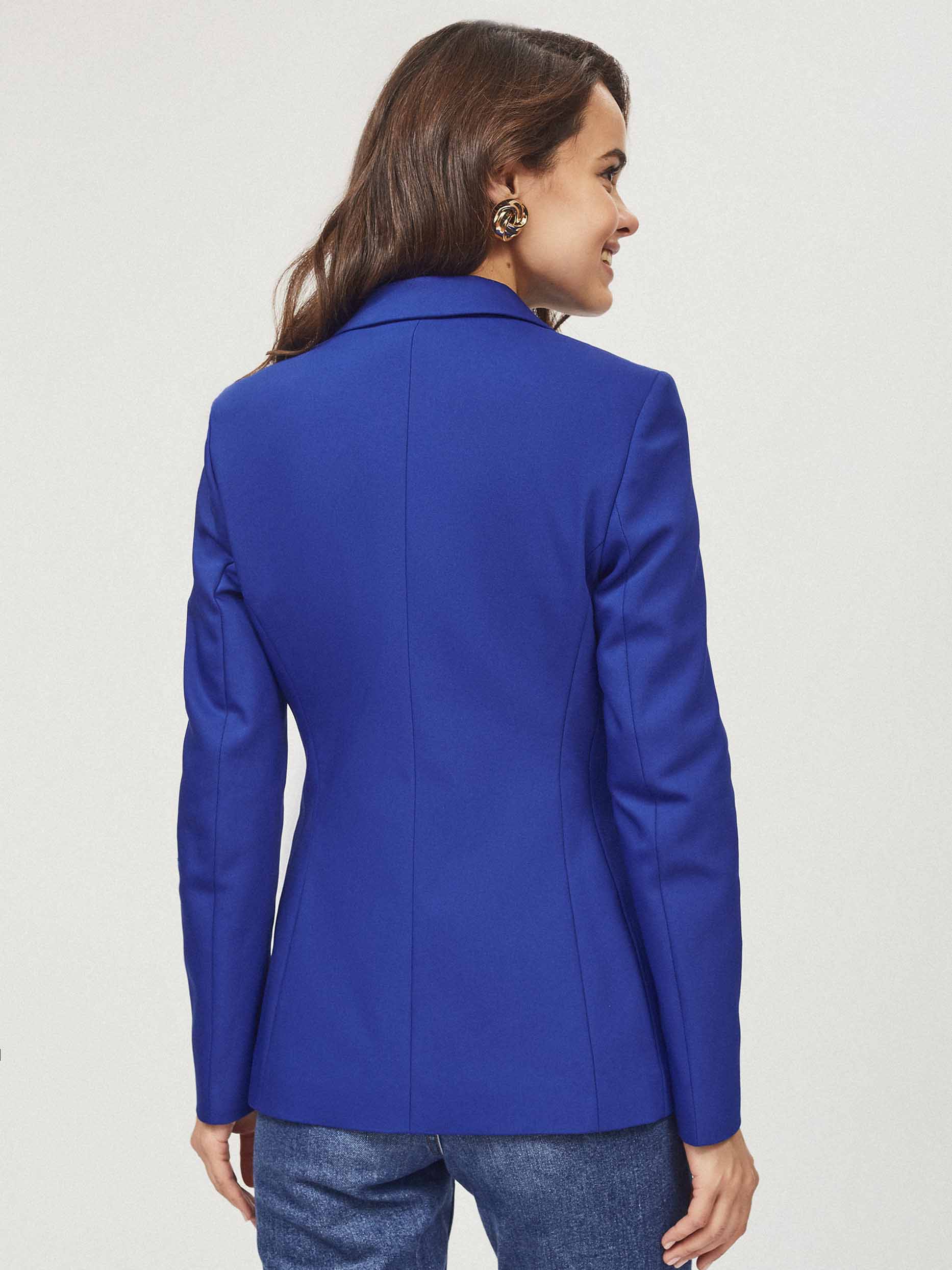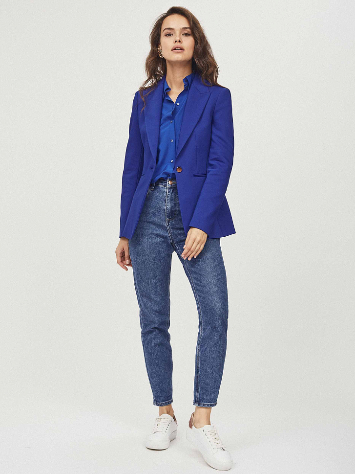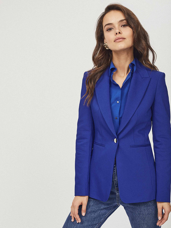 Приталенный однобортный жакет, выполненный из смесового хлопка. Лацканы, длинные рукава. Застегивается на металлическую глянцевую пуговицу. Изделие на подкладке.