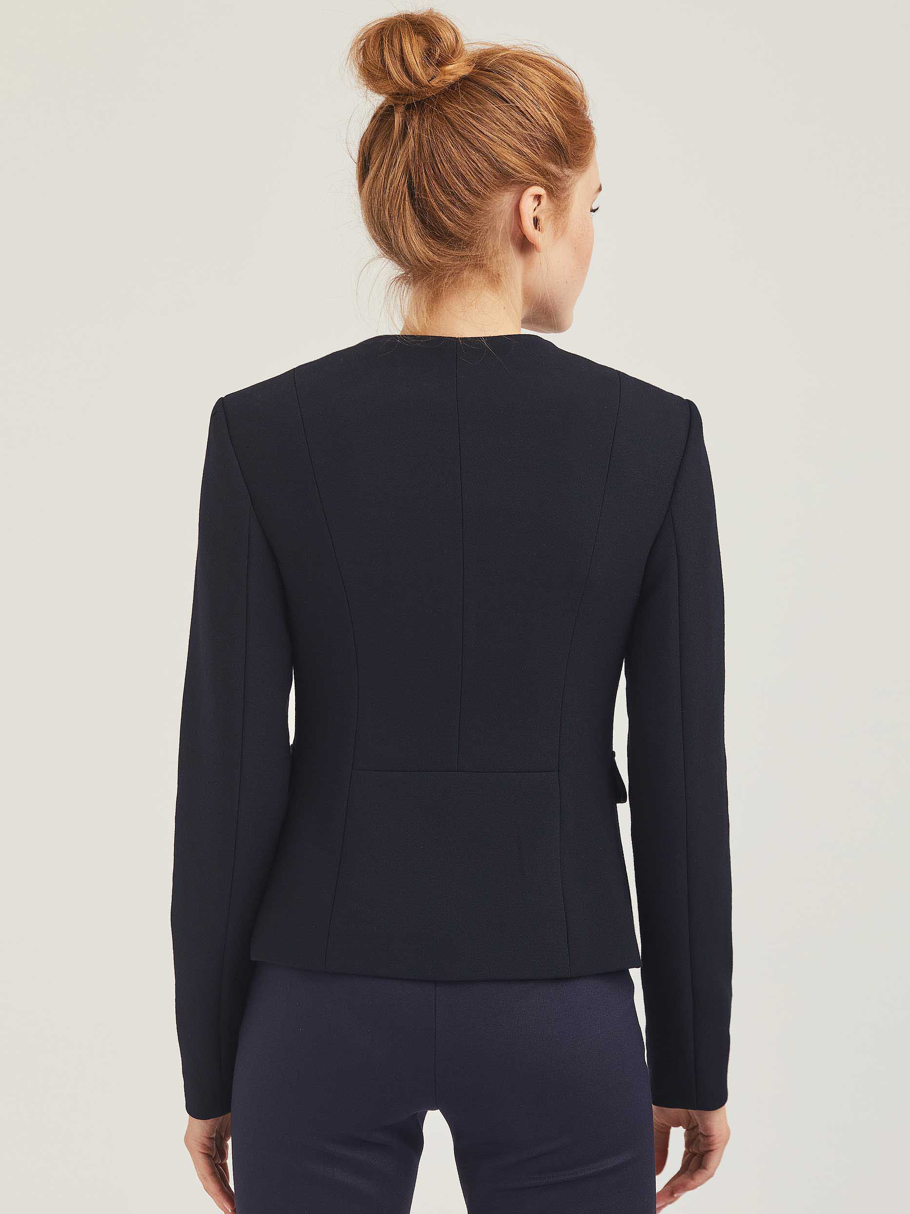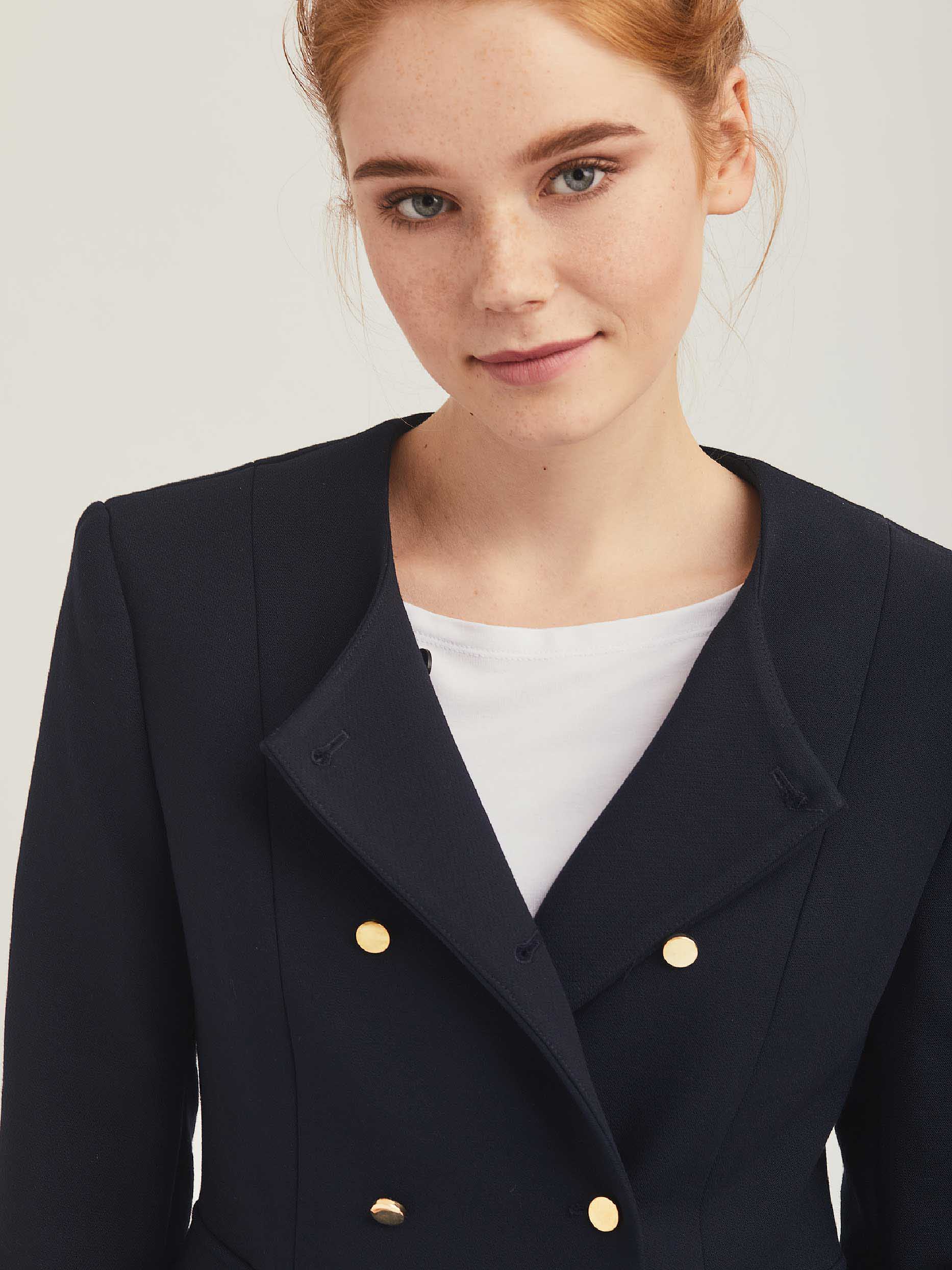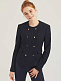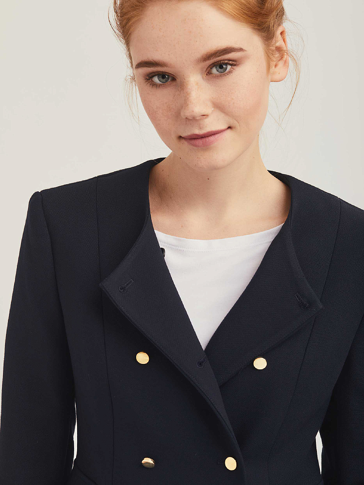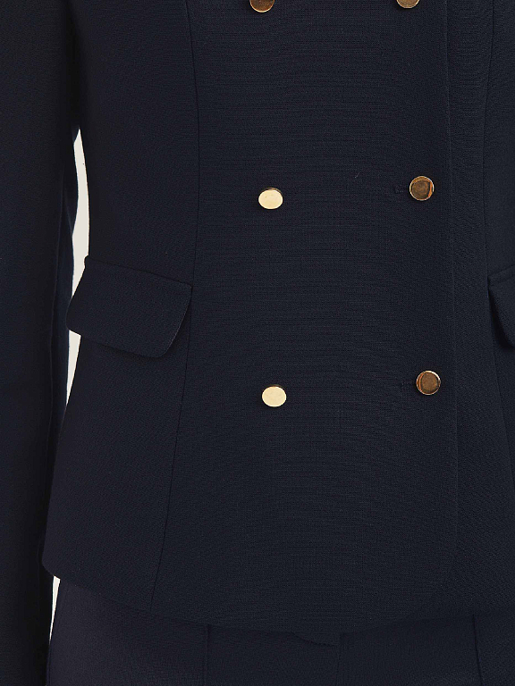 Двубортный жакет приталенного кроя. Округлый вырез, декоративные карманы с клапанами, двубортная застежка на металлические пуговицы. Изделие на подкладке.