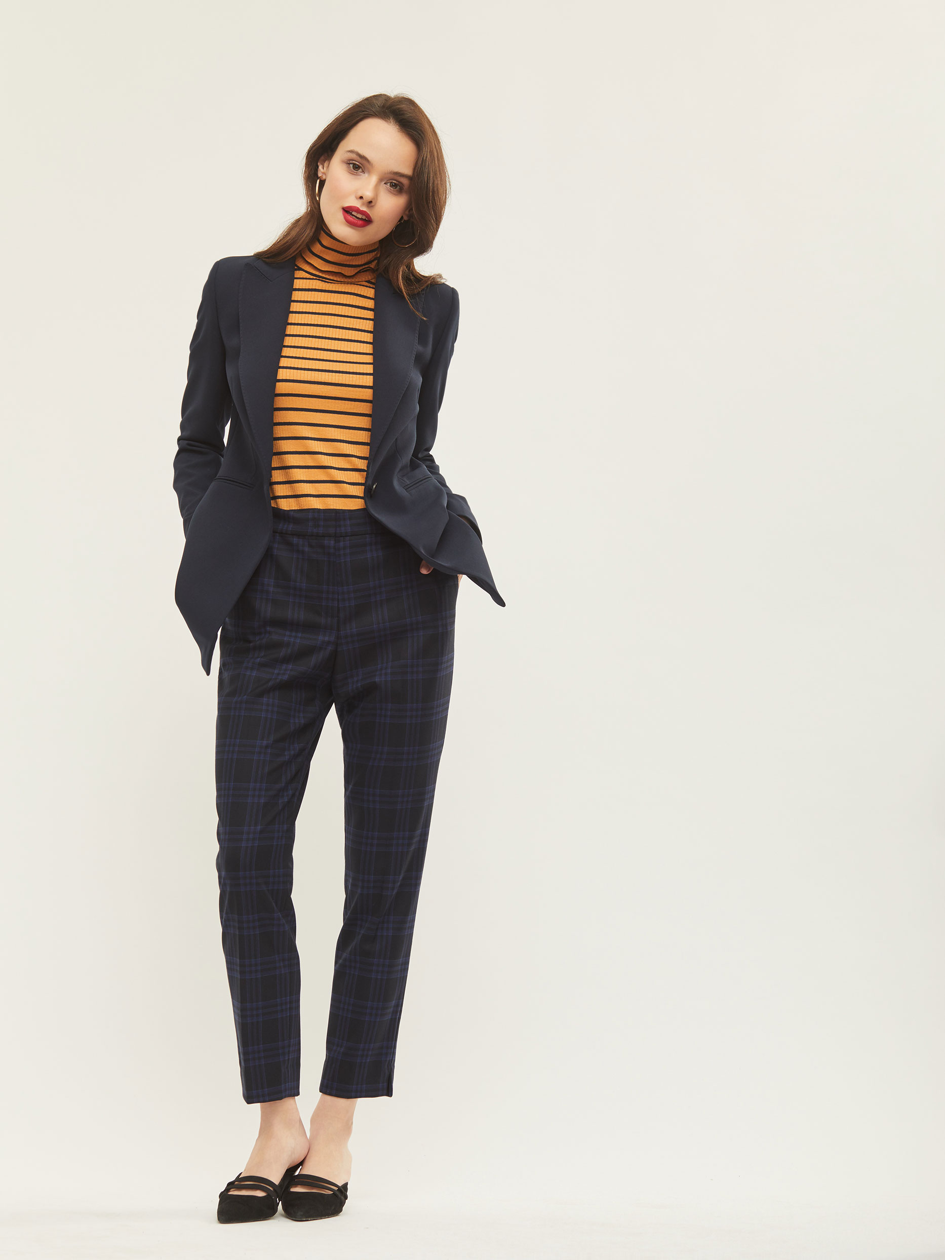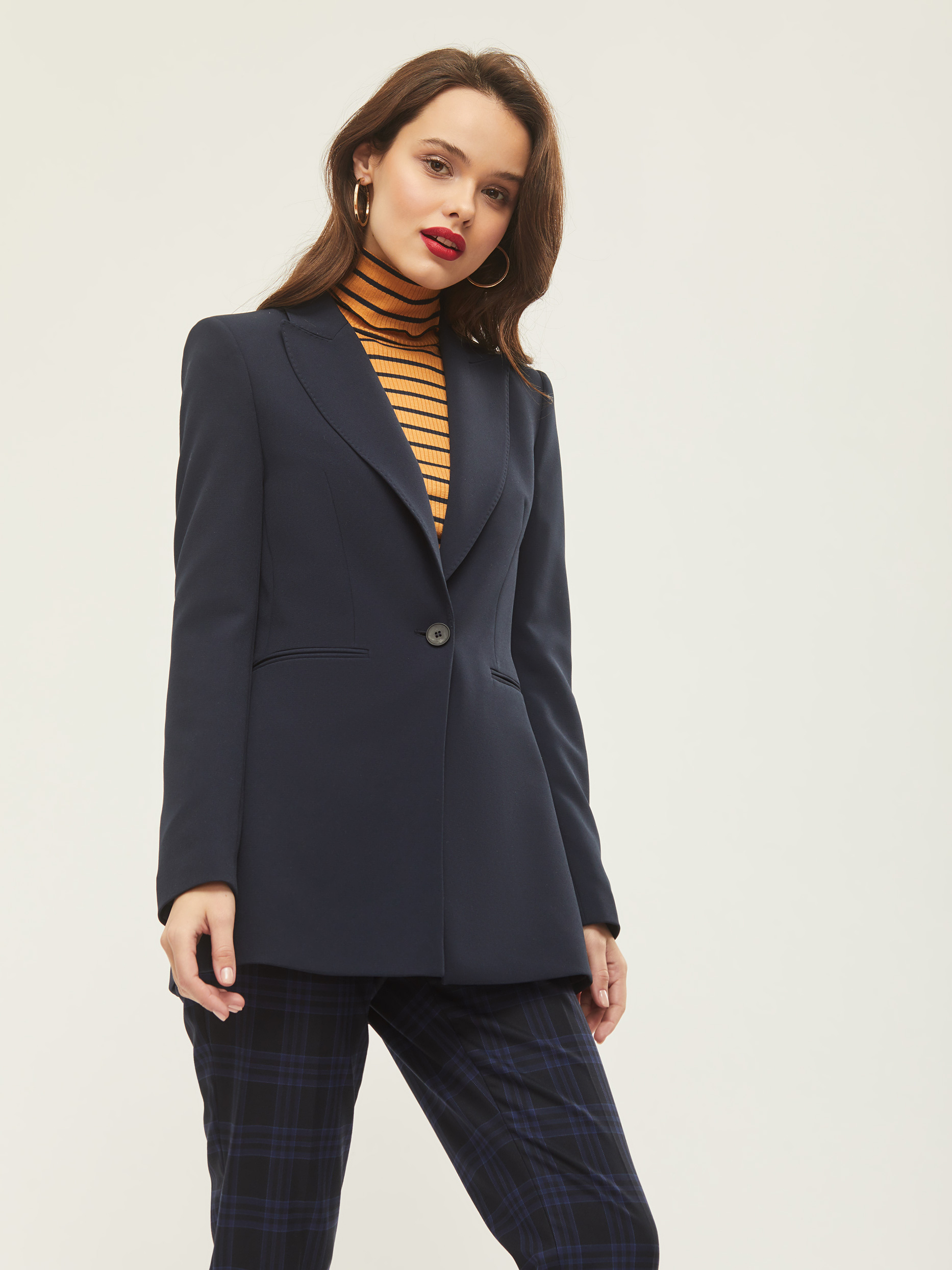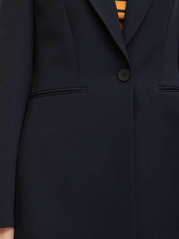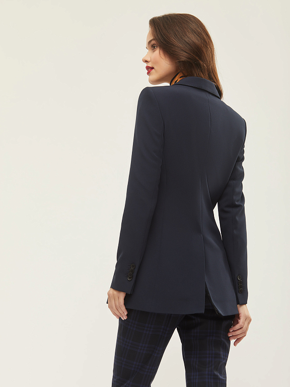 Удлиненный жакет приталенного силуэта. Воротник с остроконечными лацканами. Длинные рукава, манжеты с пуговицами. Изделие с ложными карманами с листочкой. Застежка на одну пуговицу, сзади разрез. Силуэт подчёркнут тонкими подплечниками. Изделие на подкладке.  Рост модели 173 см, размер 42 (российский). Плотность ткани: 250 г/м2