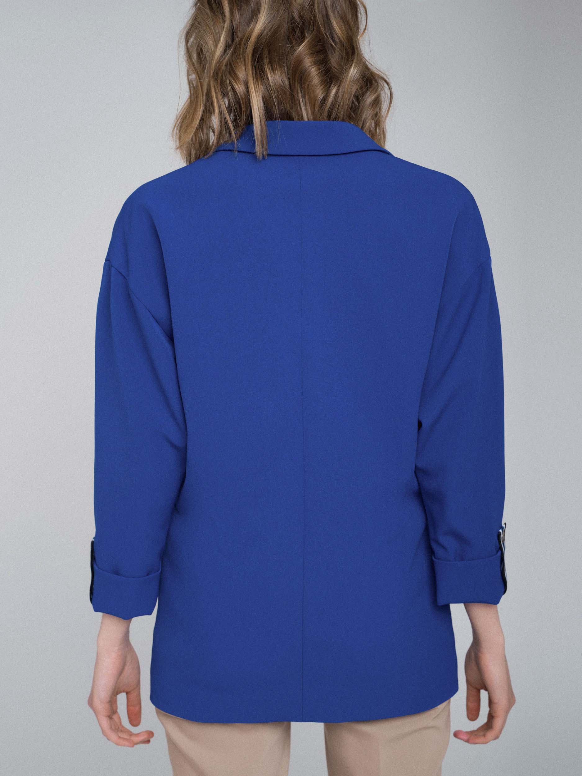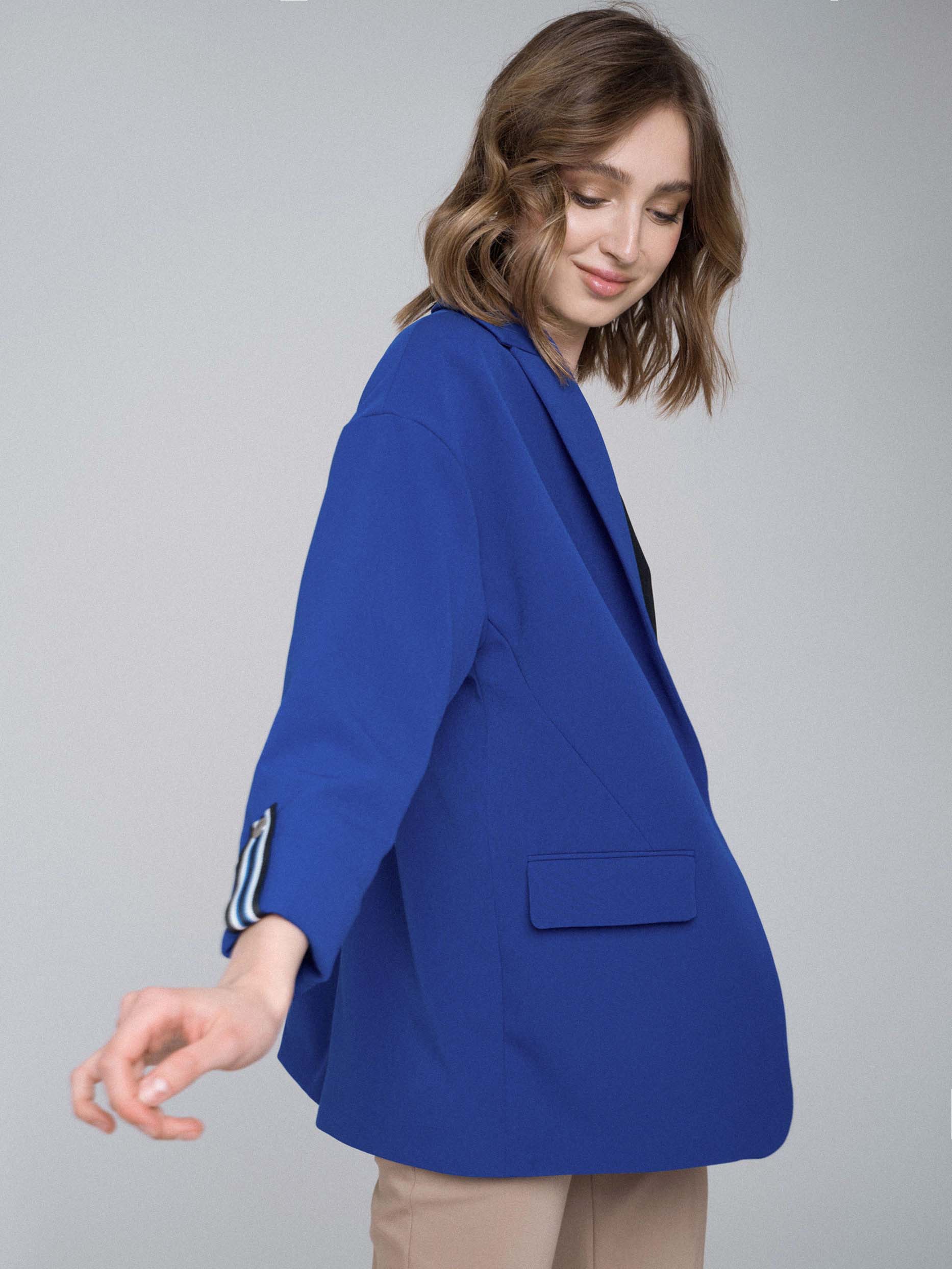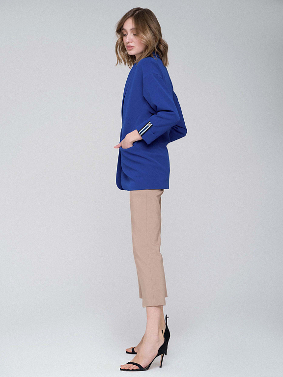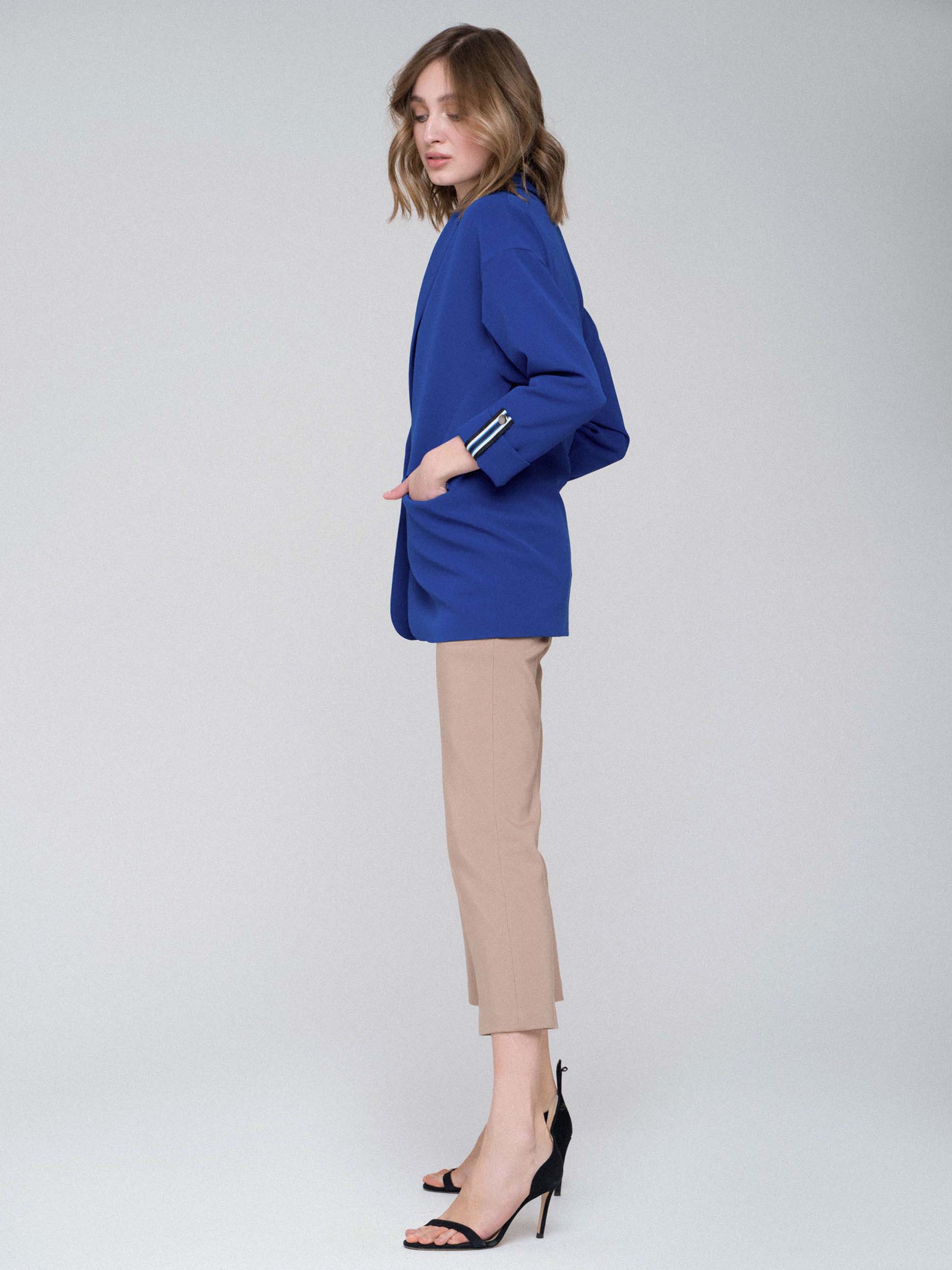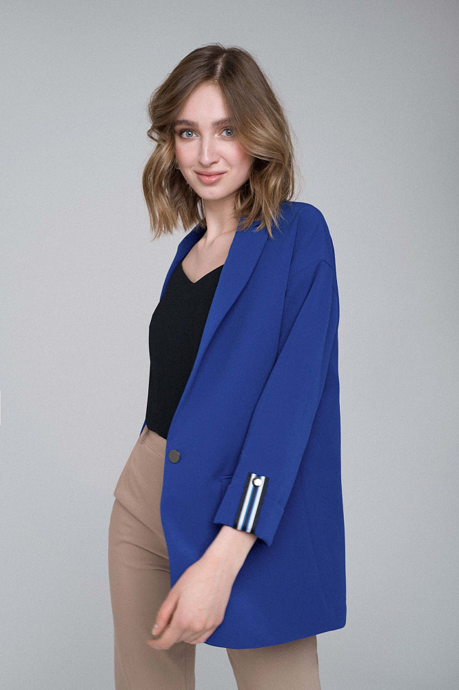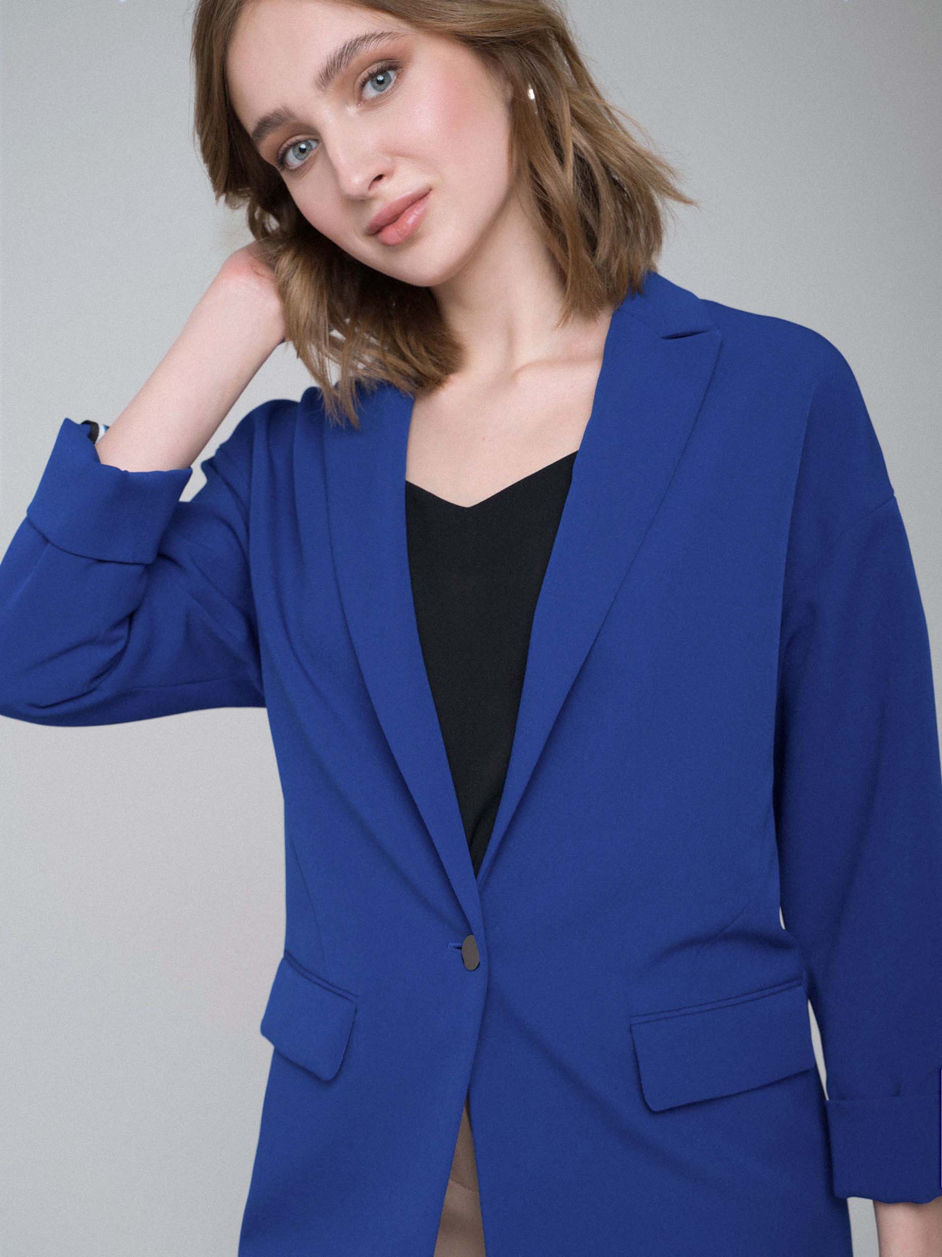 Удлиненный жакет oversize с  воротником и лацканами.  Застёжка на металлическую  пуговицу. Изделие с прорезными  карманами с клапанами спереди.  Изделие на подкладке. Рост модели 176  см, размер 42 (российский)