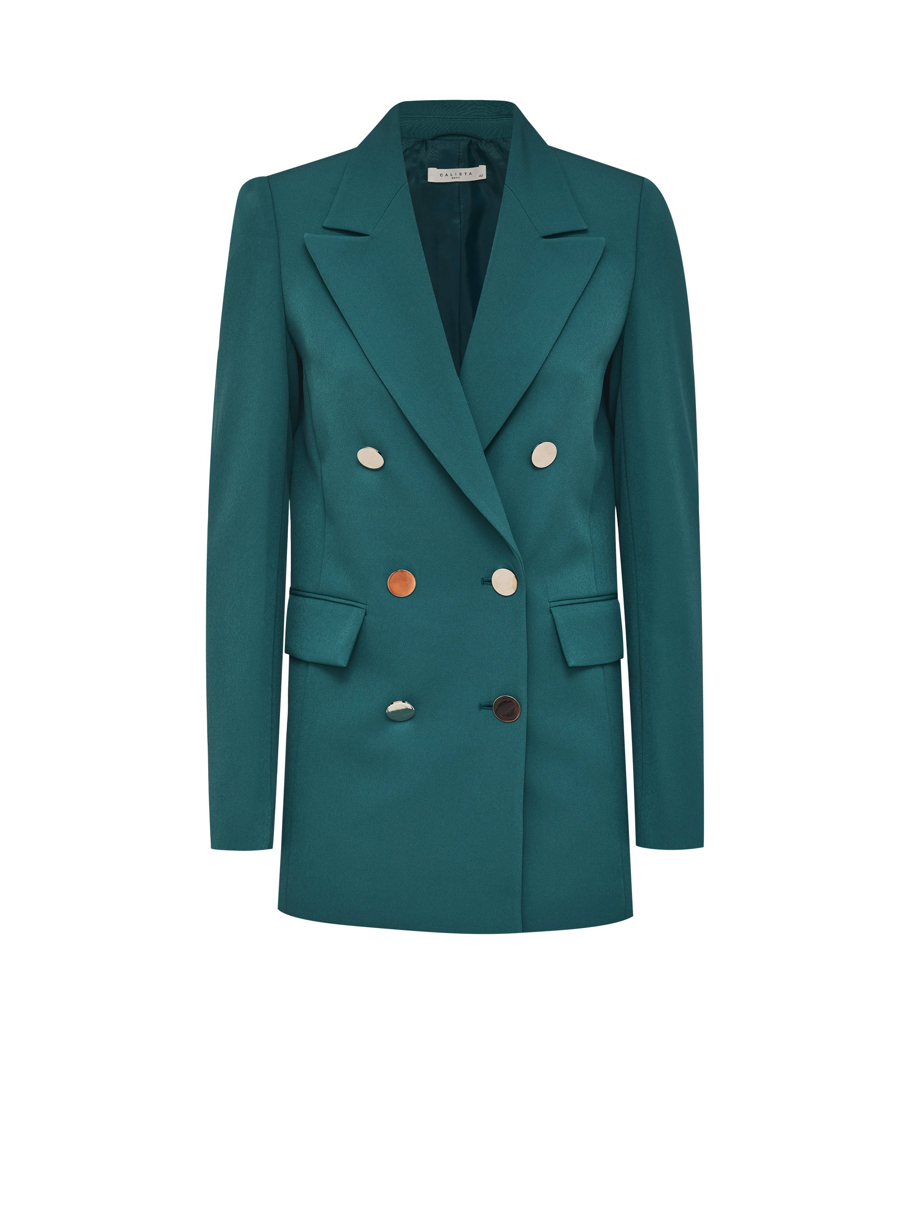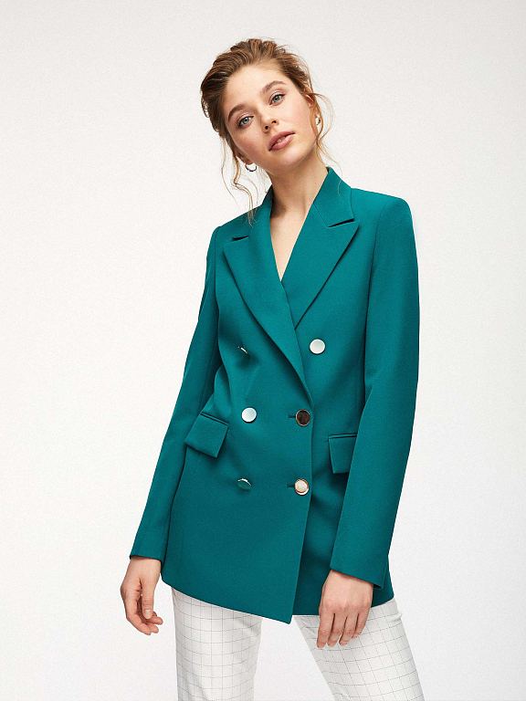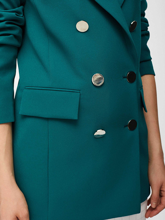 Удлиненный двубортный жакет приталенного кроя. Прорезные карманы с клапанами, лацканы, шлица. Застегивается на два ряда крупных металлических пуговиц. Изделие на подкладке.