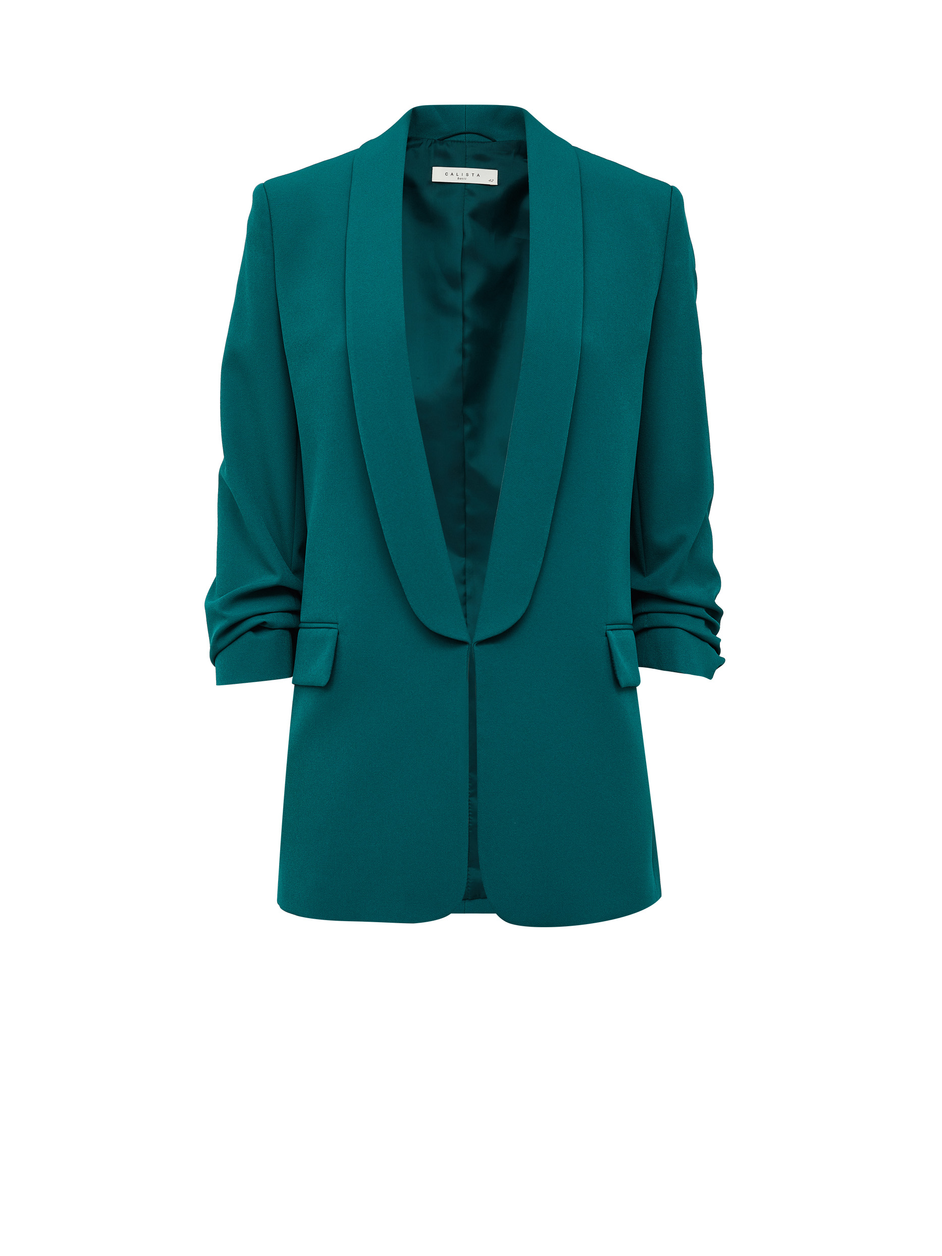 Удлиненный жакет с рукавами длиной 3/4 с драпировкой. Декоративные карманы с клапанами.