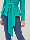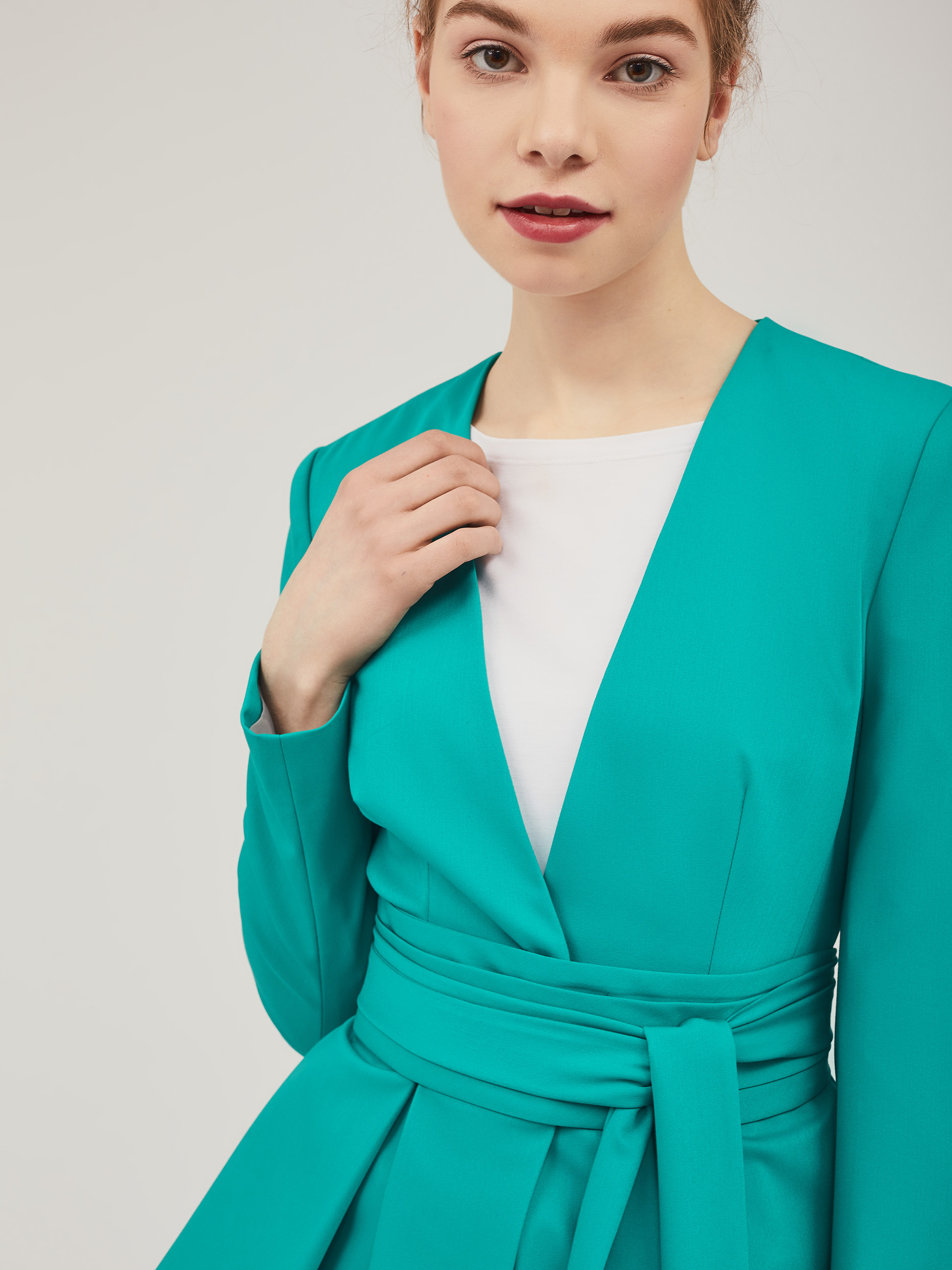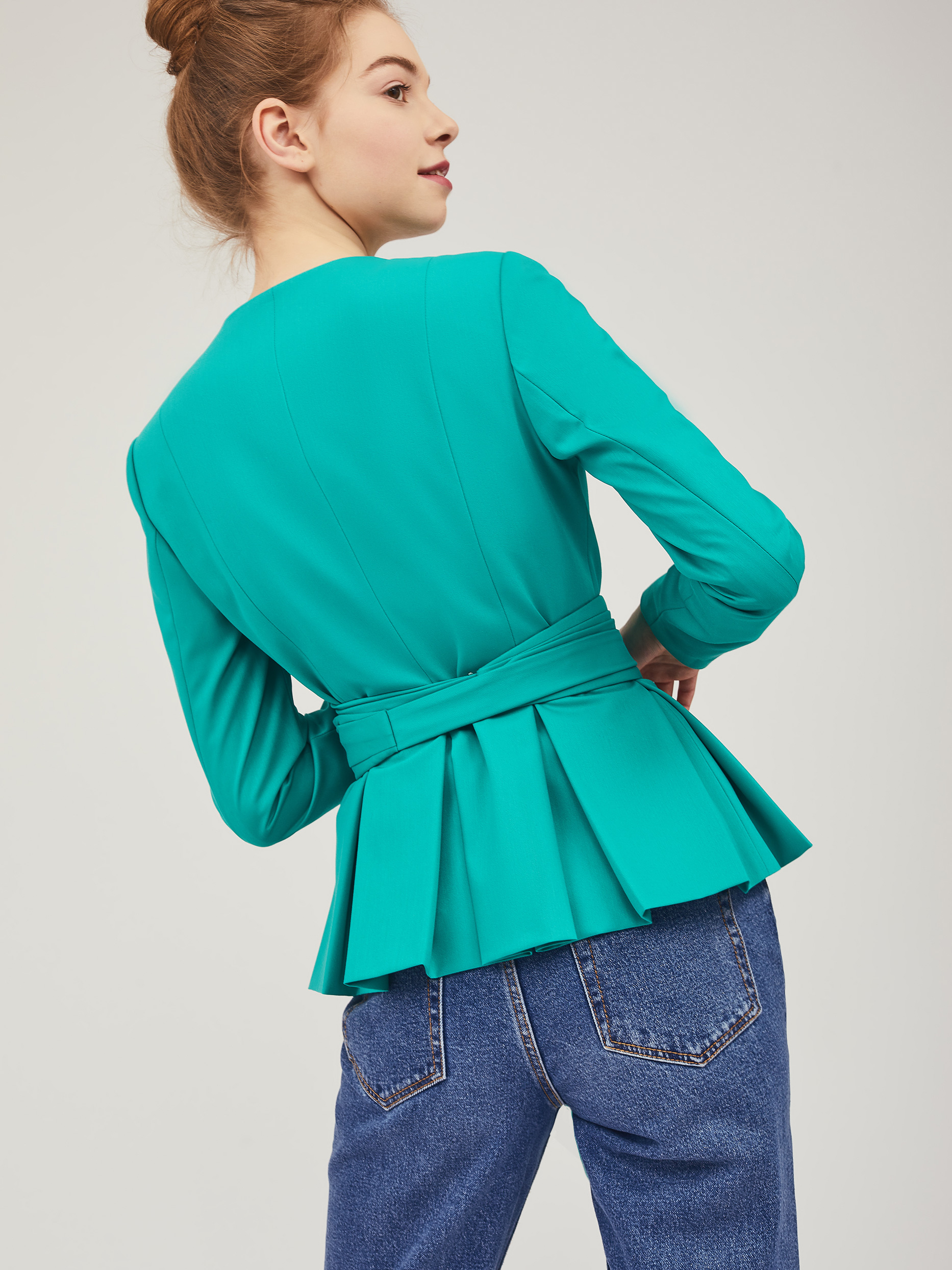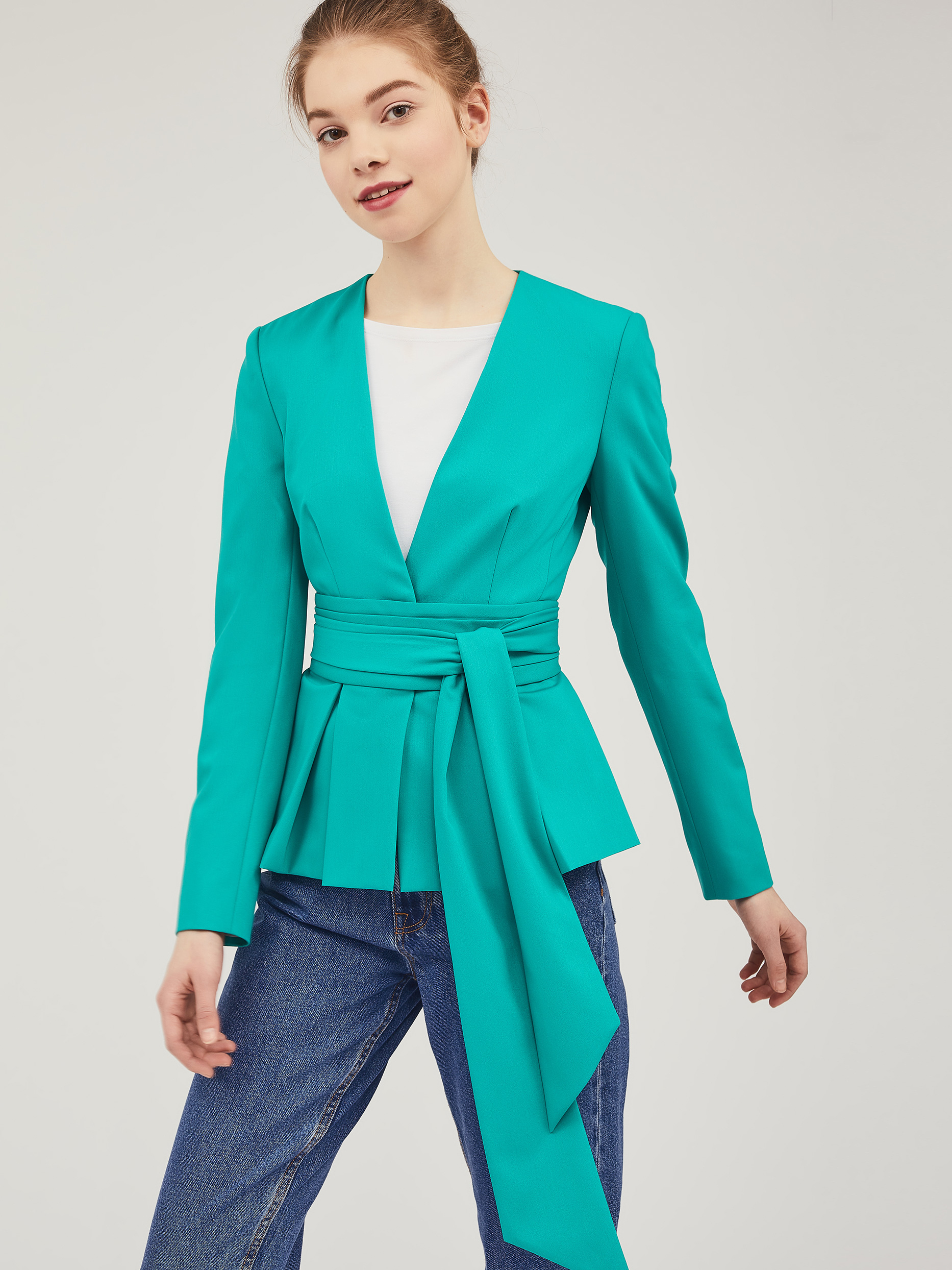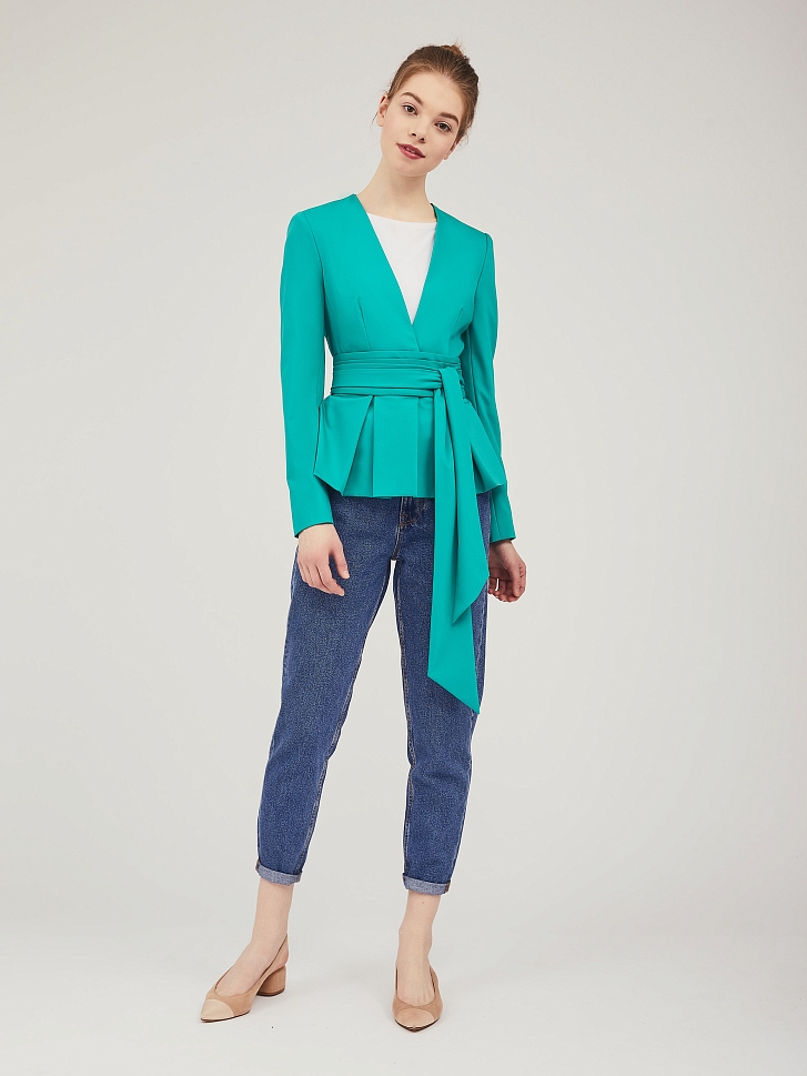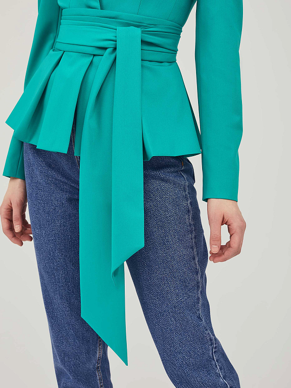 Однобортный жакет приталенного силуэта с V-образным вырезом.  Жакет с баской с заложенными складками. Застёжка на потайные кнопки. Изделие с длинными рукавами и завязывающимся поясом. Силуэт подчёркнут тонкими подплечниками. Изделие на подкладке.  Рост модели 176 см, размер 42 (российский)