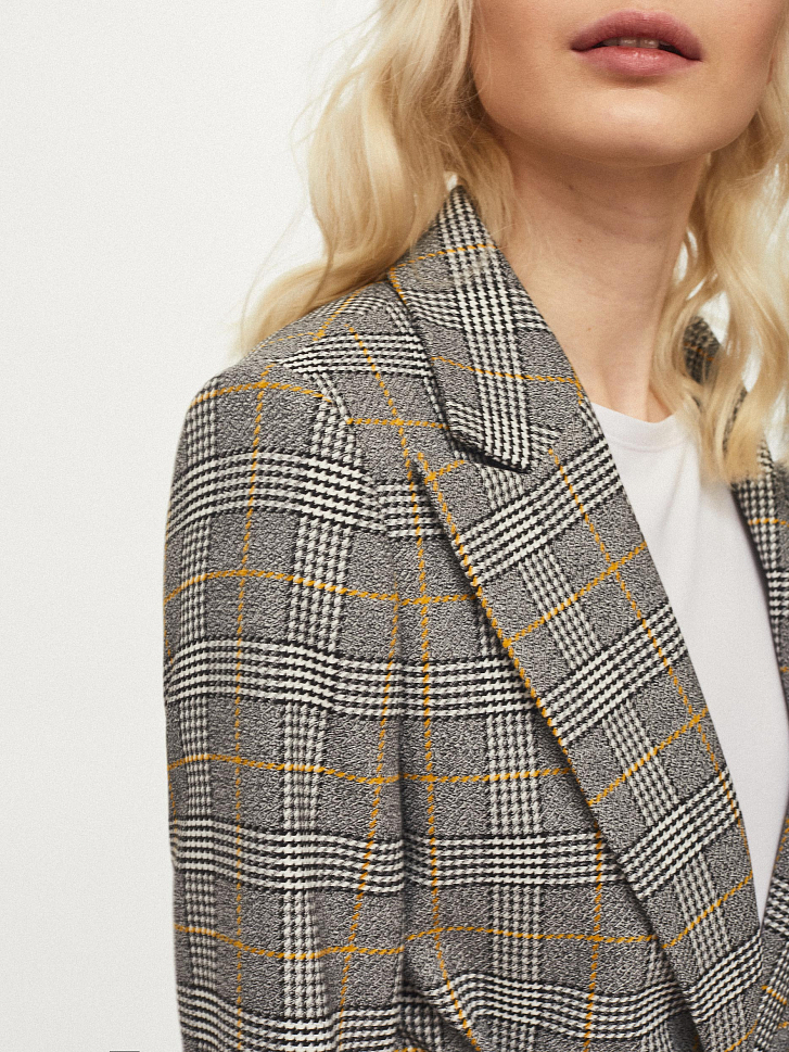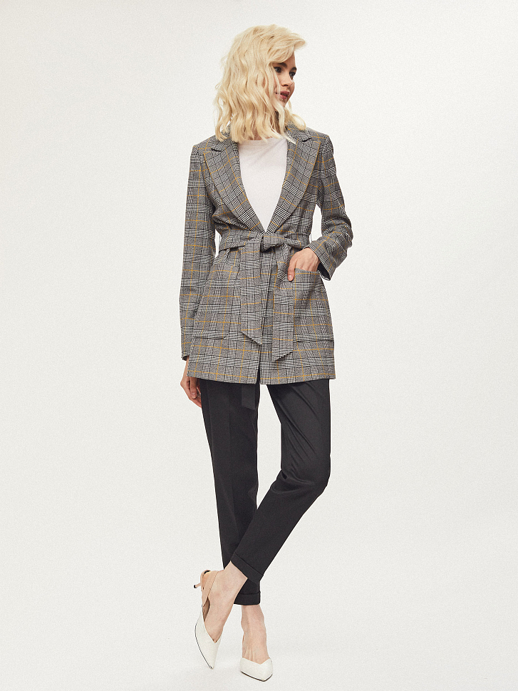 Удлиненный жакет прямого кроя. Пояс-хомут из этой же ткани, крупные накладные карманы, шлица. Изделие на подкладке.
