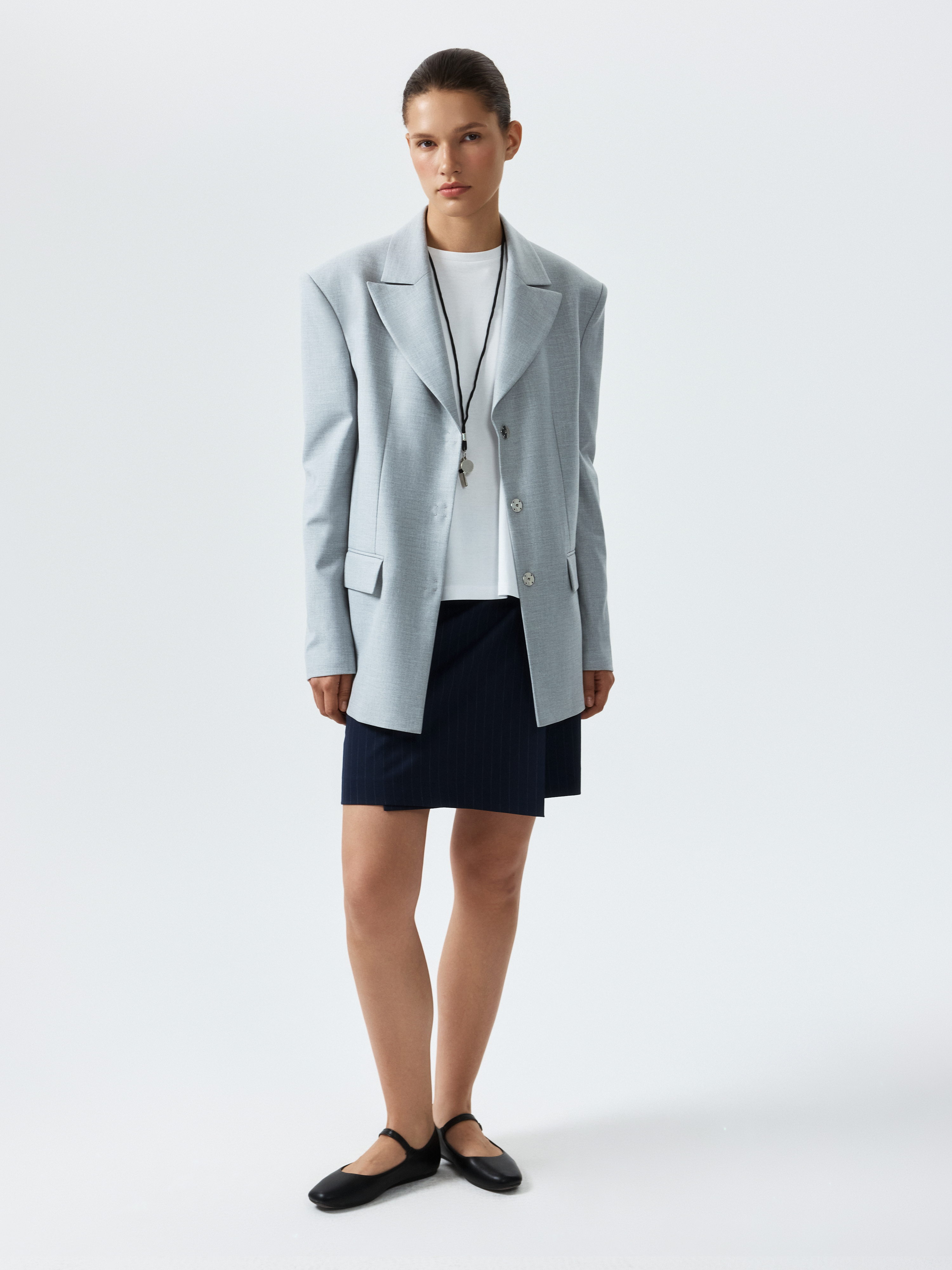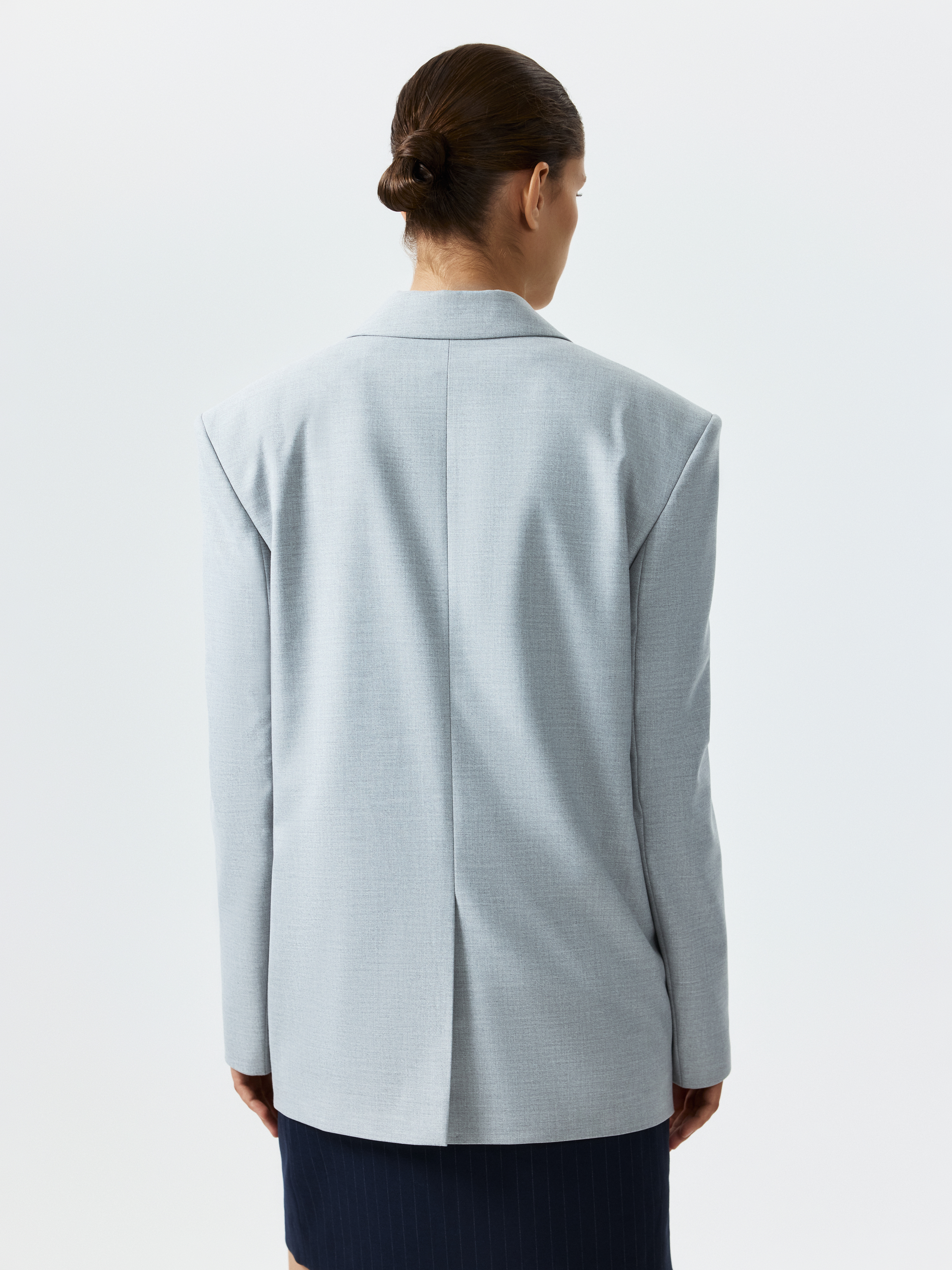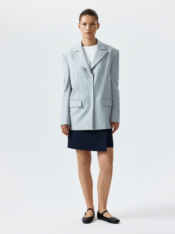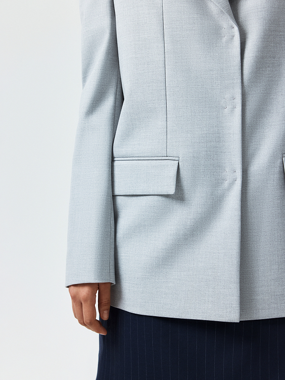 Прямой однобортный жакет умеренного объема превосходно сидит на плечах, а застежка на кнопки придает дополнительную расслабленность. Плотный текстиль из поливискозы не тянется и хорошо держит форму. Лаконичный жакет без лишних деталей – та самая классика вне времени.