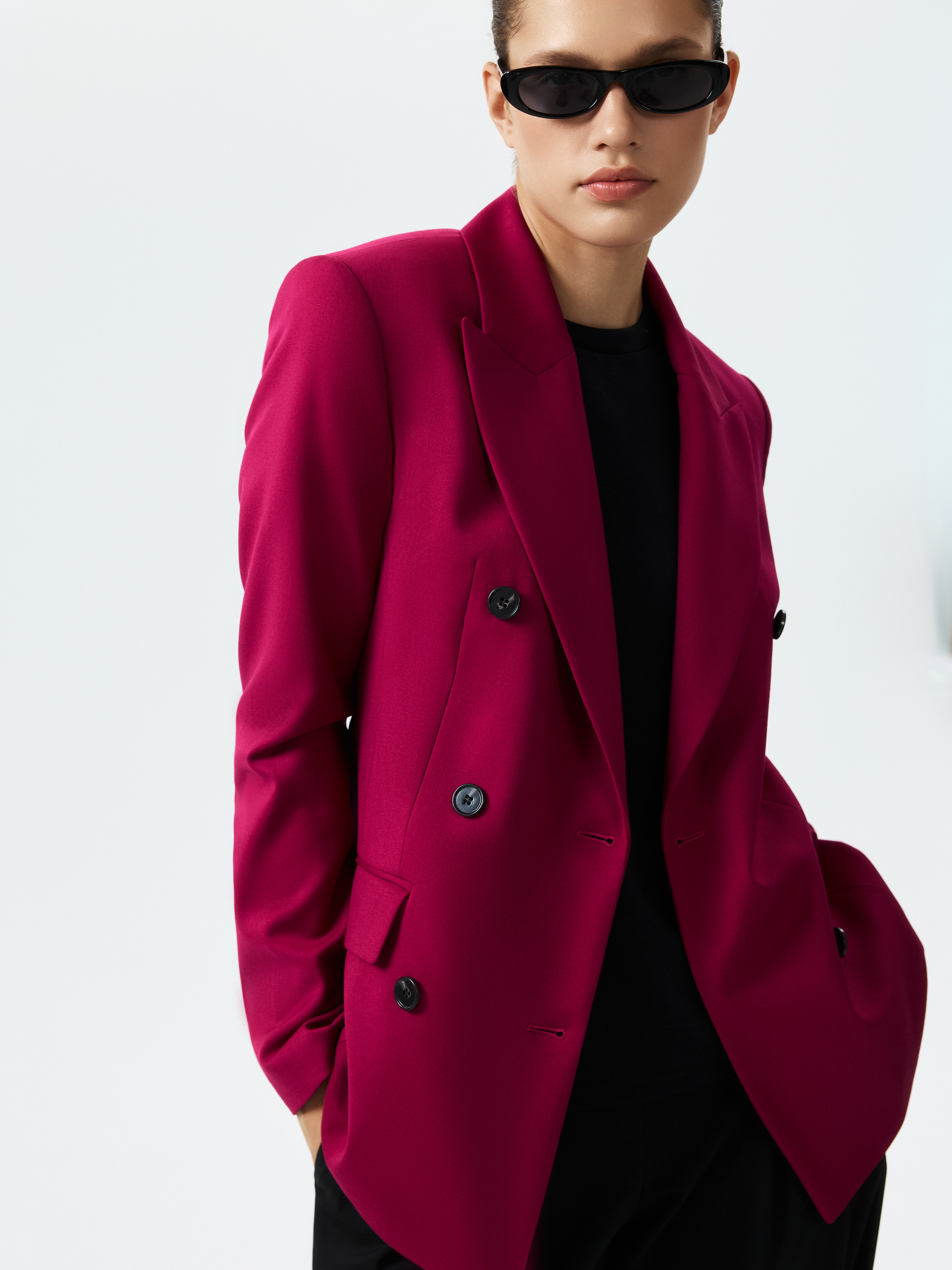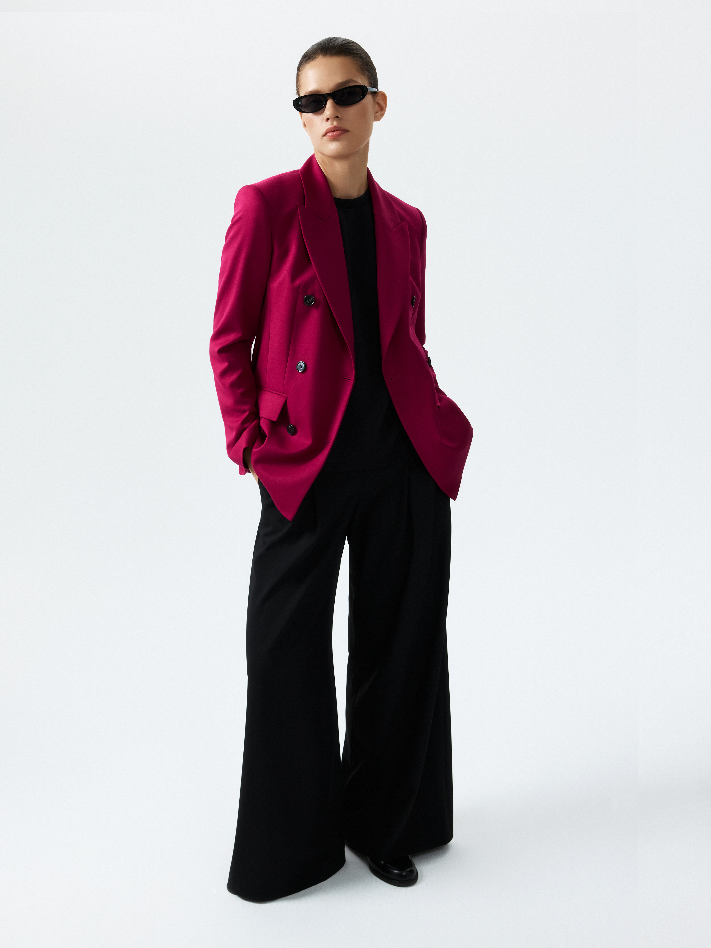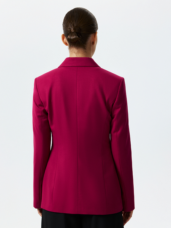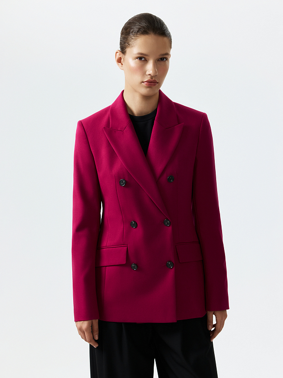 Двубортный жакет приталенного кроя создаст утонченный и женственный образ в деловом стиле. Костюмный текстиль средней плотности из поливискозы не тянется и обладает износоустойчивостью, а подплечники и гладкая подкладка создают комфортную посадку по фигуре.