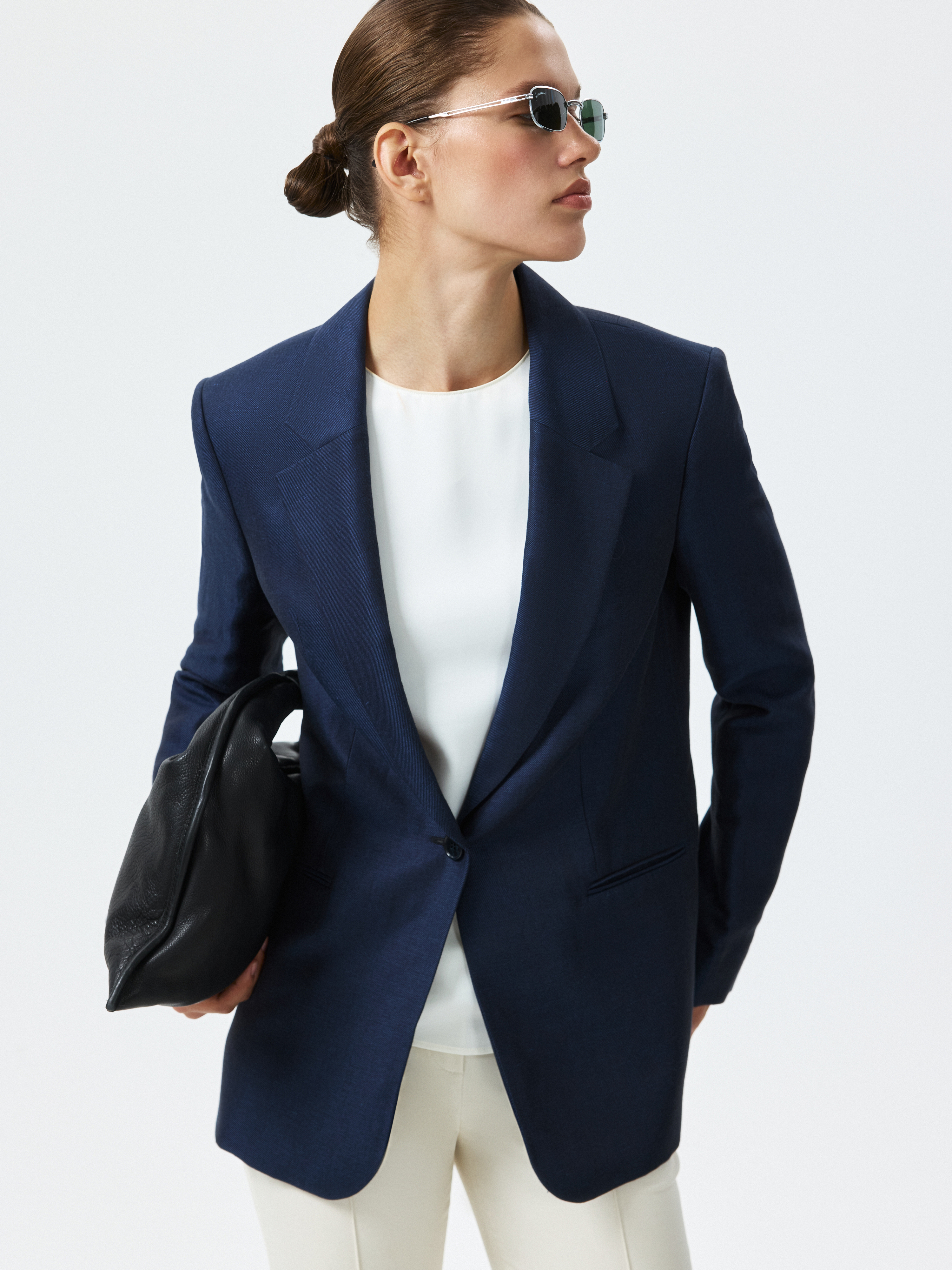 Прямой однобортный жакет – незаменимая база в любое время года. Плотный текстиль наполовину состоит из натурального льна, который не тянется и хорошо держит форму, а хлопковая подкладка создает комфортную посадку. Сочетайте с парными брюками (0-53705_50129) или денимом.