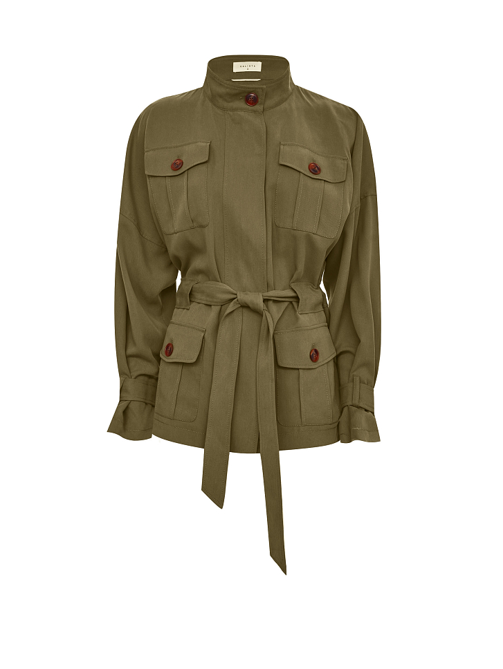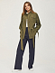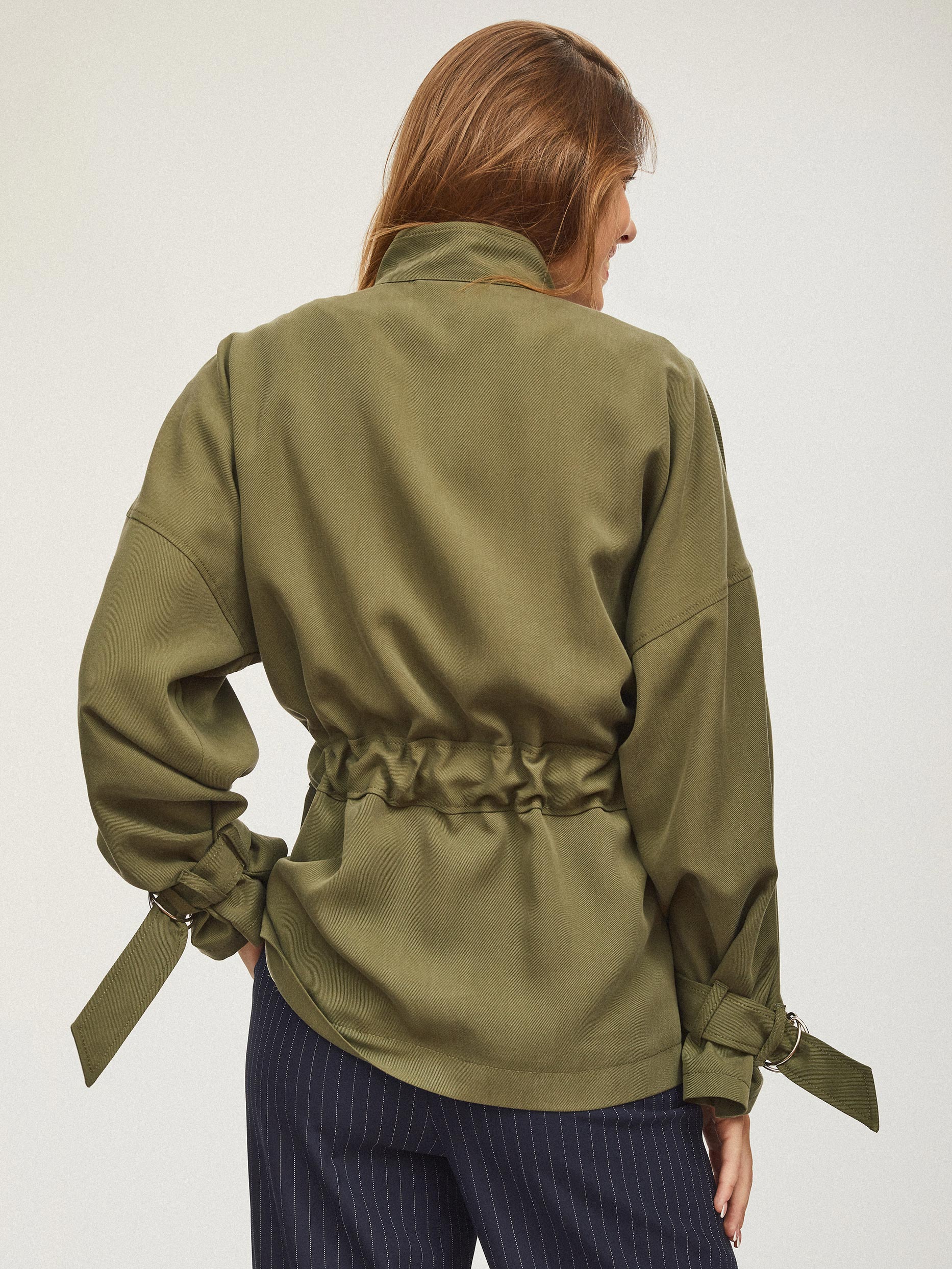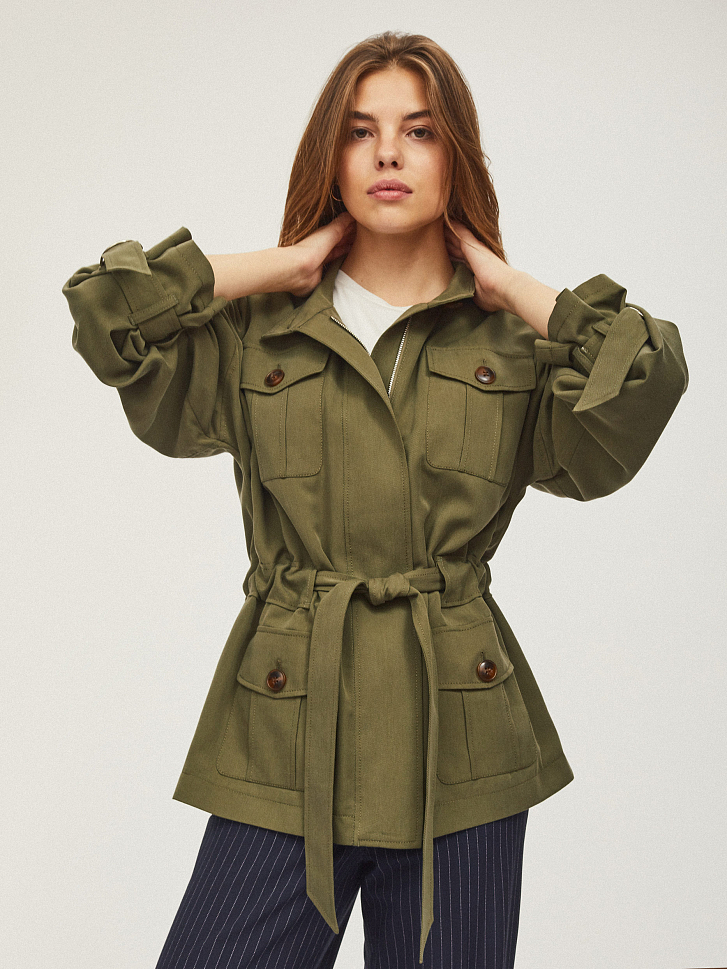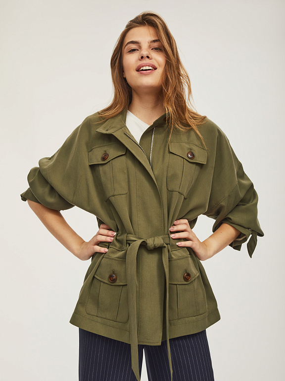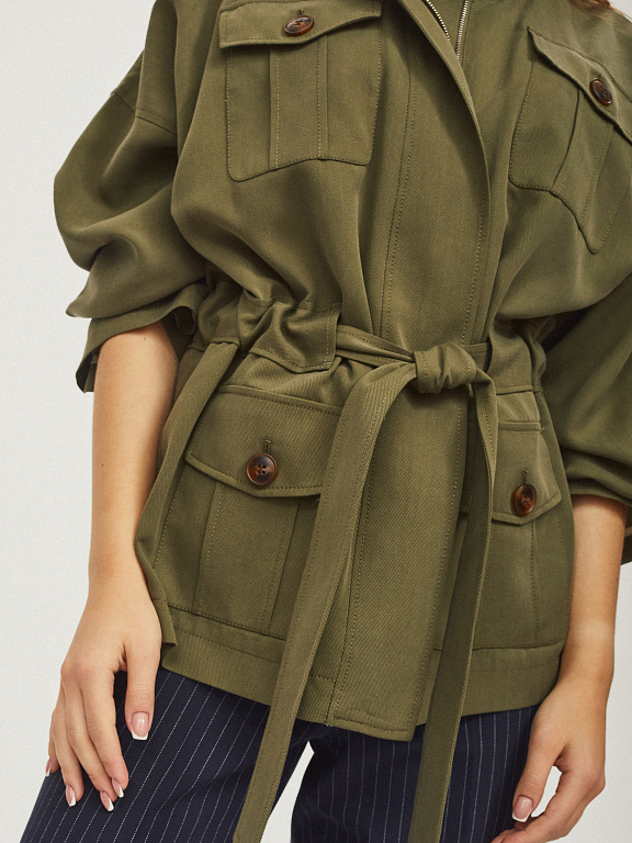 Свободный жакет с крупными накладными карманами. Пояс-хомут, пропущенный через кулиску на талии, спущенная линия плеч, широкие рукава, ремешки на манжетах в тон основной ткани, воротник-стойка. Застегивается на молнию и крупные пуговицы.