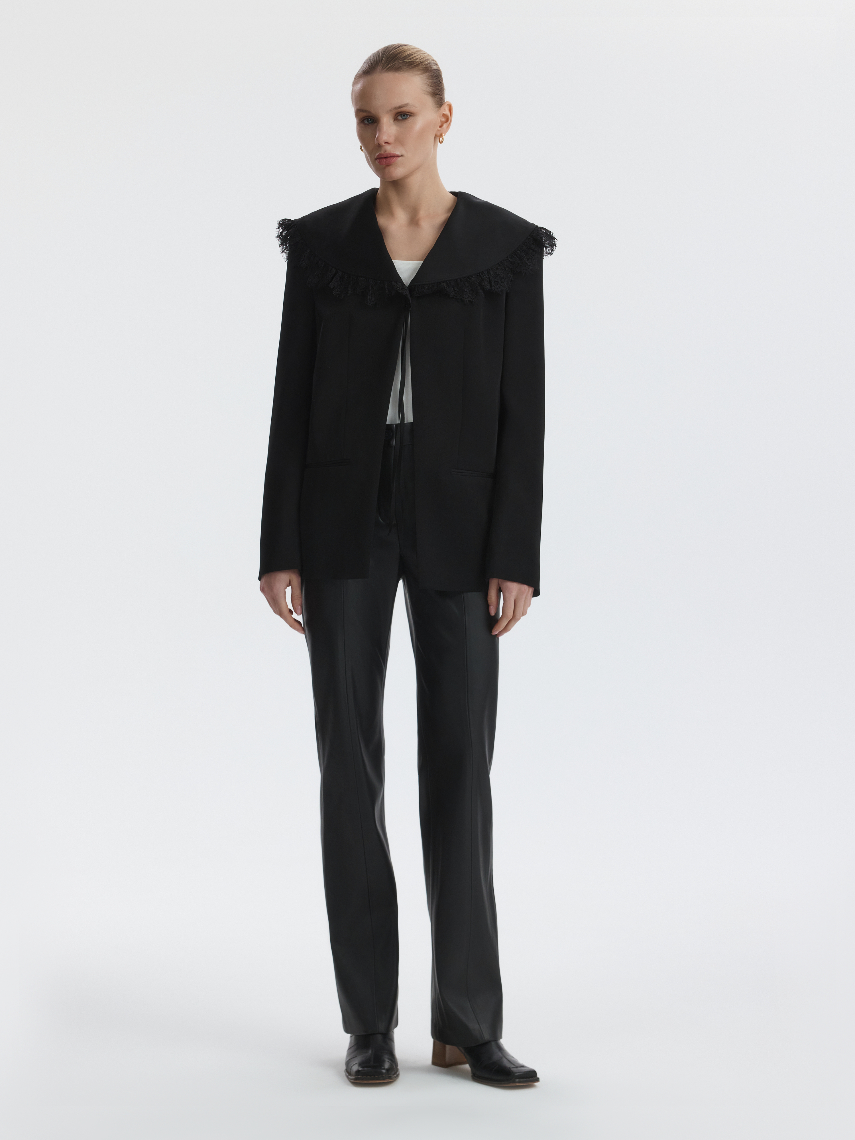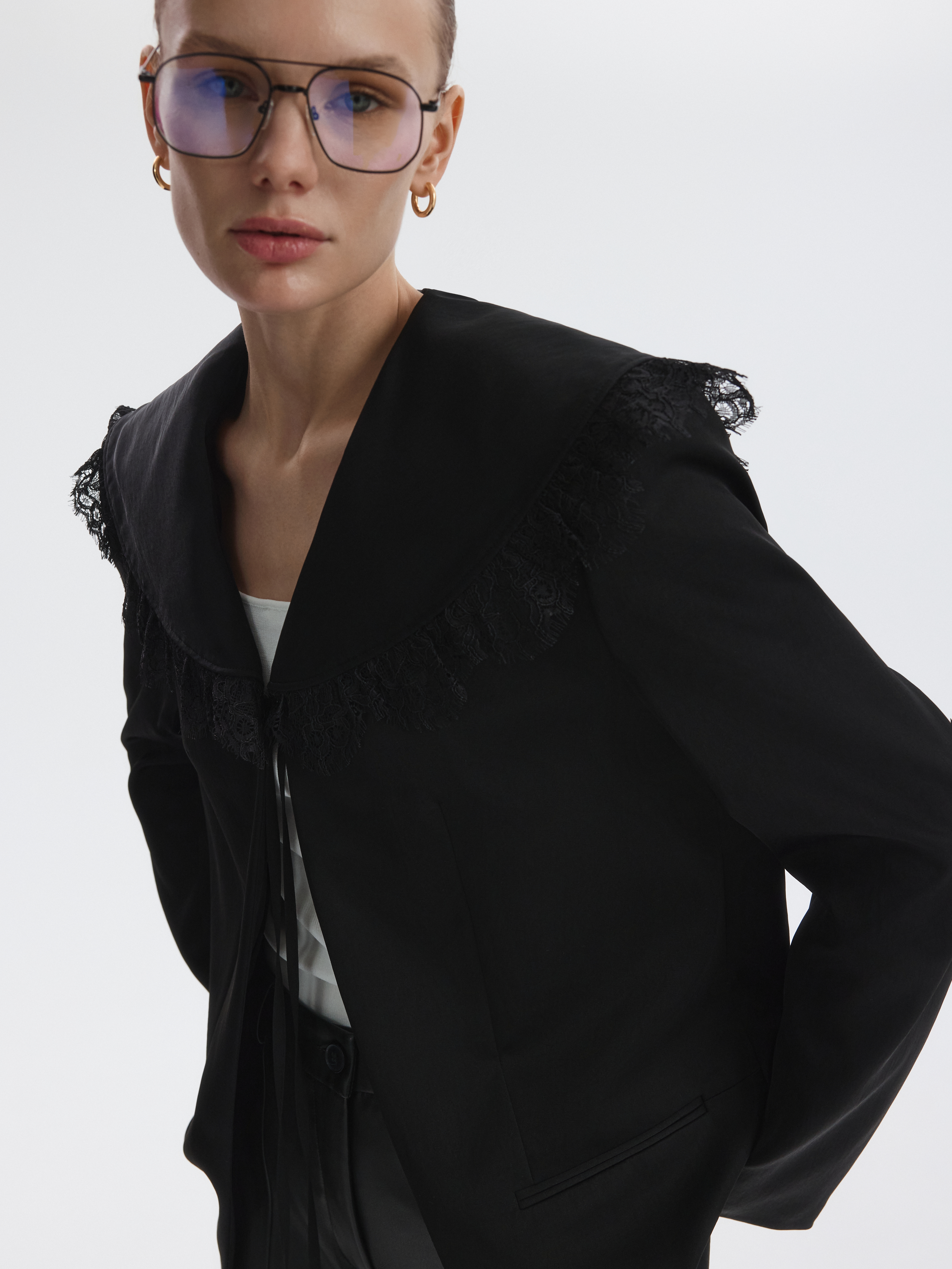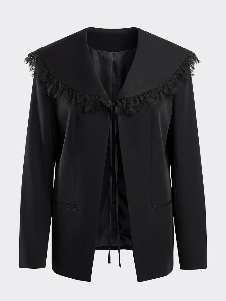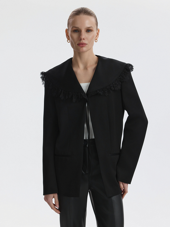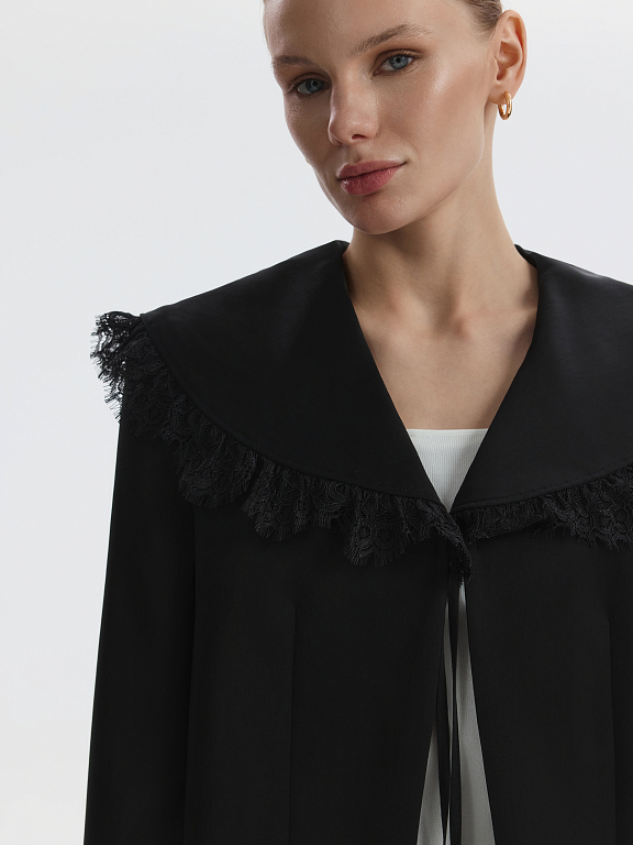 Прямой атласный жакет с V-вырезом впишется в повседневные или в вечерние образы. Плотный шелковистый текстиль не тянется и комфортно прилегает благодаря подкладке. Съемный воротник с кружевом добавит романтичный акцент в строгий силуэт.