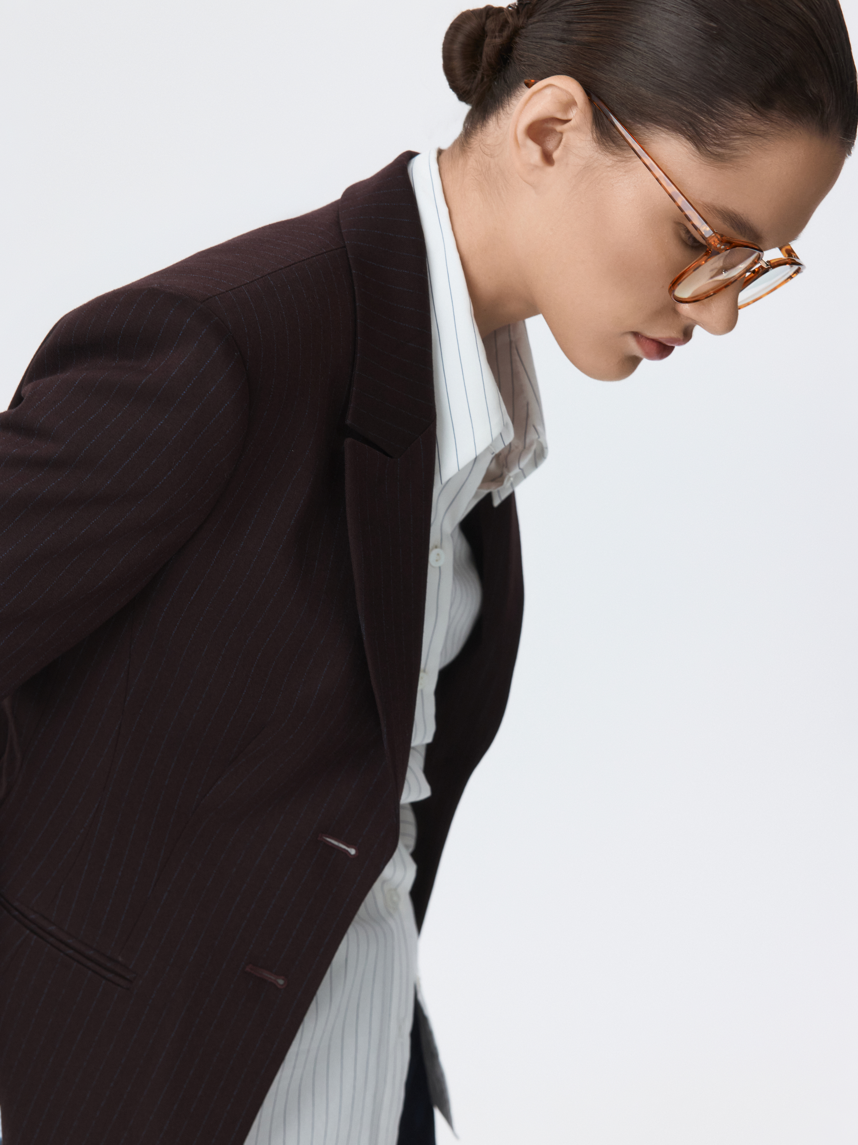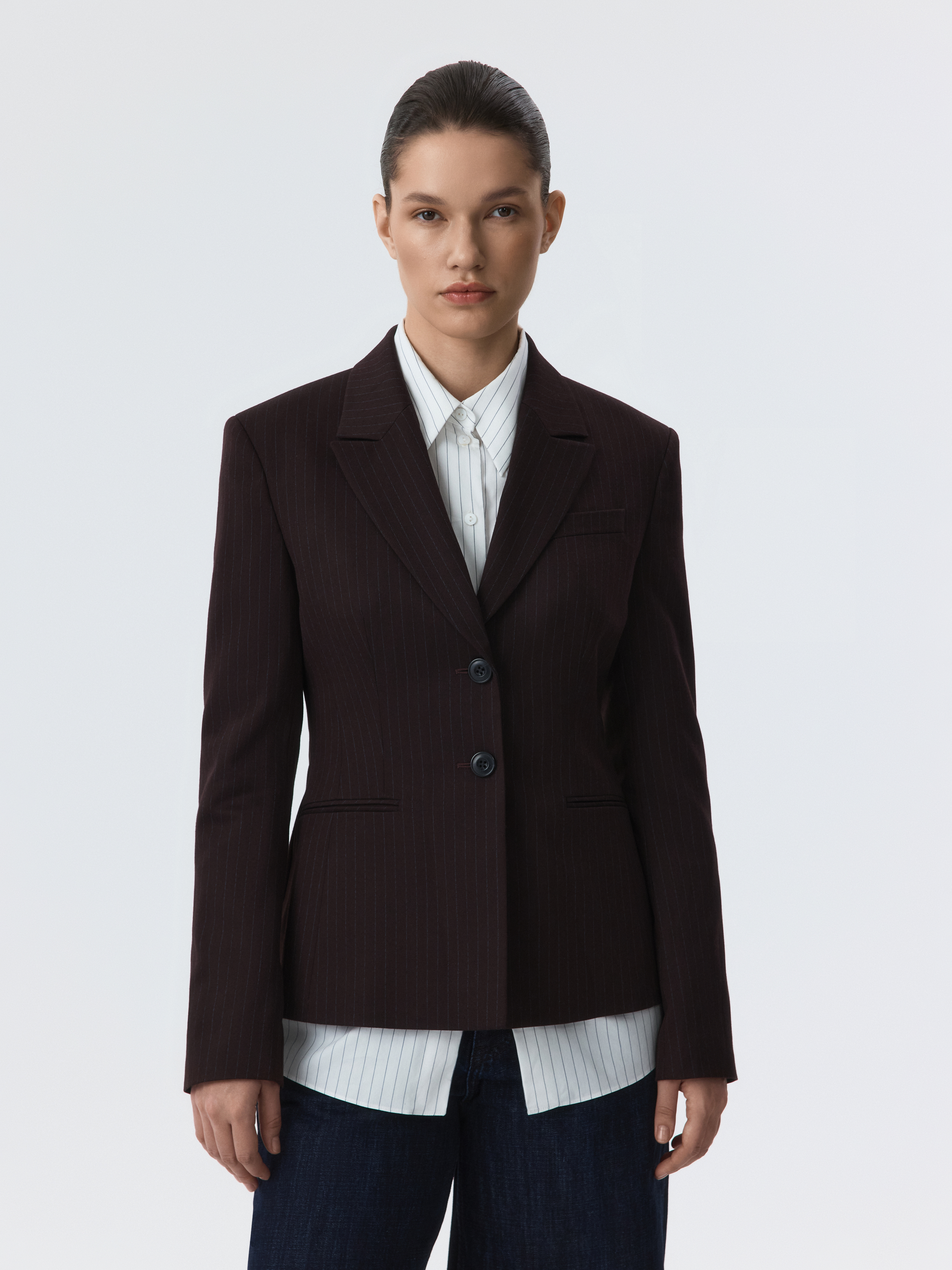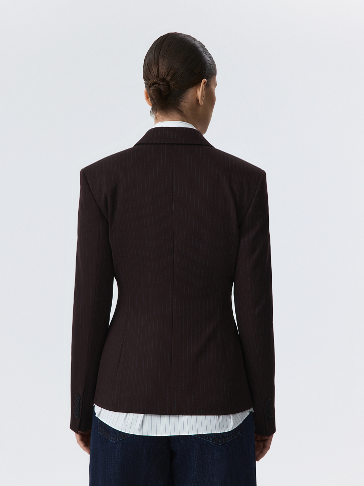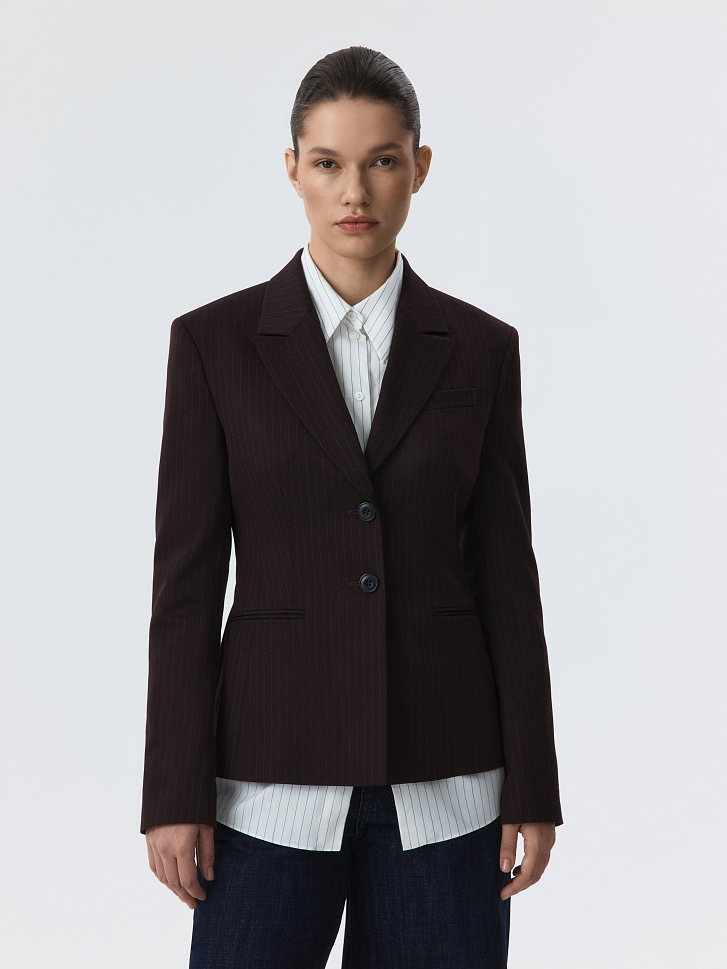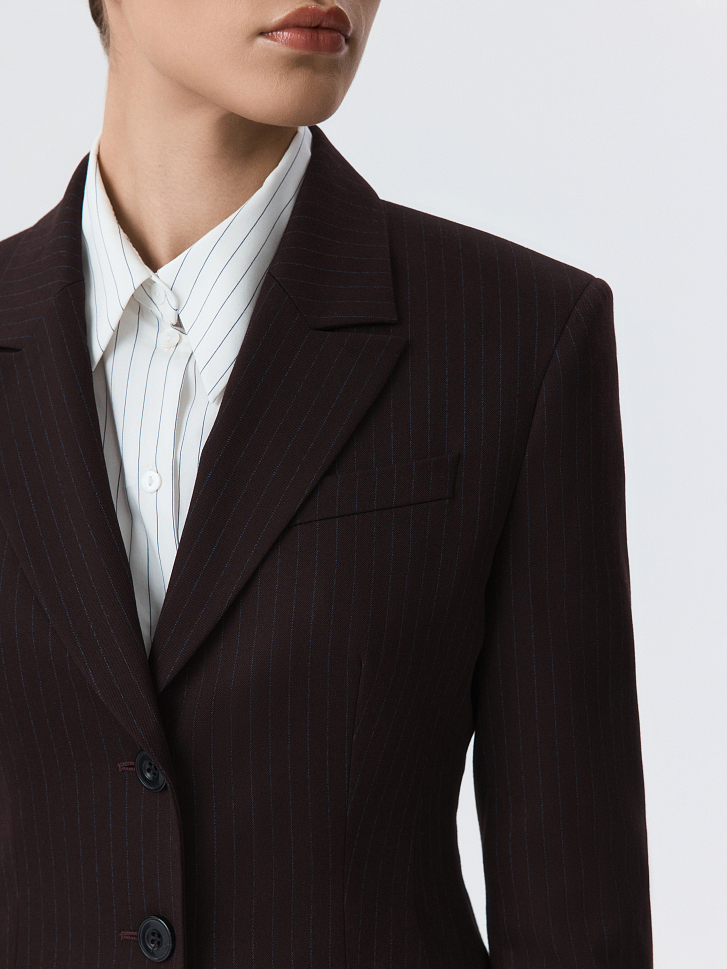 Приталенный однобортный жакет имеет четкий силуэт, а тонкая полоска подчеркивает точность кроя. В меру плотный костюмный текстиль не вытягивается и не требует особого ухода. Стилизуйте с парными брюками или джинсами в любое время года.