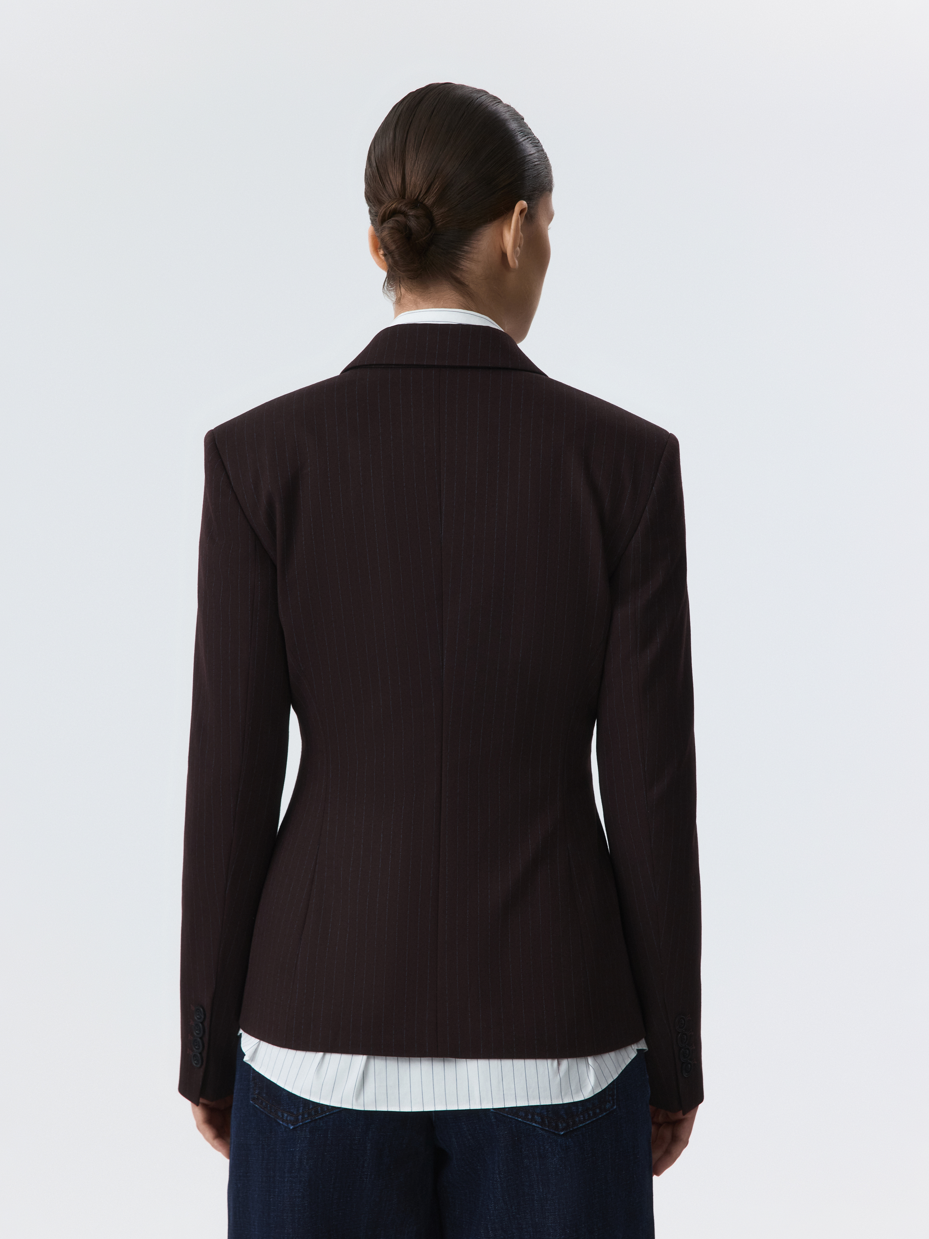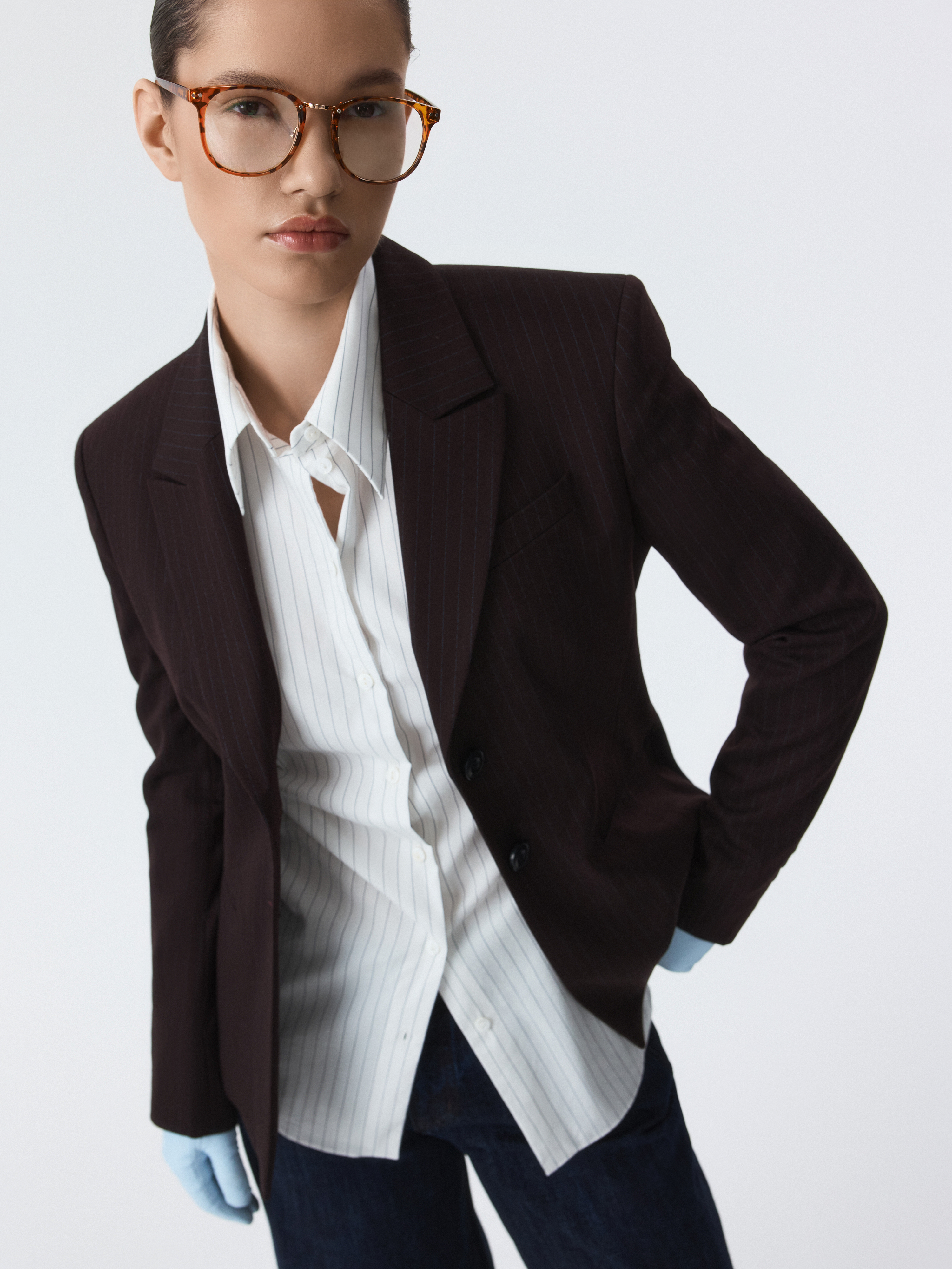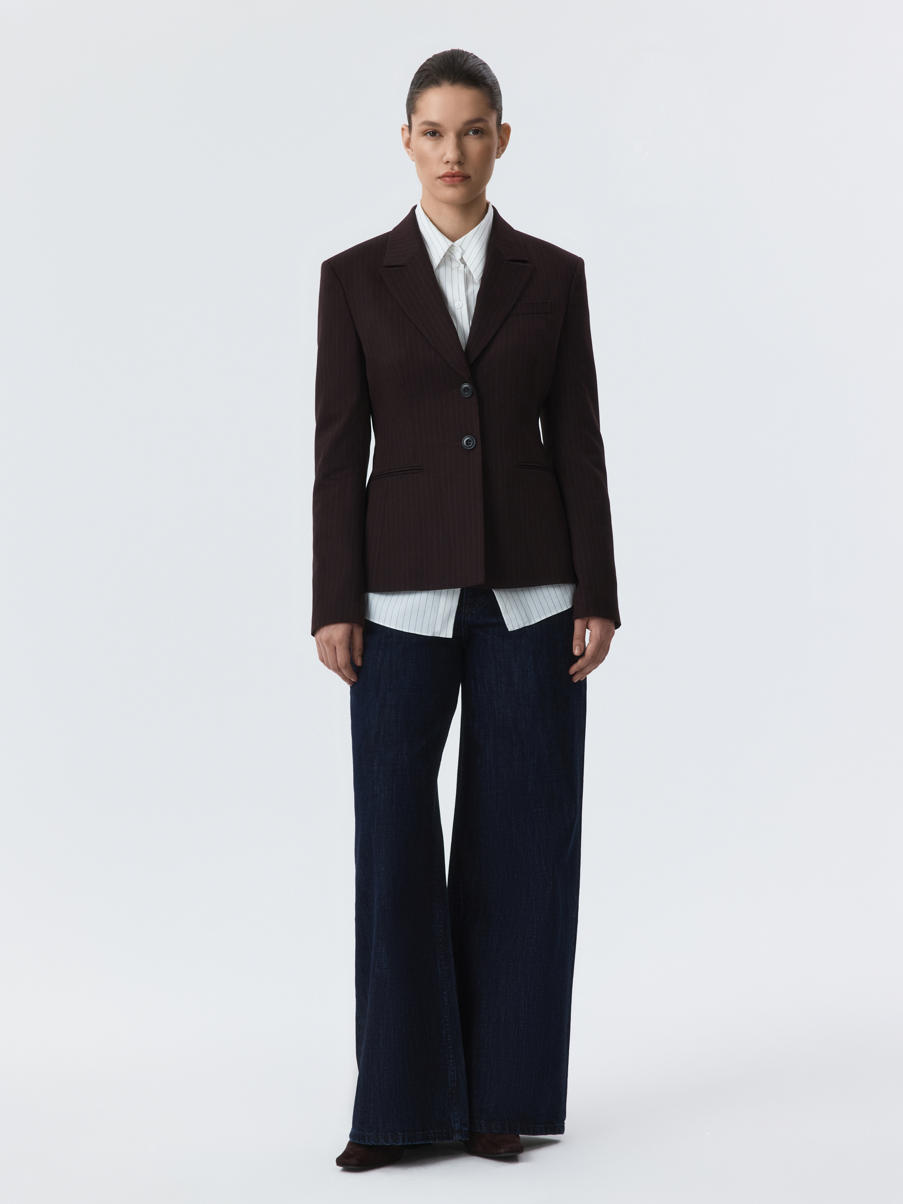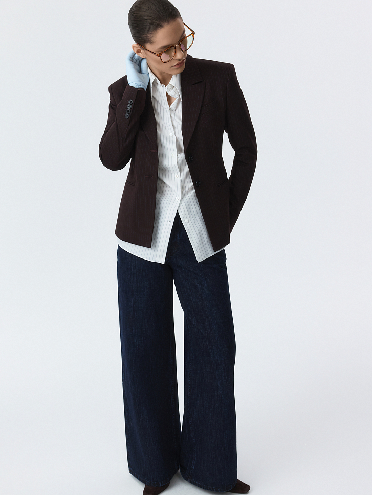 Приталенный однобортный жакет имеет четкий силуэт, а тонкая полоска подчеркивает точность кроя. В меру плотный костюмный текстиль не вытягивается и не требует особого ухода. Стилизуйте с парными брюками или джинсами в любое время года.
