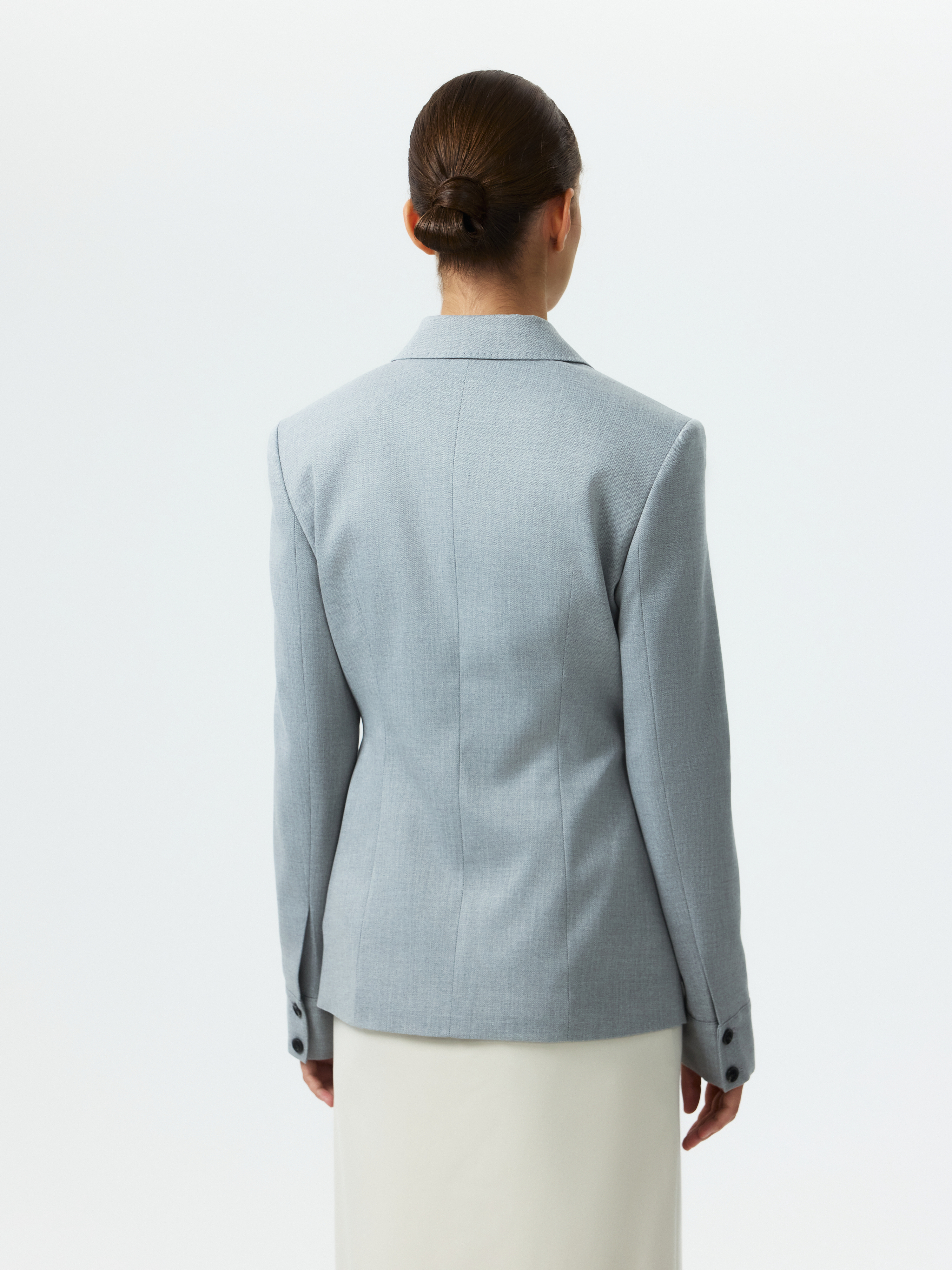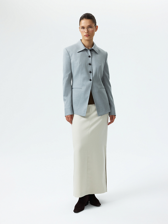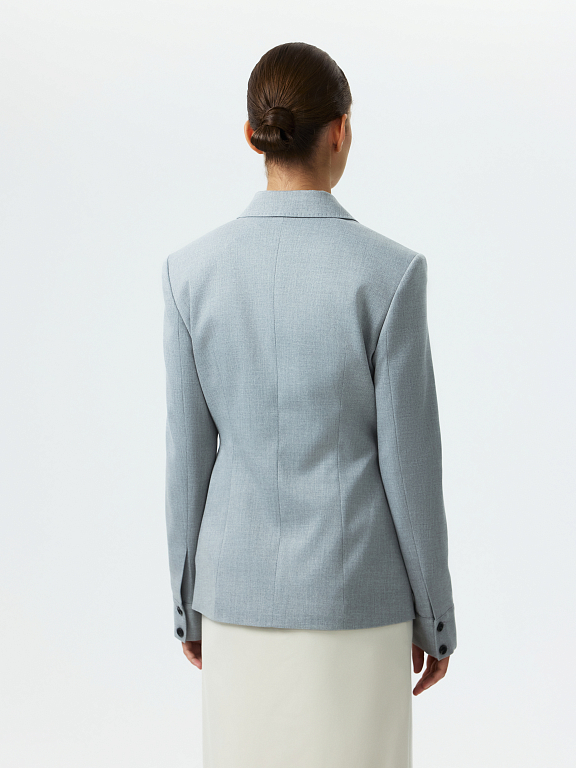 Приталенный жакет с отложным воротником – стильный выбор для тех, кто хочет переосмыслить офисный гардероб. Плотный костюмный текстиль не тянется и не мнется, а гладкая подкладка обеспечивает комфортное прилегание. Дополнить образ можно брюками или юбкой из комплекта.