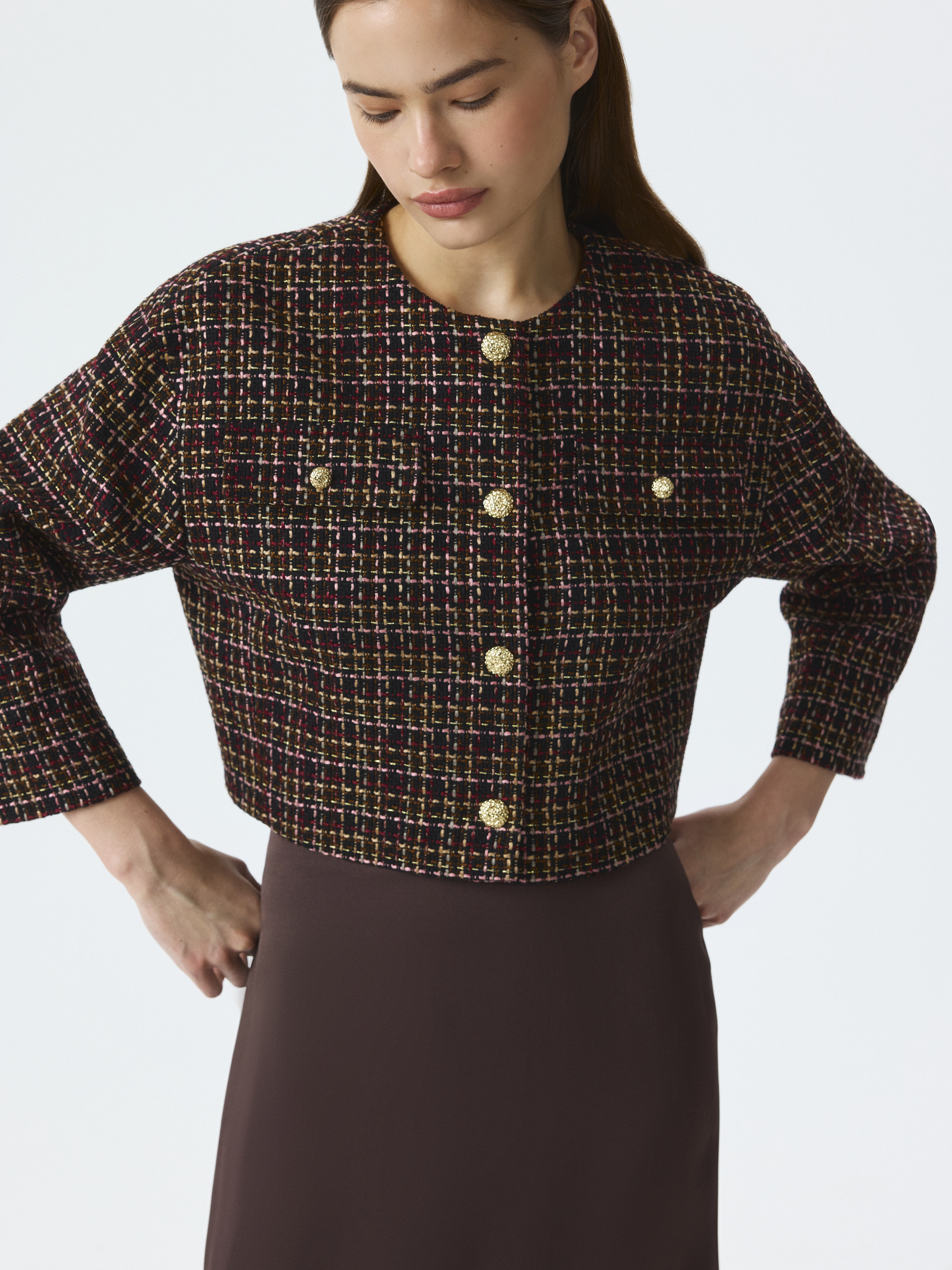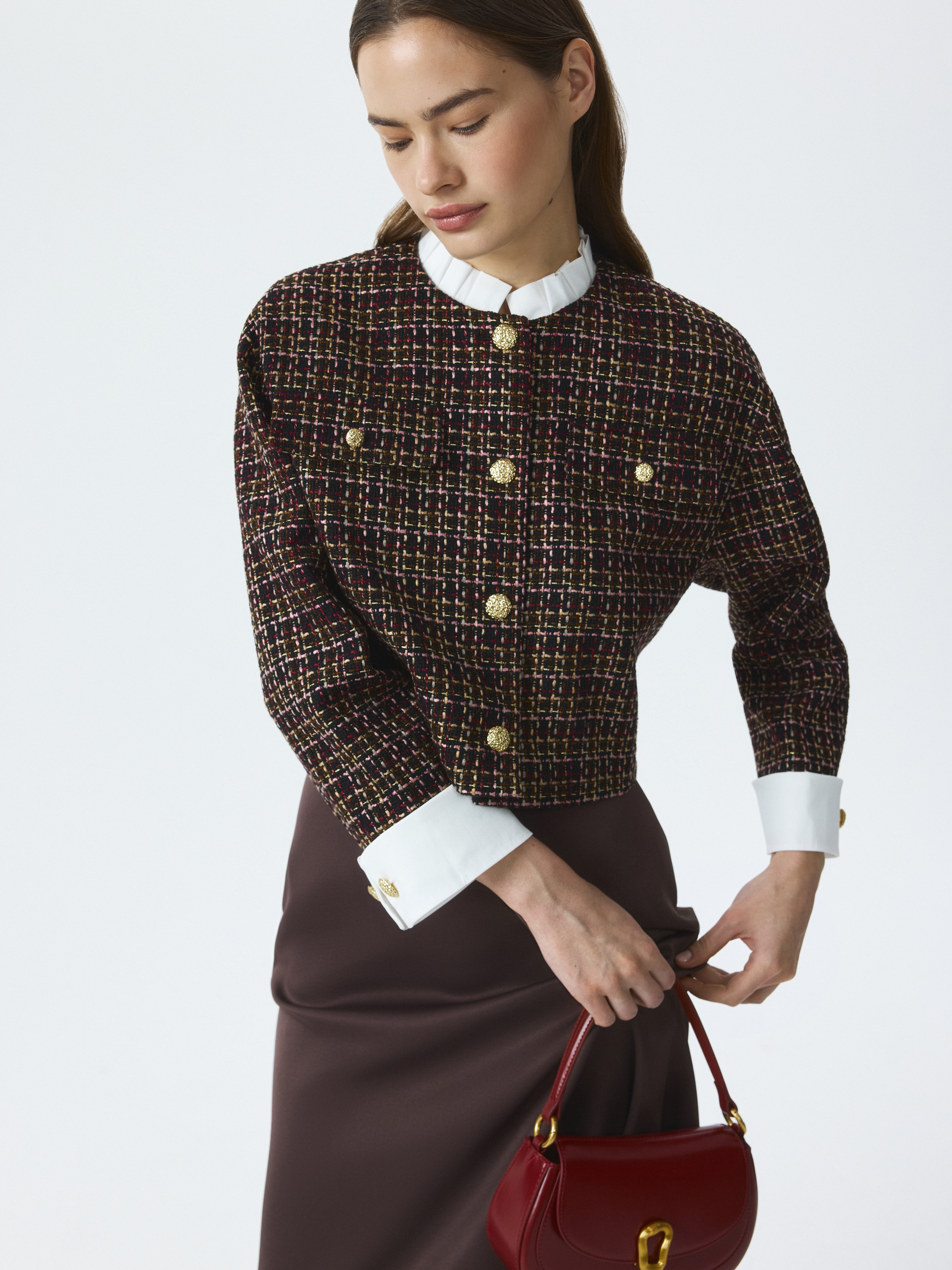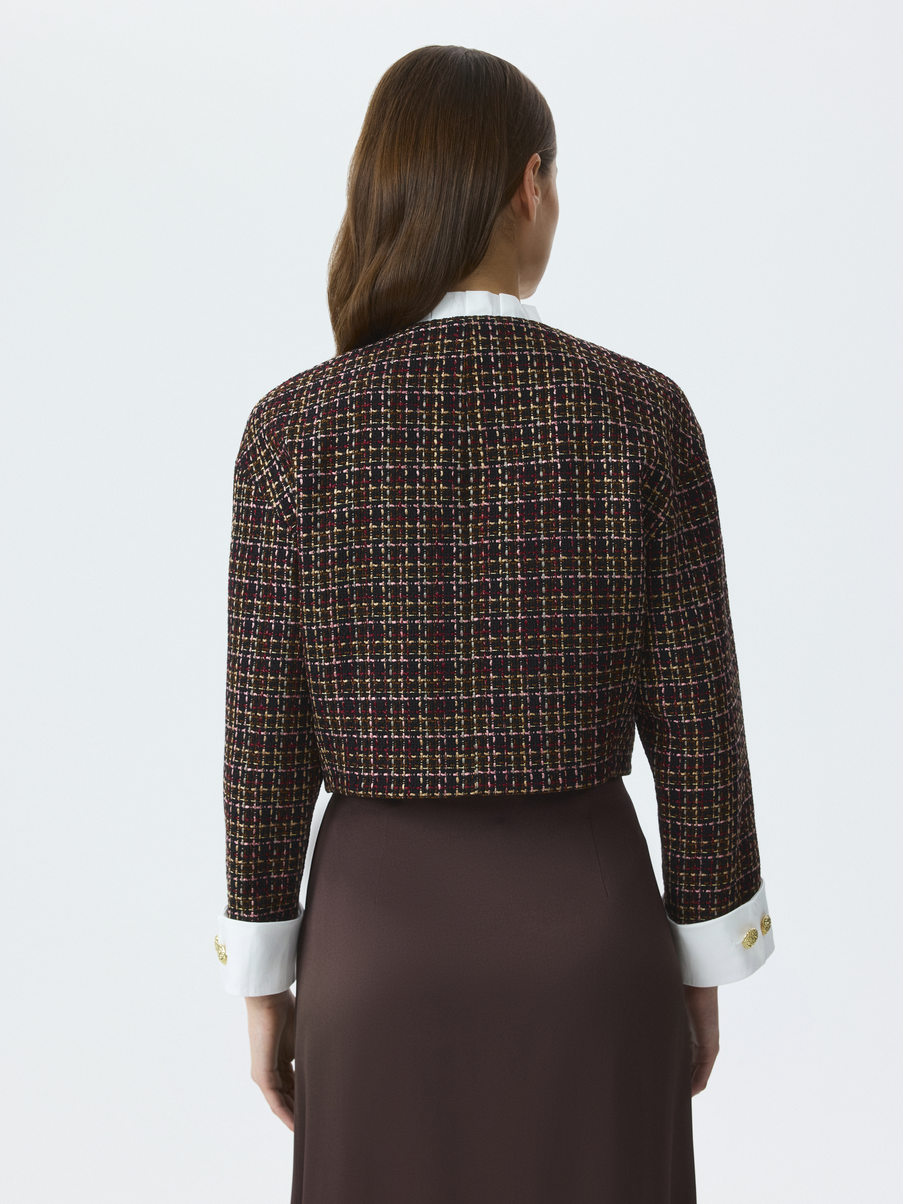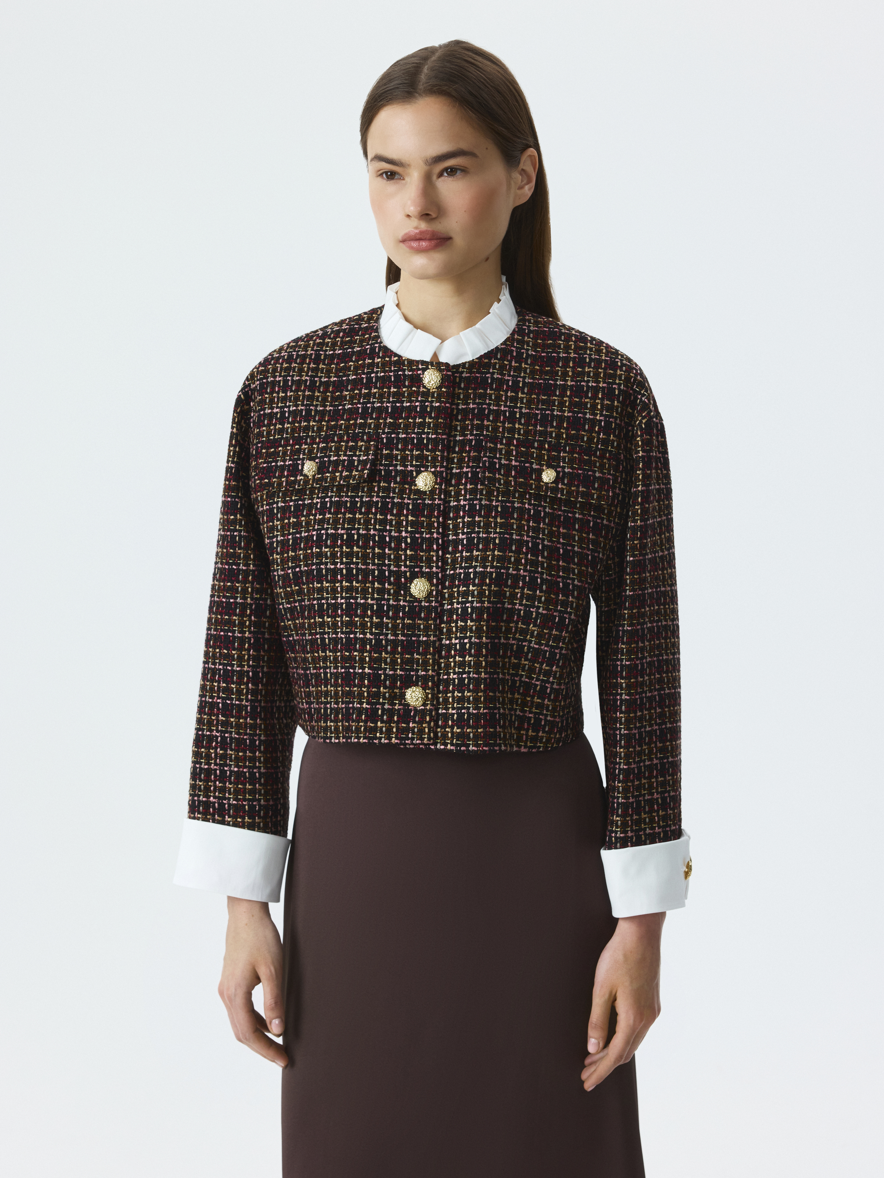 Твидовый укороченный жакет – стильный компромисс между удобством и выразительностью. Плотный текстиль букле на основе хлопка не тянется, а гладкая подкладка дарит комфортное прилегание. Фактурное плетение нитей с едва заметным люрексом делает образы неповторимыми и притягивает взгляды. Съемные детали из рубашечной ткани можно отстегнуть и сделать жакет более строгим, но не менее заметным.