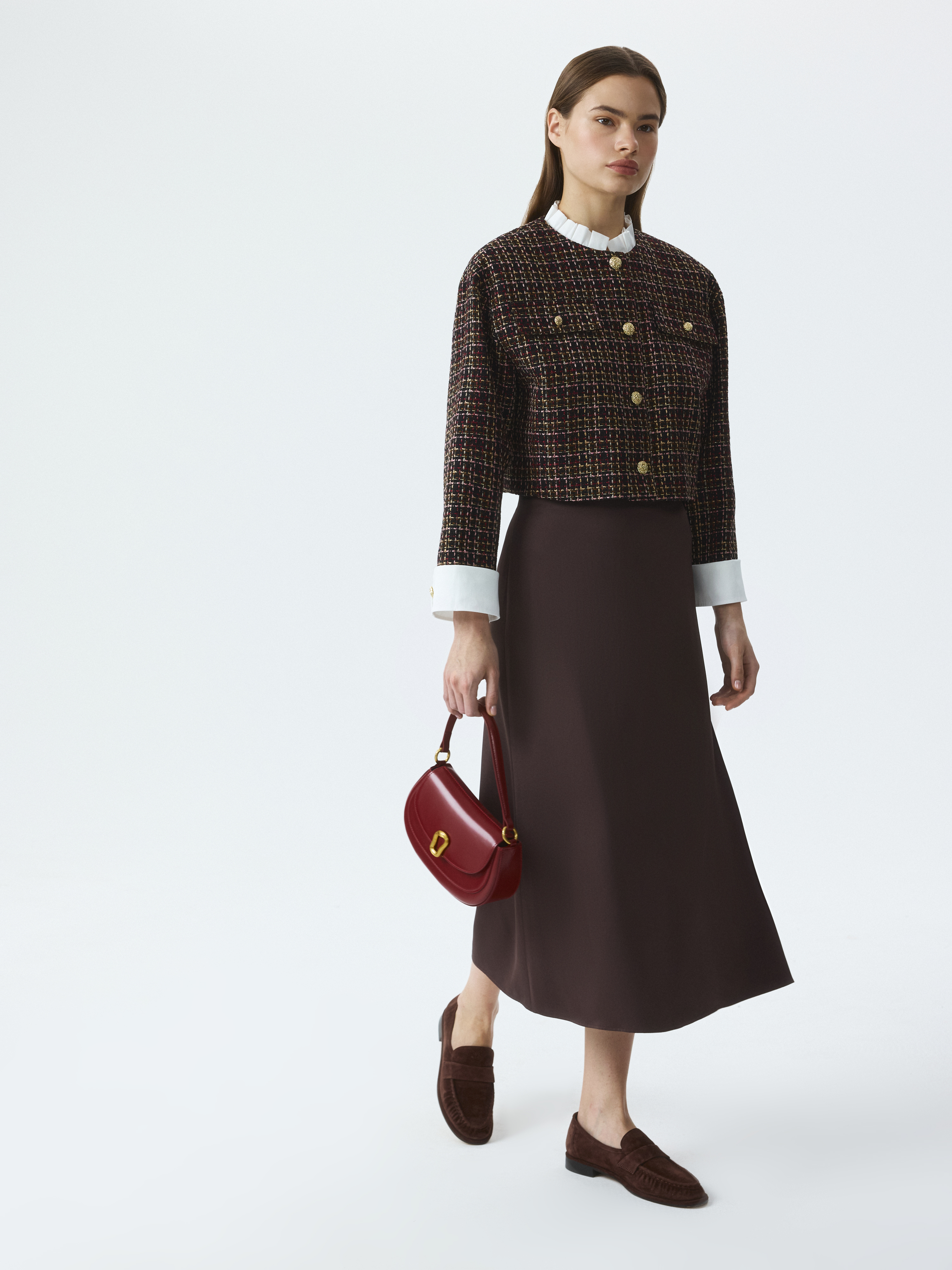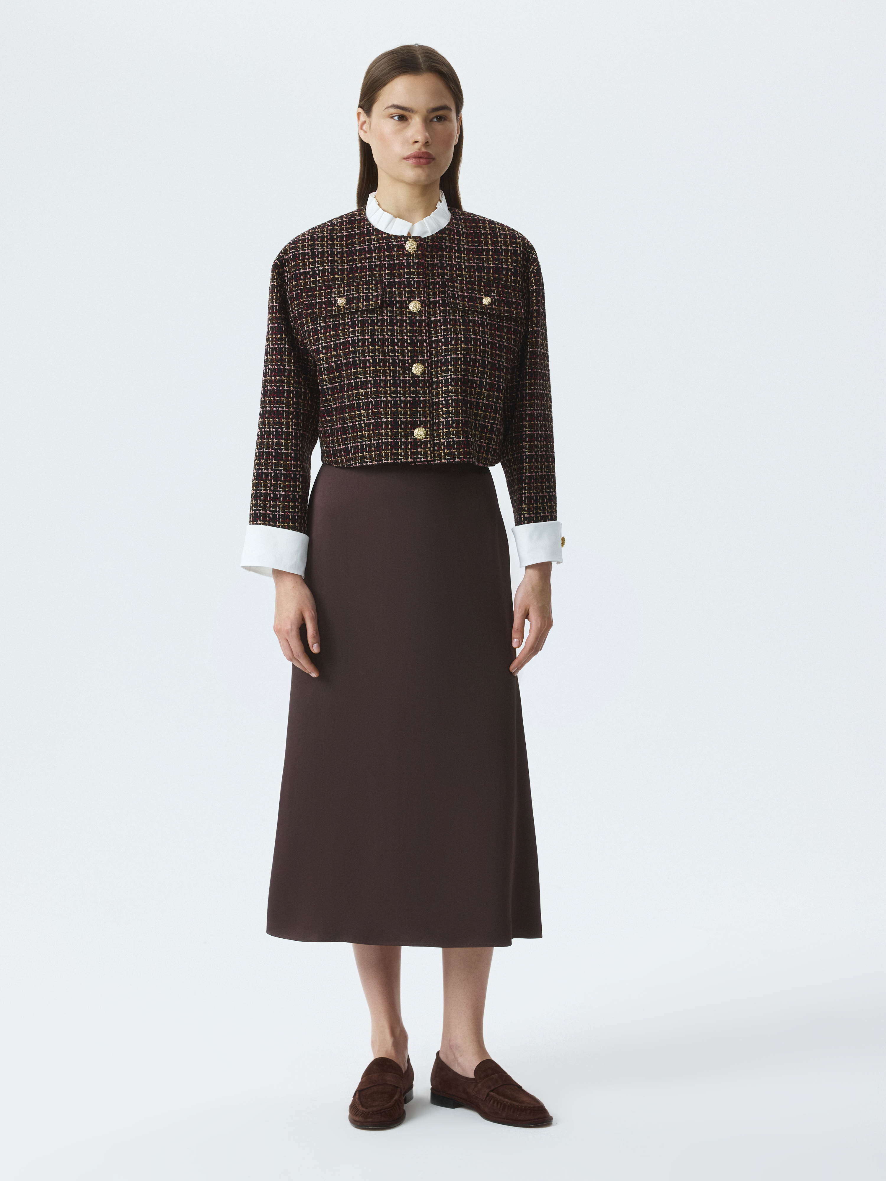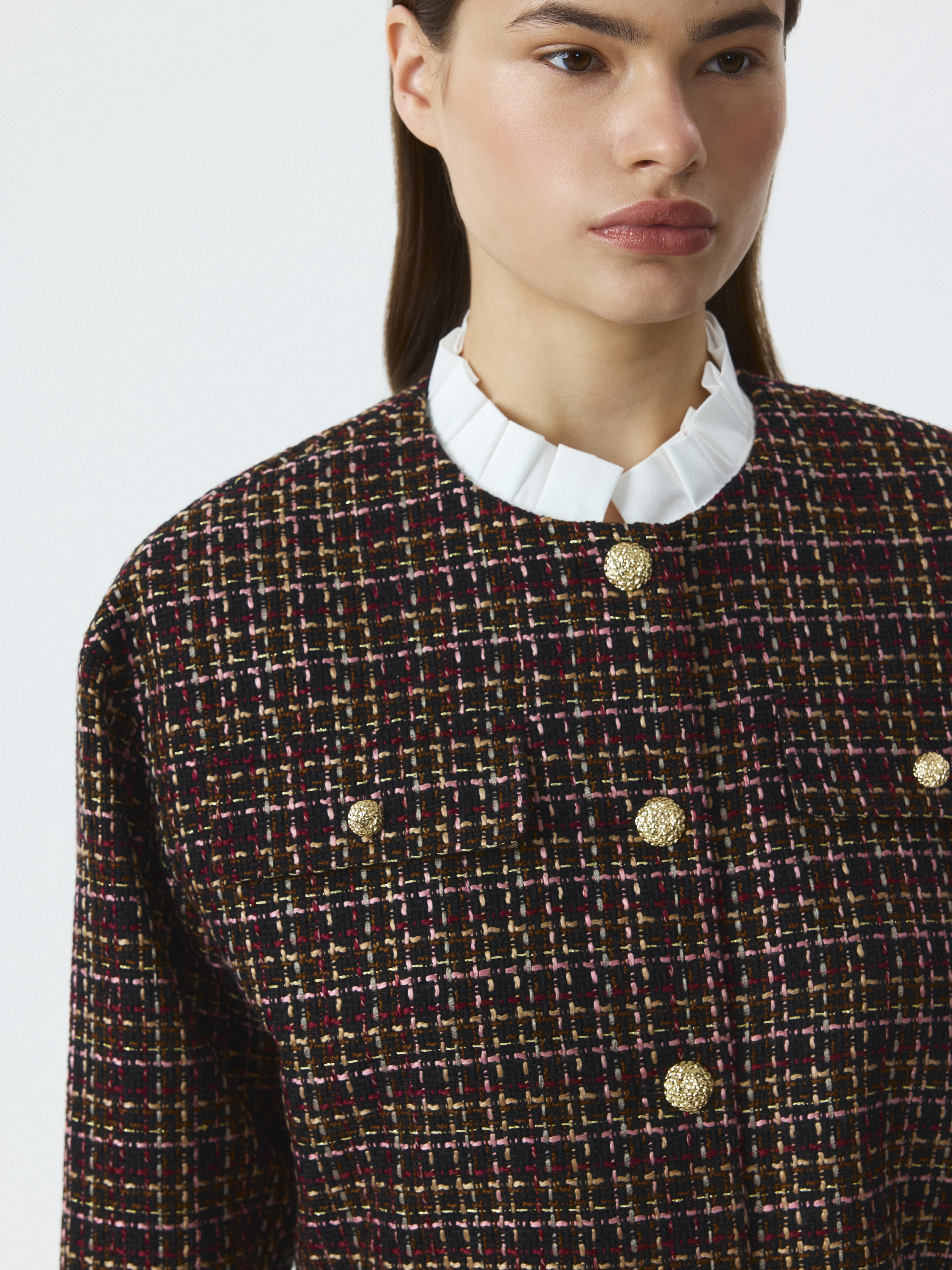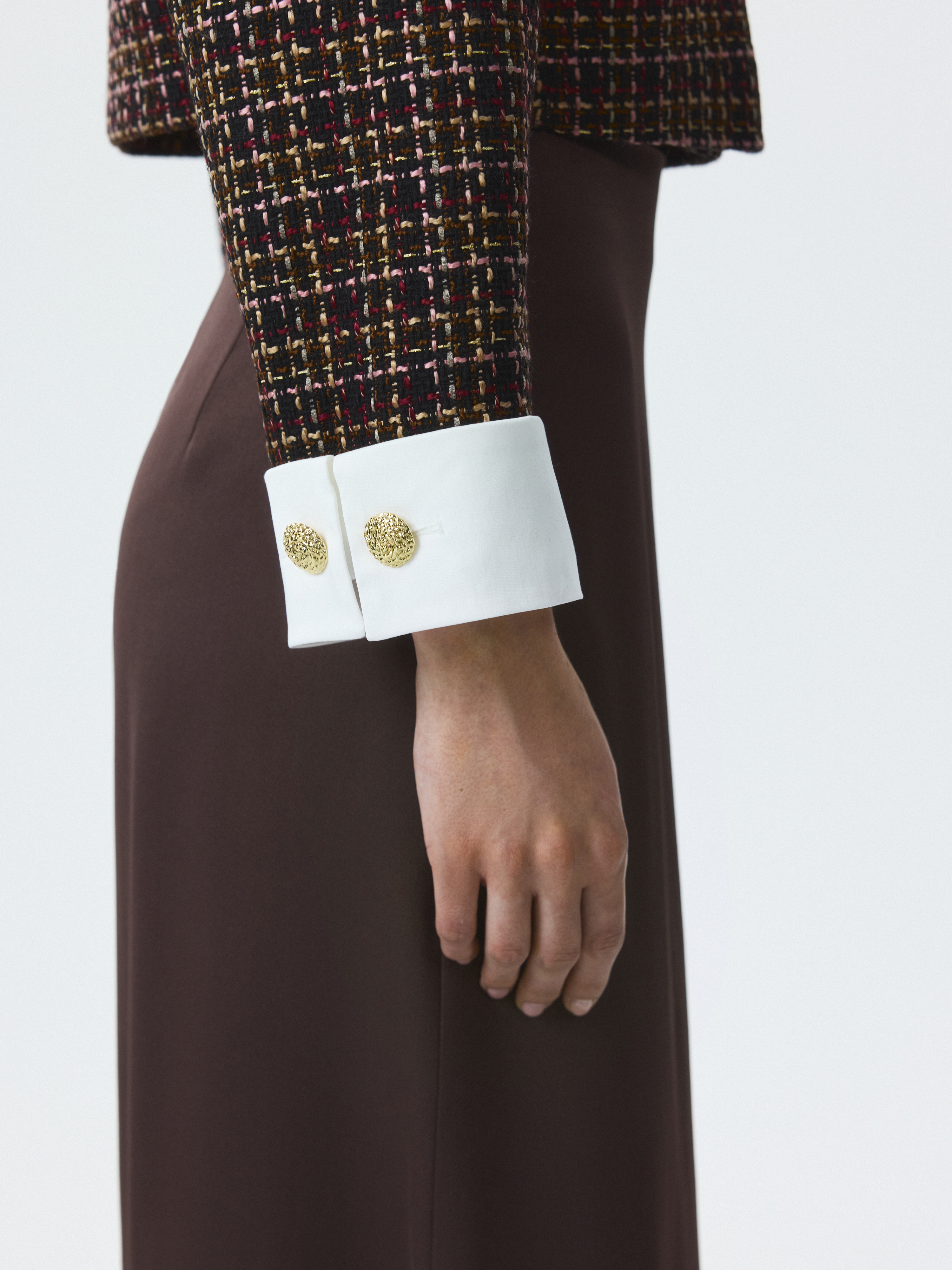 Твидовый укороченный жакет – стильный компромисс между удобством и выразительностью. Плотный текстиль букле на основе хлопка не тянется, а гладкая подкладка дарит комфортное прилегание. Фактурное плетение нитей с едва заметным люрексом делает образы неповторимыми и притягивает взгляды. Съемные детали из рубашечной ткани можно отстегнуть и сделать жакет более строгим, но не менее заметным.