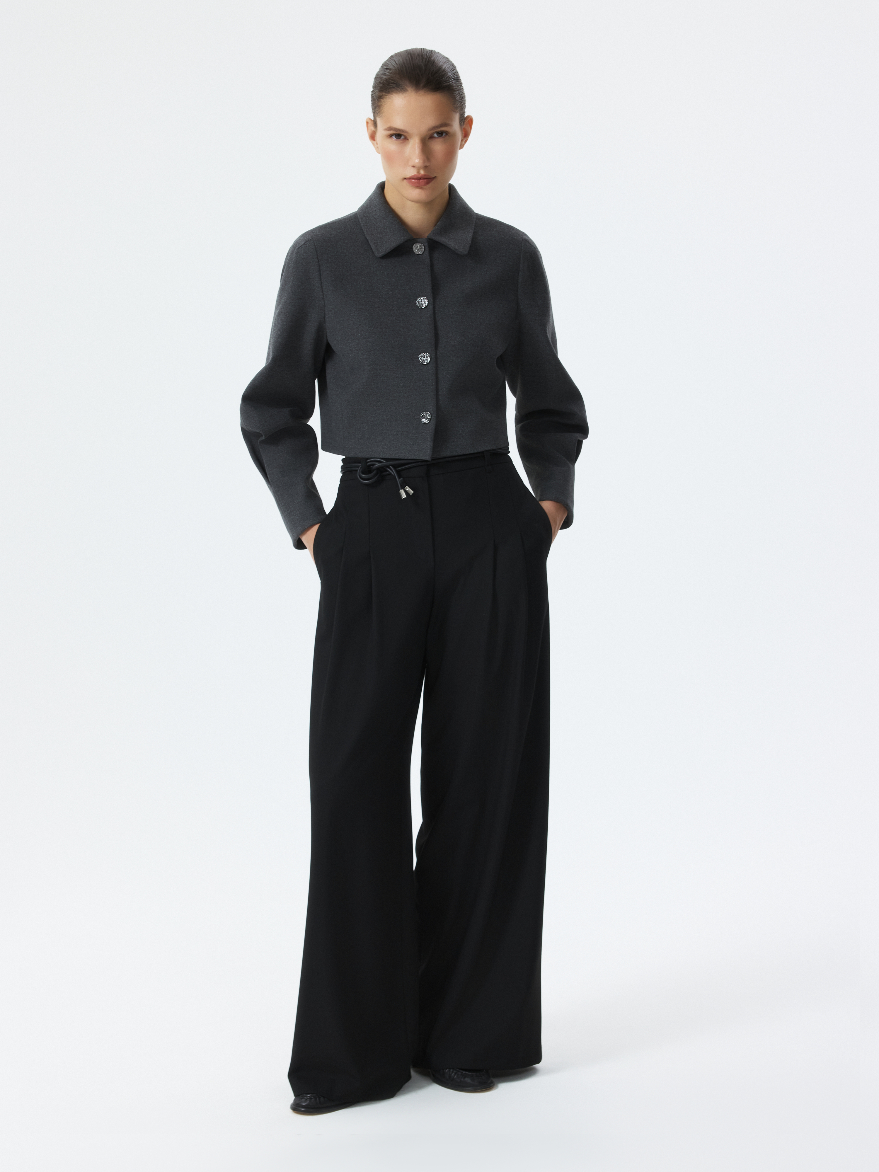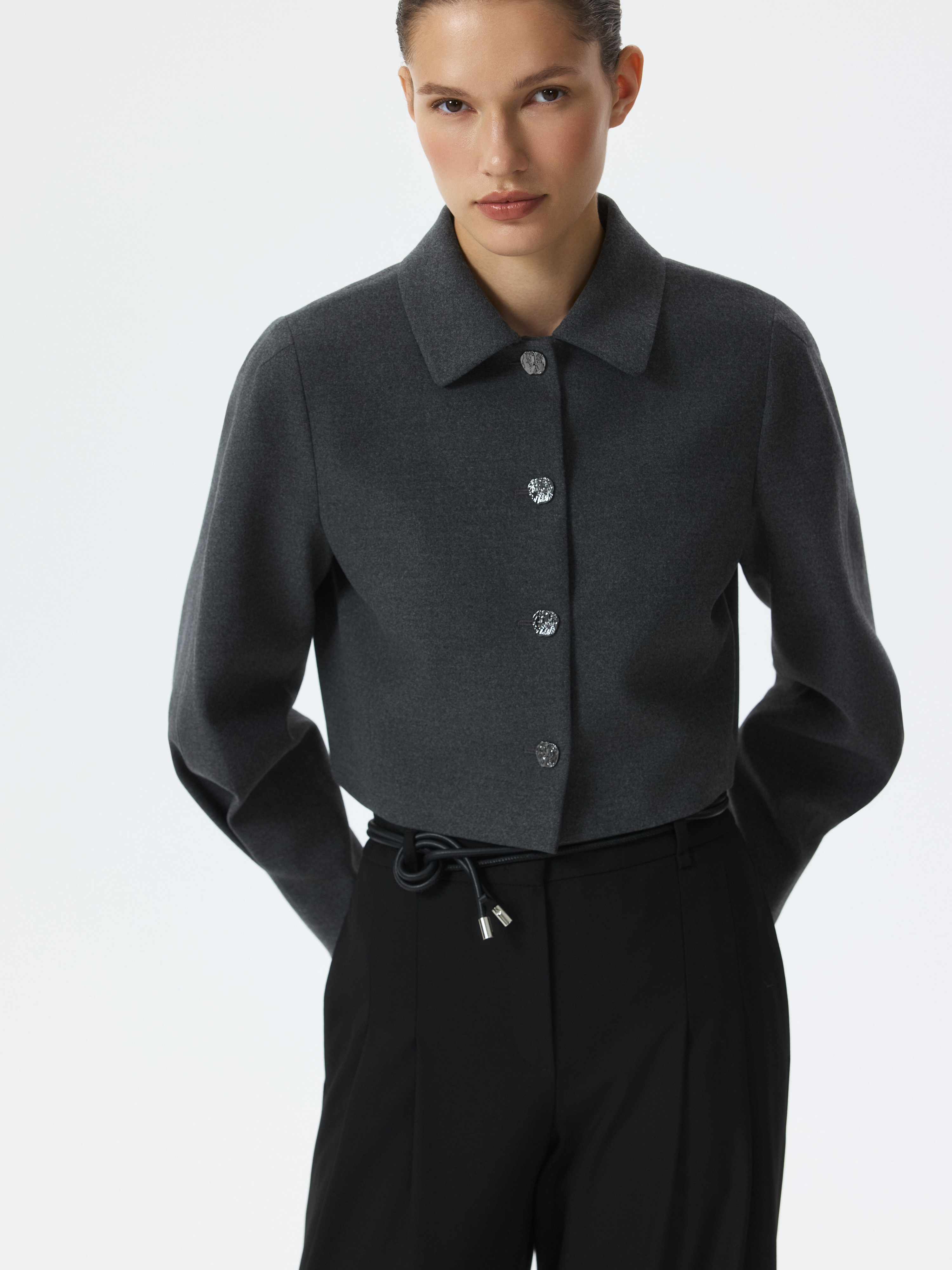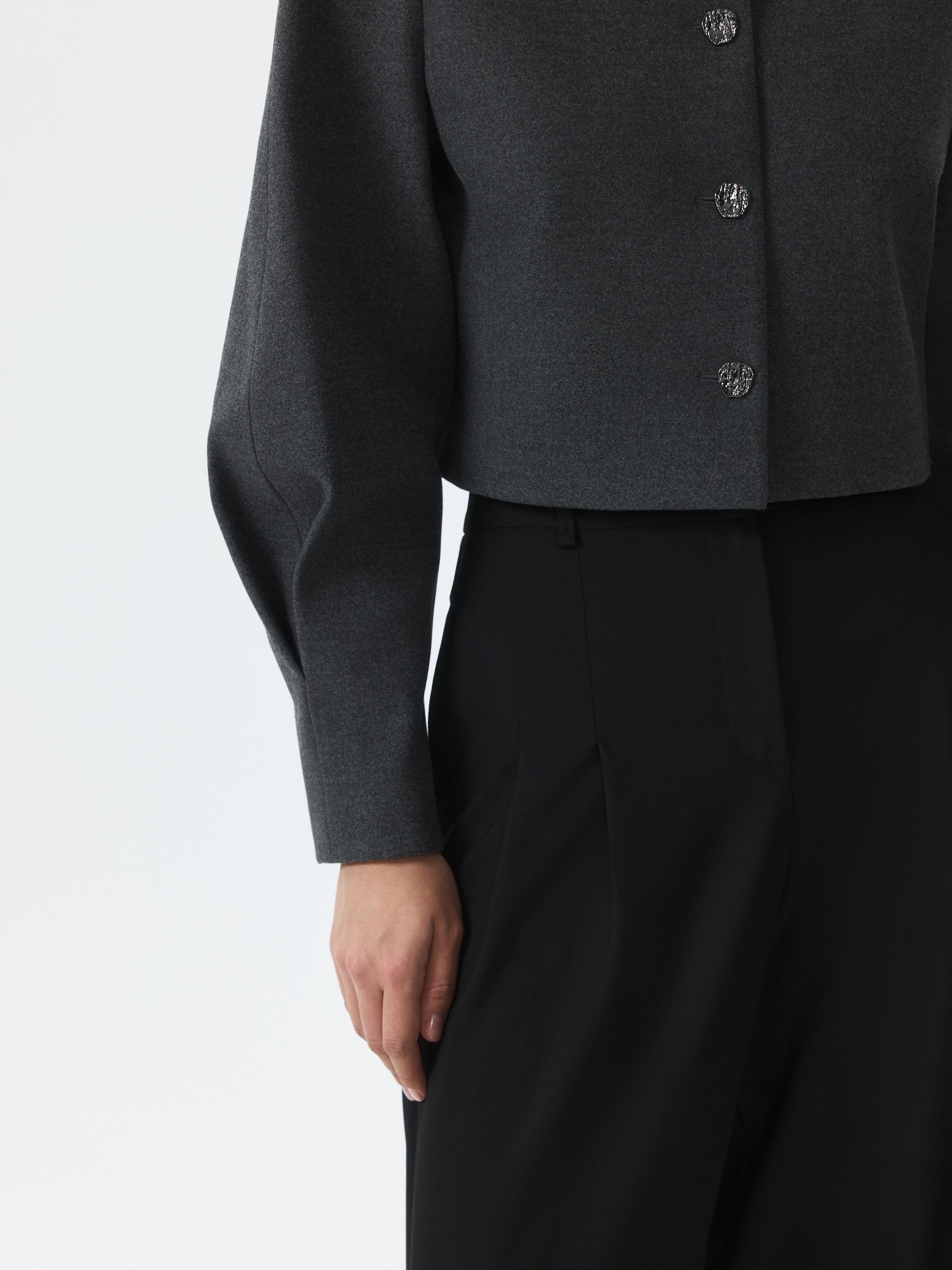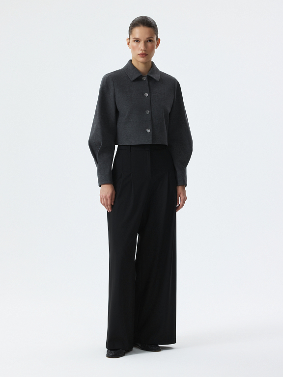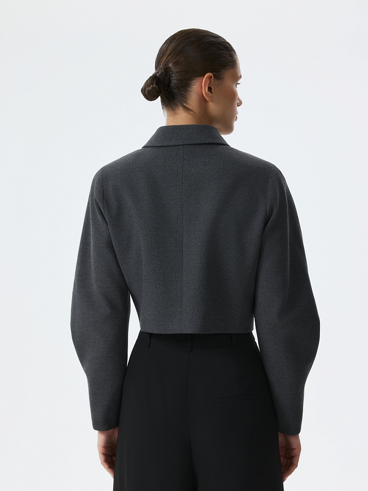 Укороченный жакет – женственная интерпретация делового стиля, в котором строгая классика материала встречается с легкостью объемных рукавов с защипами. Плотный текстиль из поливискозы не тянется и хорошо держит форму. Фигурные металлические пуговицы выступают в роли акцентов.