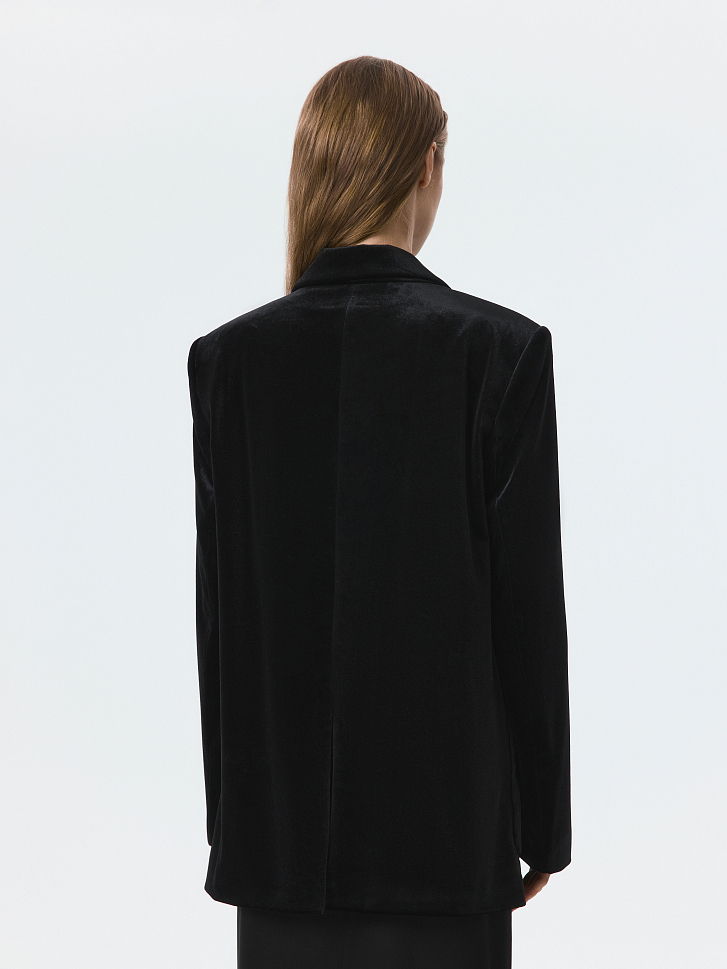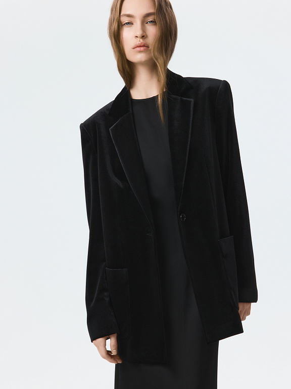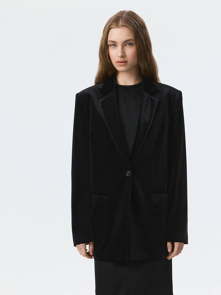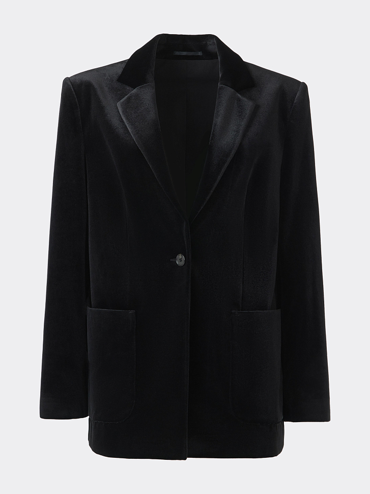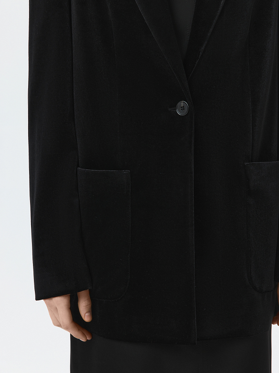Бархатный однобортный жакет – знакомая форма в новом прочтении. В меру плотный текстиль мягко прилегает, позволяя чувствовать себя комфортно, а расслабленная посадка не сковывает движения. Классический крой уравновешен мягкими линиями и накладными карманами.