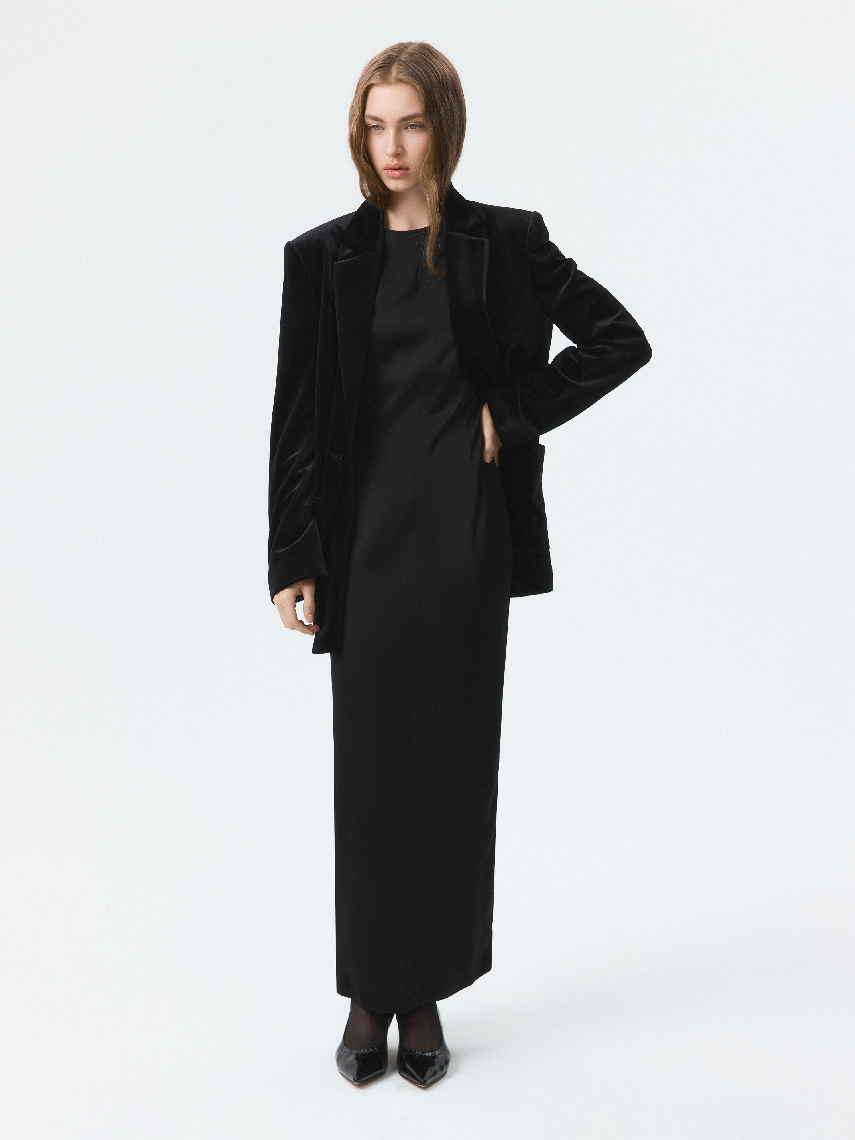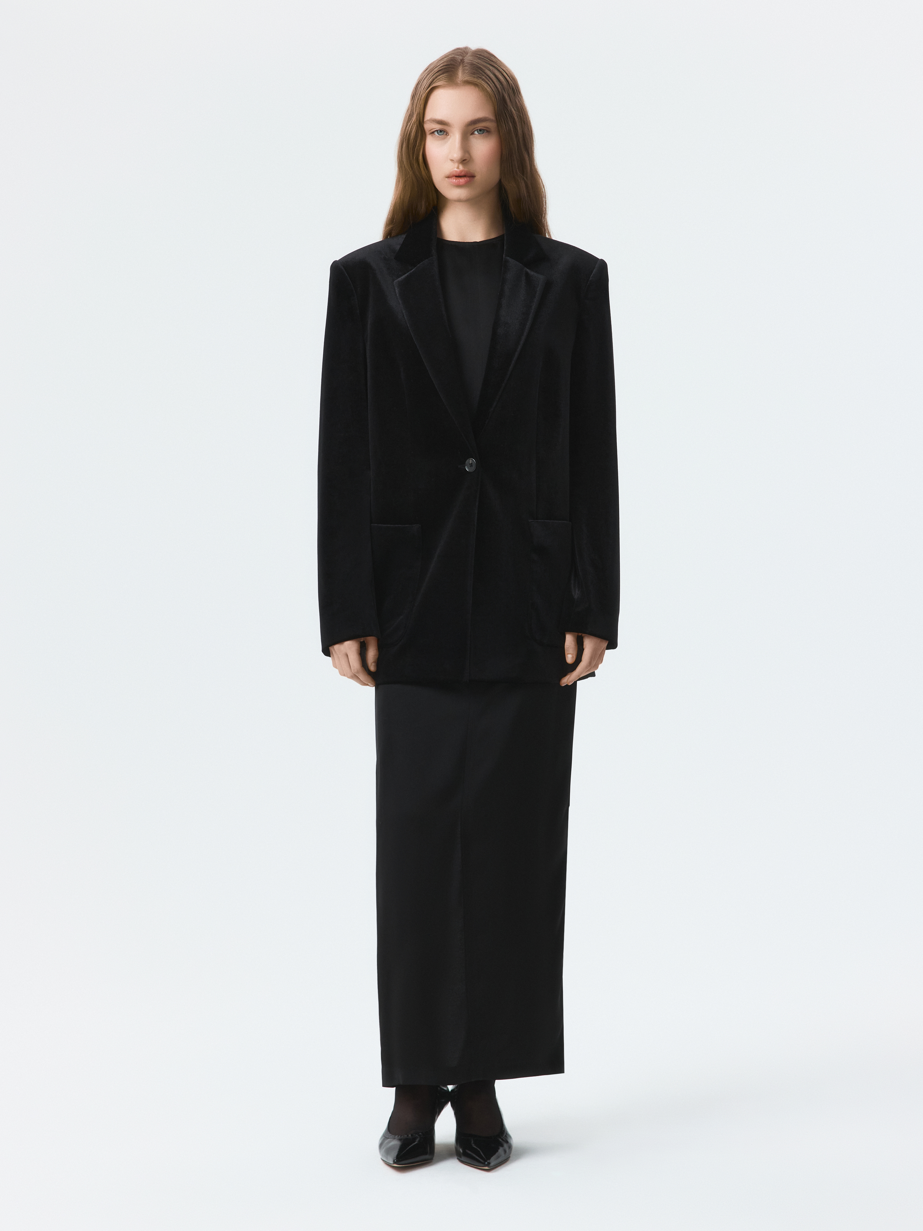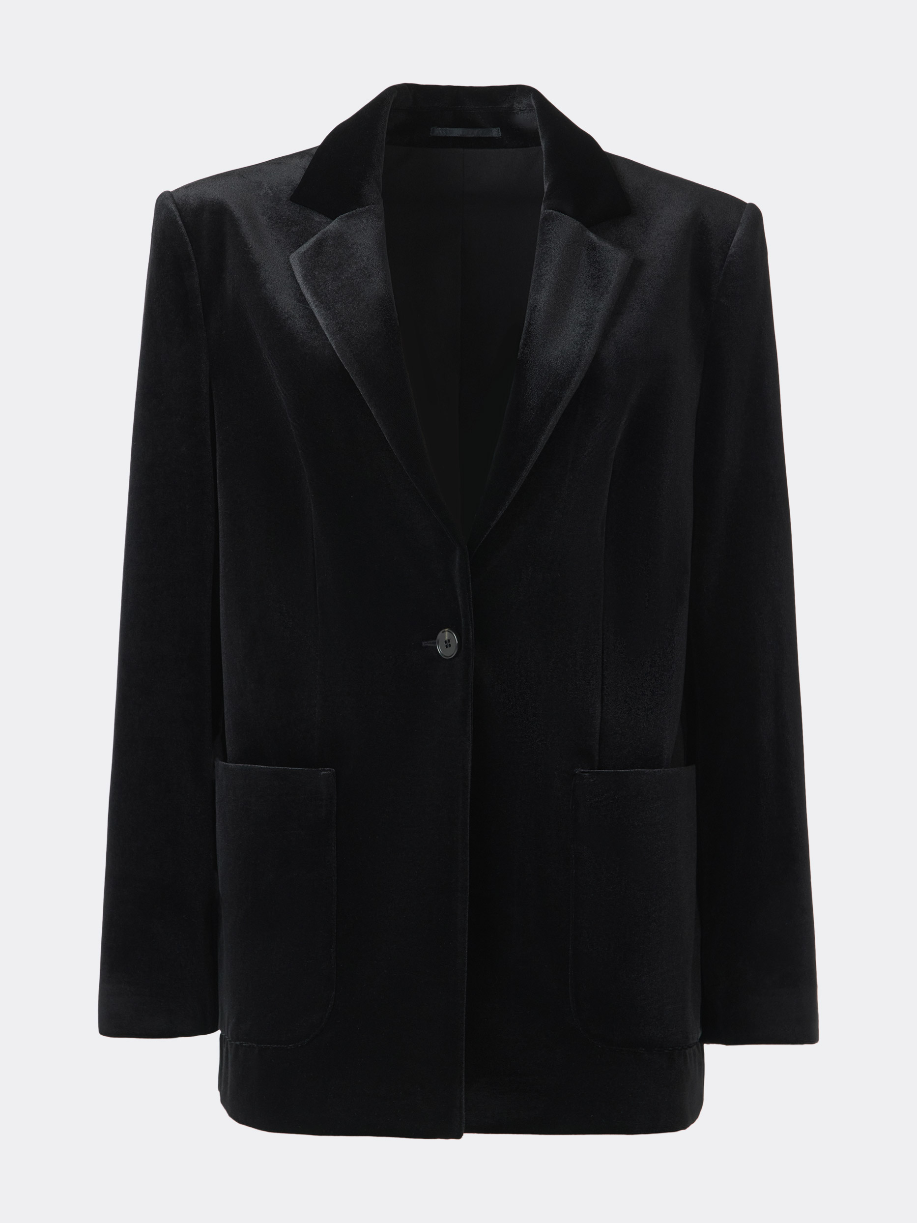 Бархатный однобортный жакет – знакомая форма в новом прочтении. В меру плотный текстиль мягко прилегает, позволяя чувствовать себя комфортно, а расслабленная посадка не сковывает движения. Классический крой уравновешен мягкими линиями и накладными карманами.