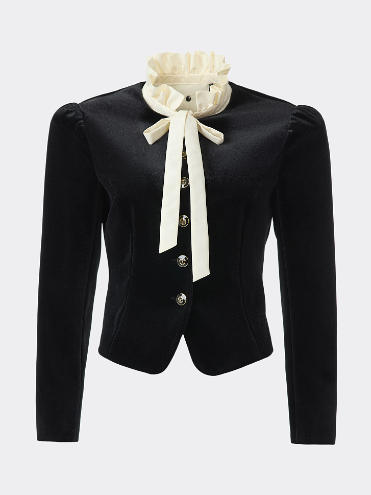Бархатный жакет с акцентными деталями легко интегрируется в роскошные образы для вечерних и повседневных выходов. В меру плотный текстиль мягко прилегает, позволяя чувствовать себя комфортно. Съемный воротник из тафты хорошо держит форму складок.