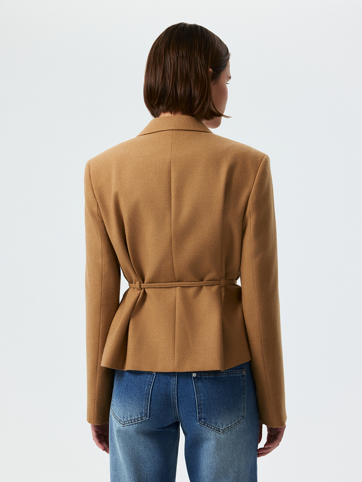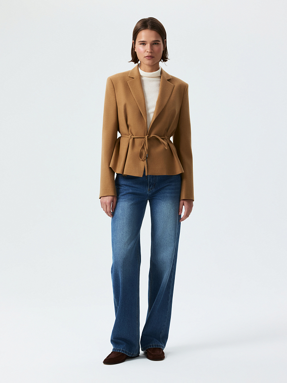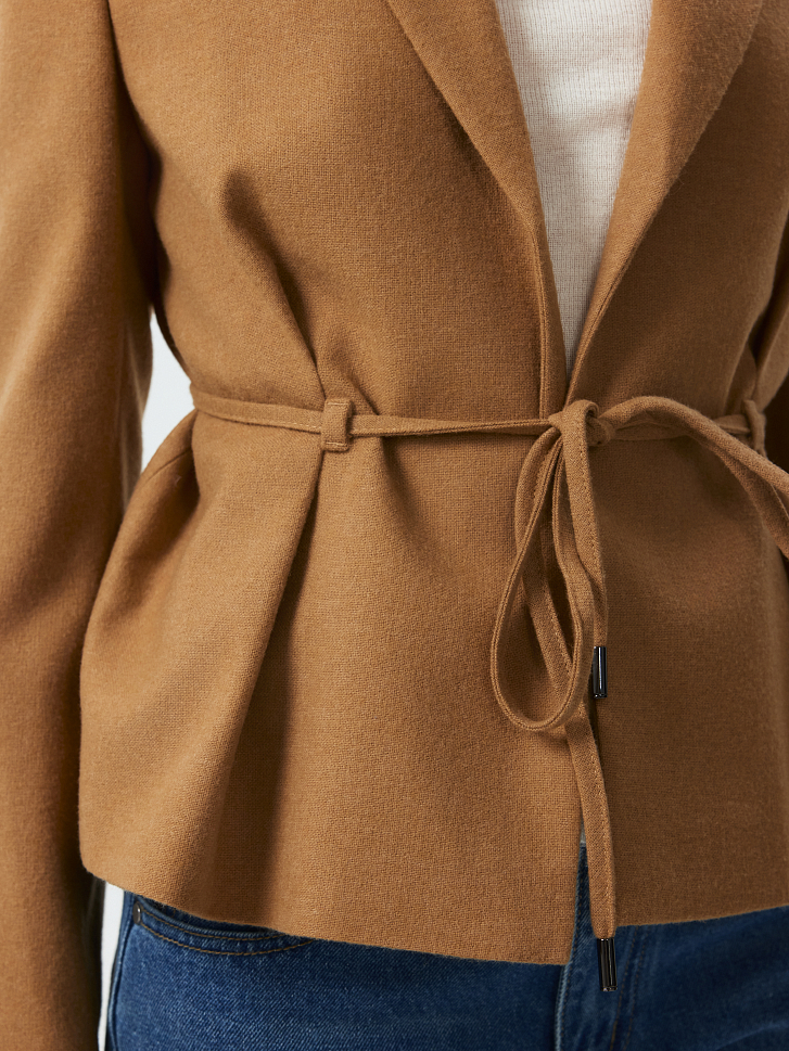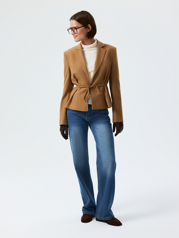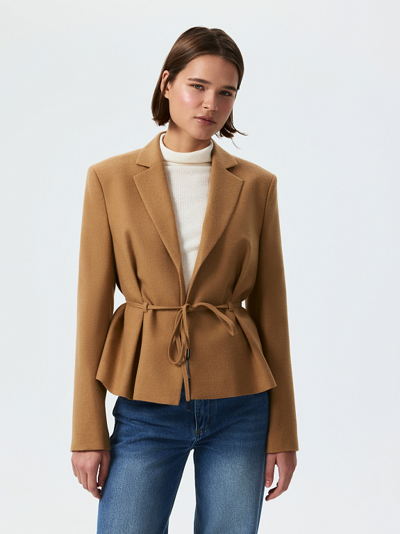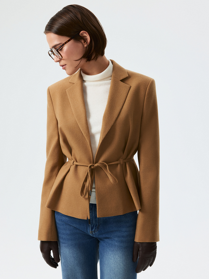 Жакет без застежки дополнит как деловой, так и повседневный гардероб. Фланелевый текстиль с бархатистой на ощупь фактурой содержит натуральную шерсть, деликатно согревая, а для комфортной посадки снизу добавили гладкую подкладку. Пояс позволяет менять силуэт – от приталенного до свободного, добавляя изделию функциональности.