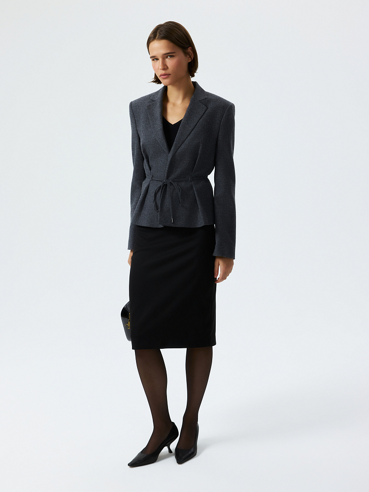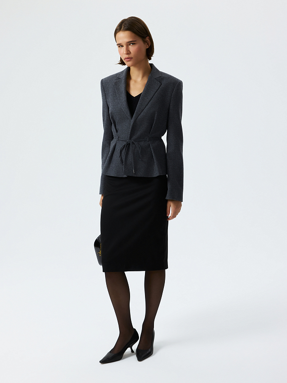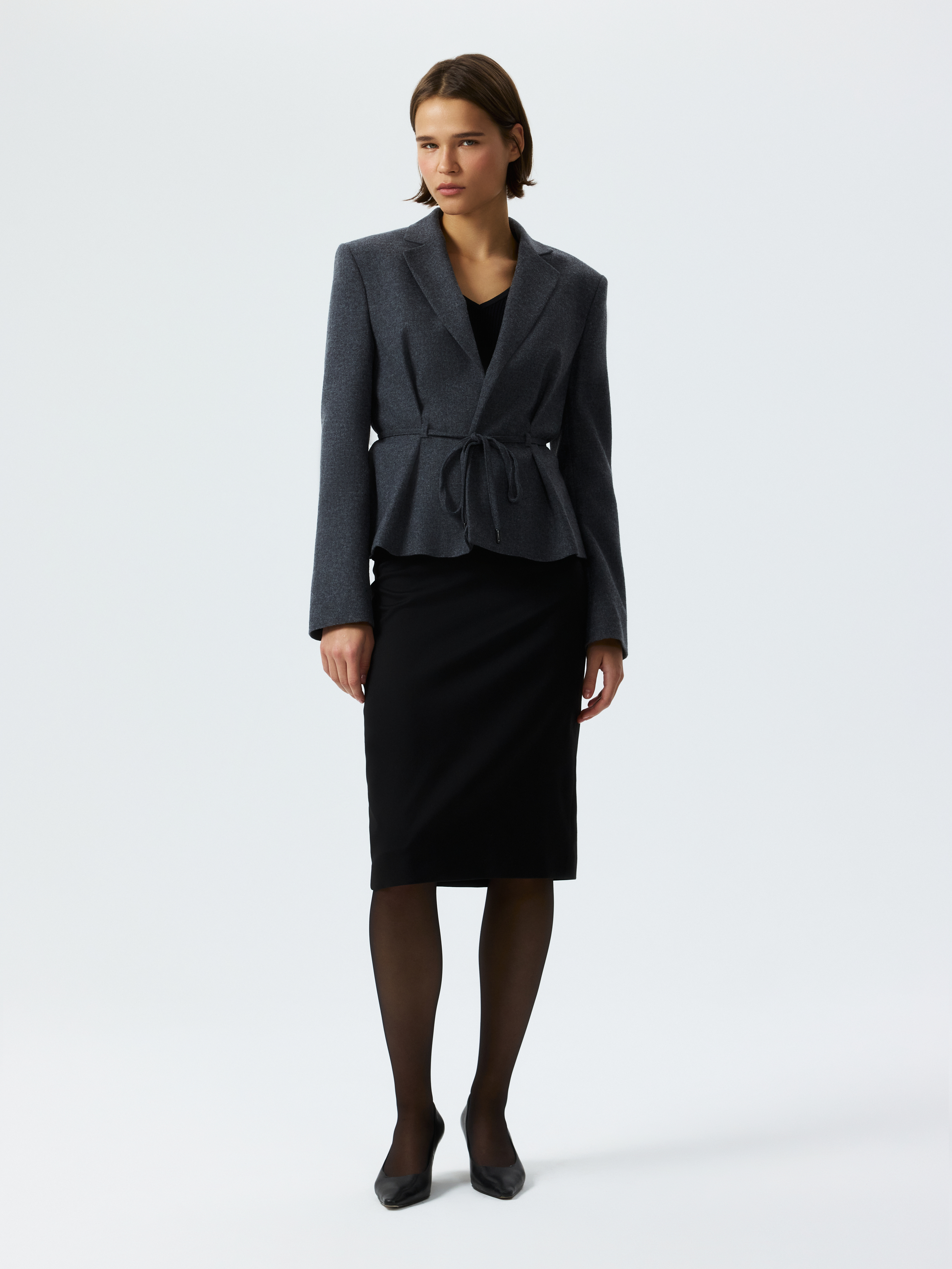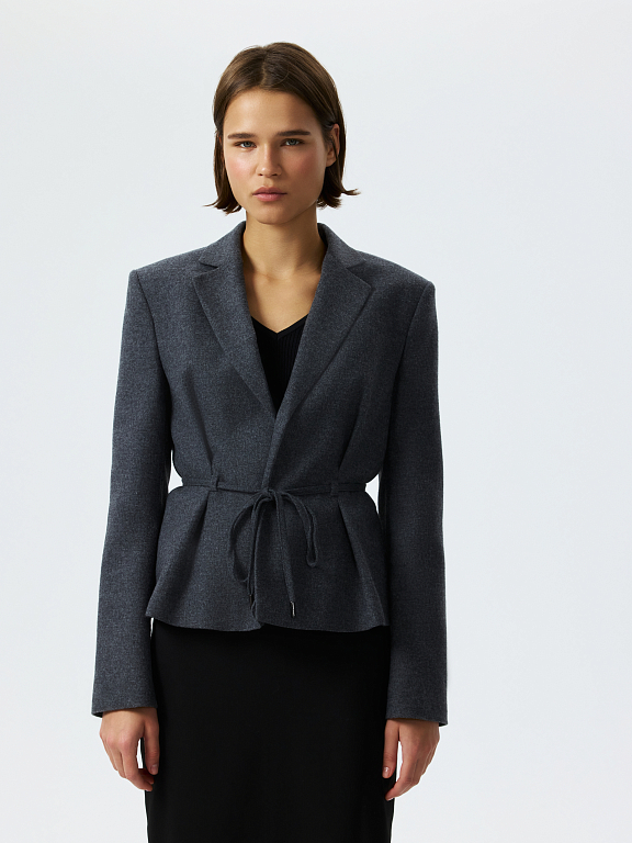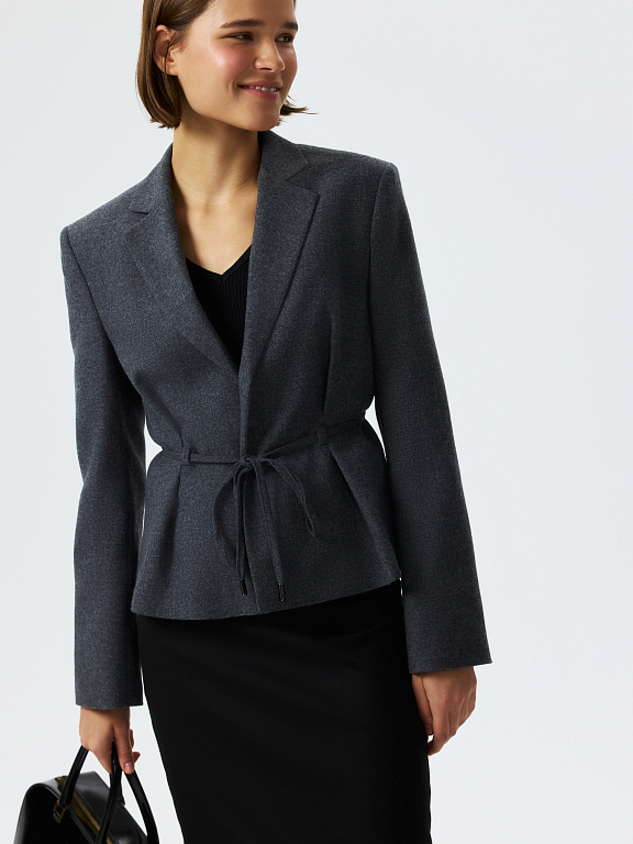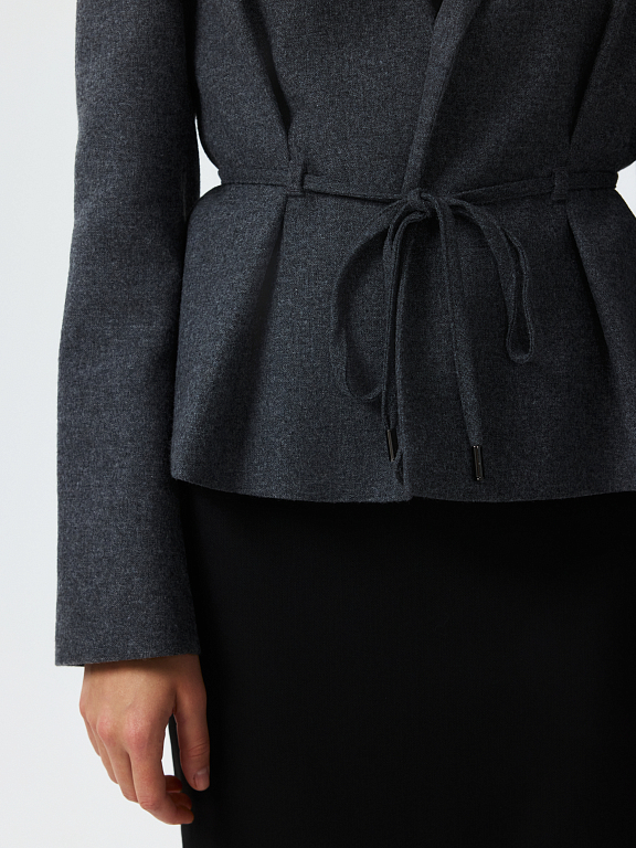 Жакет без застежки дополнит как деловой, так и повседневный гардероб. Фланелевый текстиль с бархатистой на ощупь фактурой содержит натуральную шерсть, деликатно согревая, а для комфортной посадки снизу добавили гладкую подкладку. Пояс позволяет менять силуэт – от приталенного до свободного, добавляя изделию функциональности.