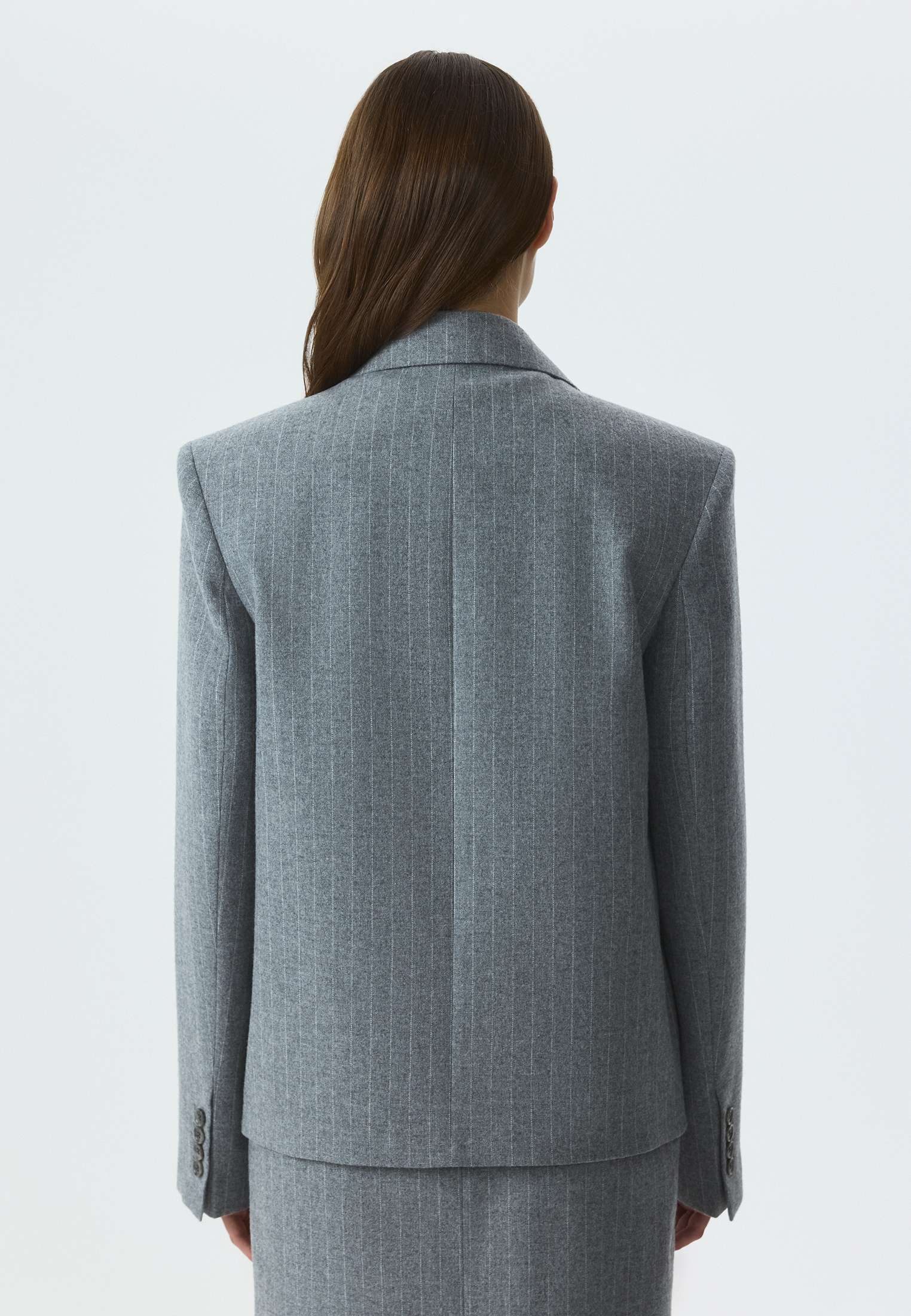 Двубортный жакет оверсайз – комфортный стильный вариант на демисезон. Фланель в тонкую полоску содержит натуральную шерсть, поэтому мягко прилегает к телу и деликатно согревает. Завершить костюм можно парными брюками или юбкой.