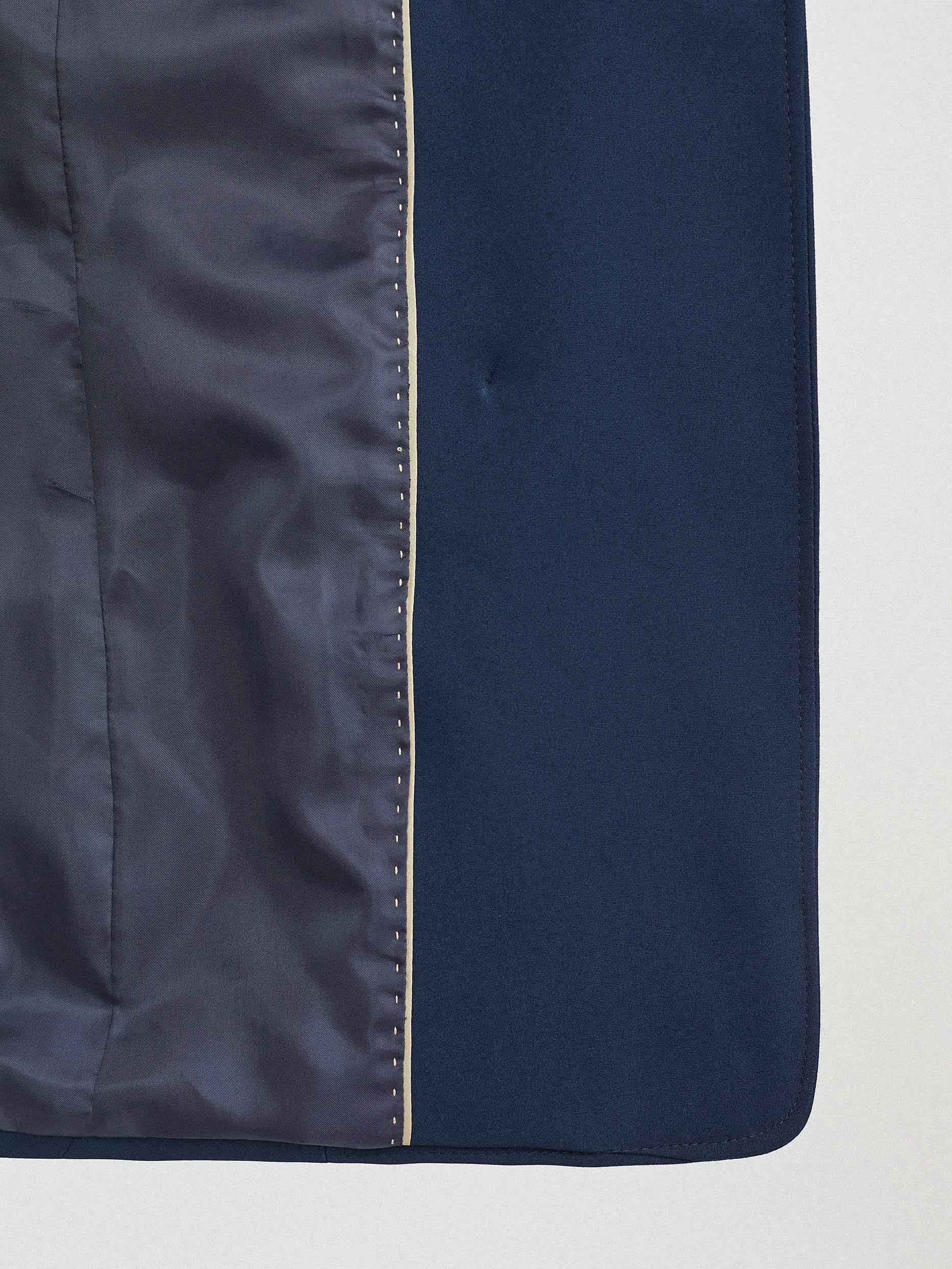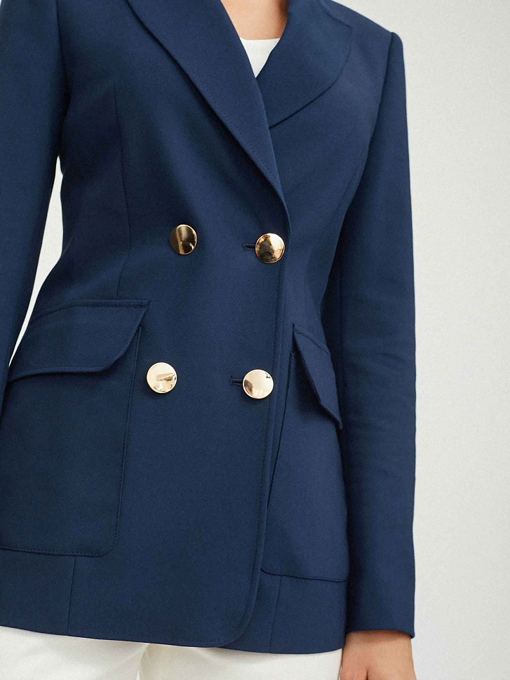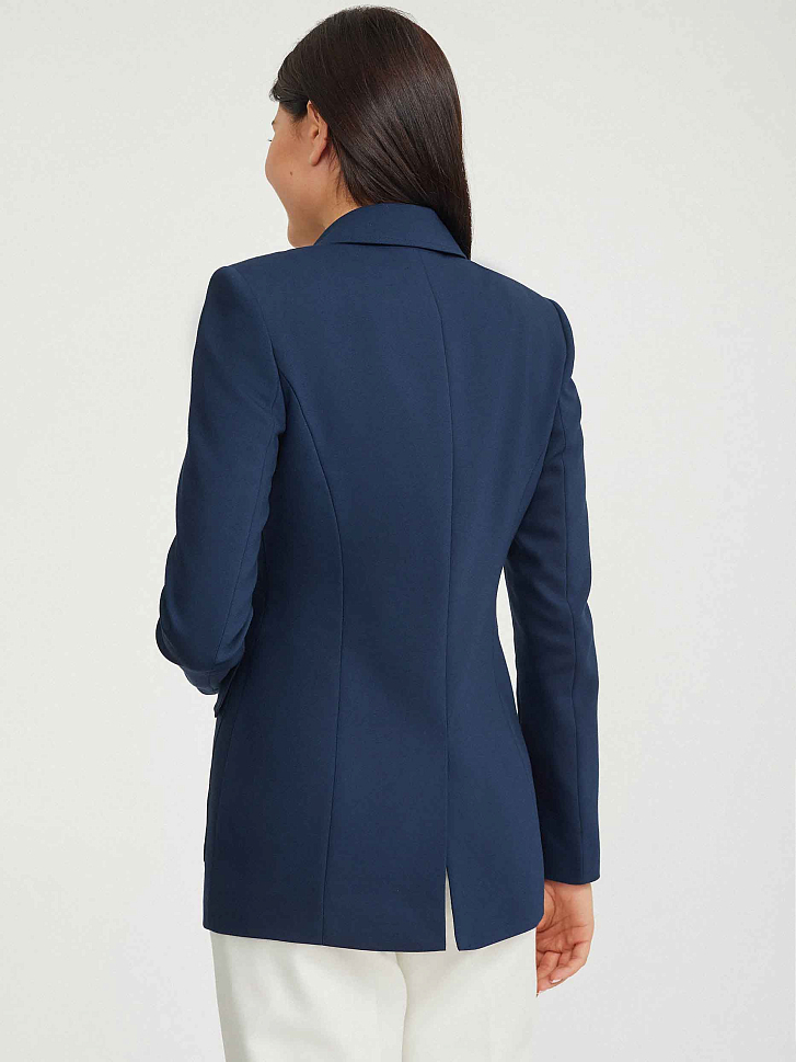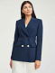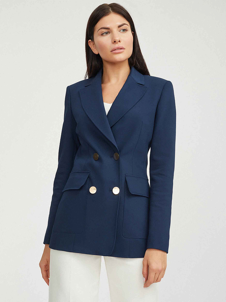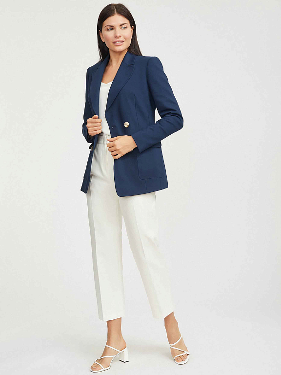 Двубортный жакет приталенного кроя, выполненный из плотного смесового хлопка. Отложной воротник с лацканами, крупные накладные карманы, шлица, подкладка. Застегивается на два ряда крупных металлических пуговиц.