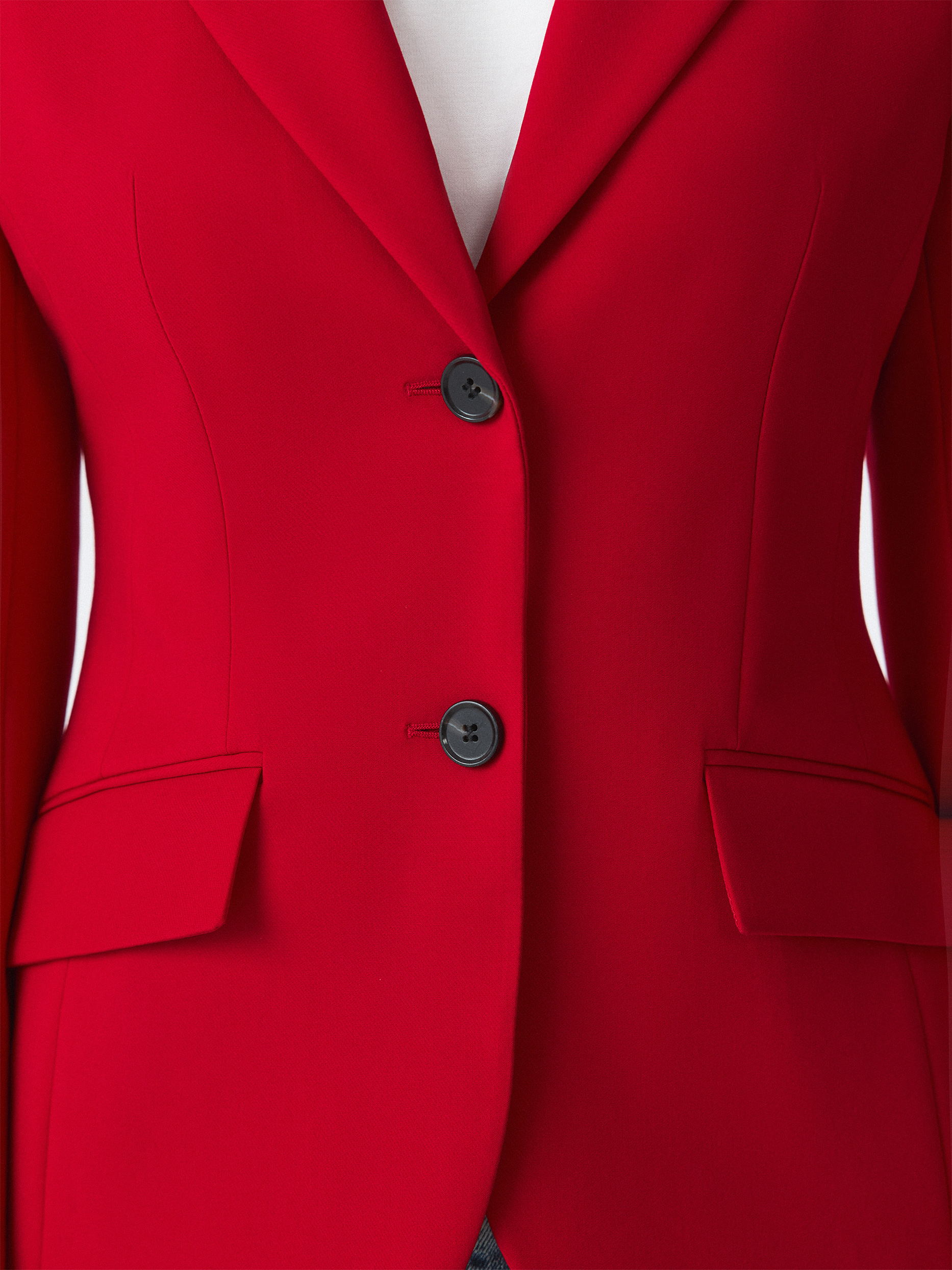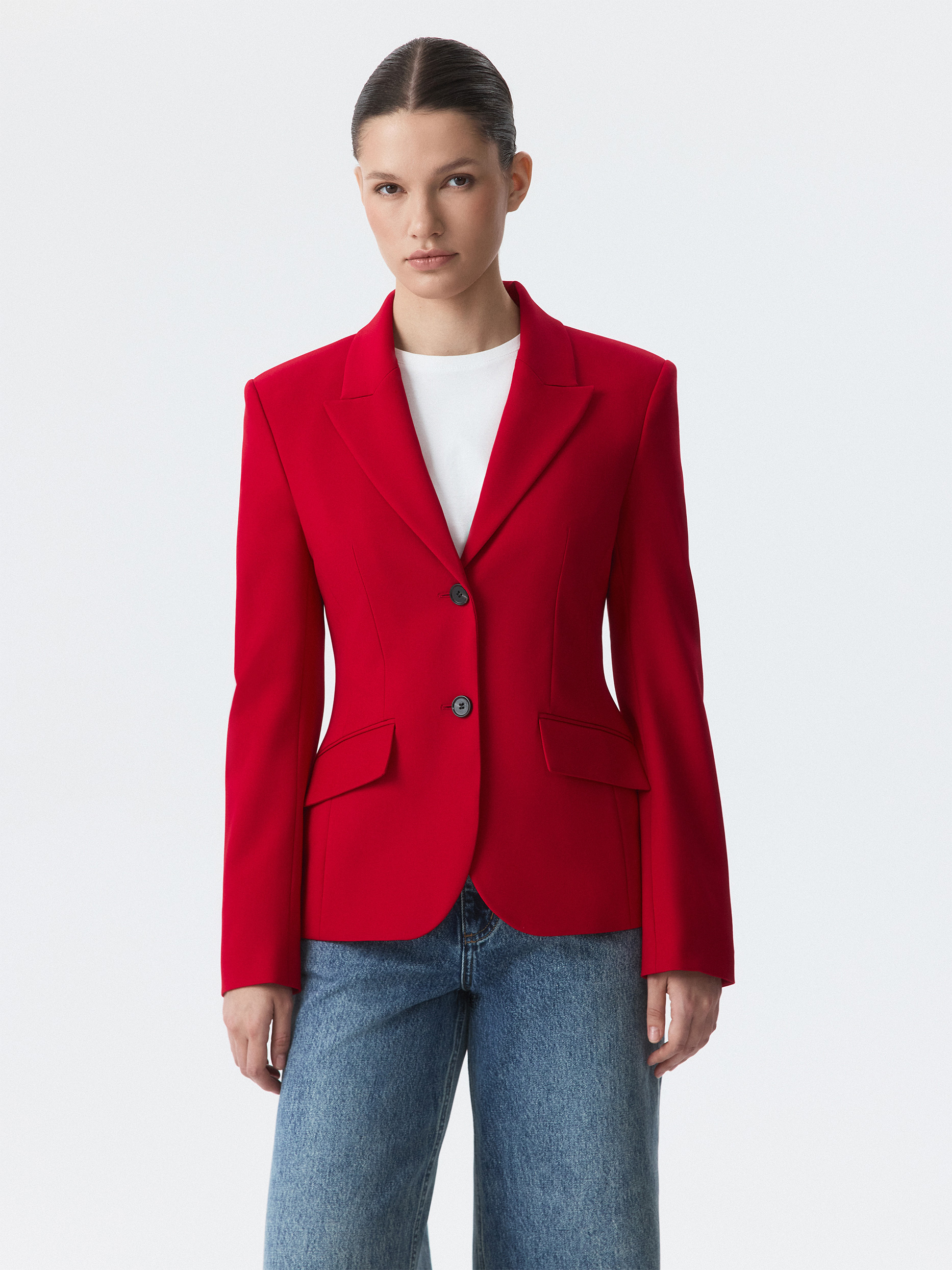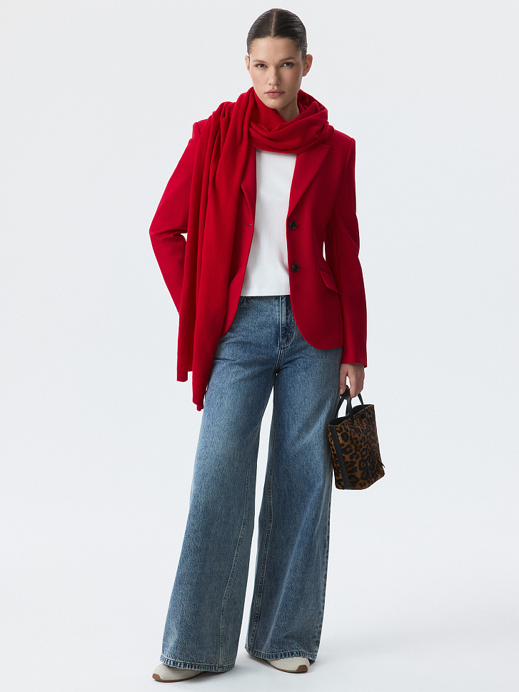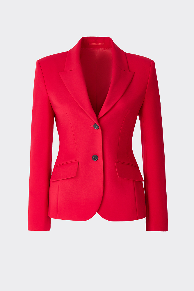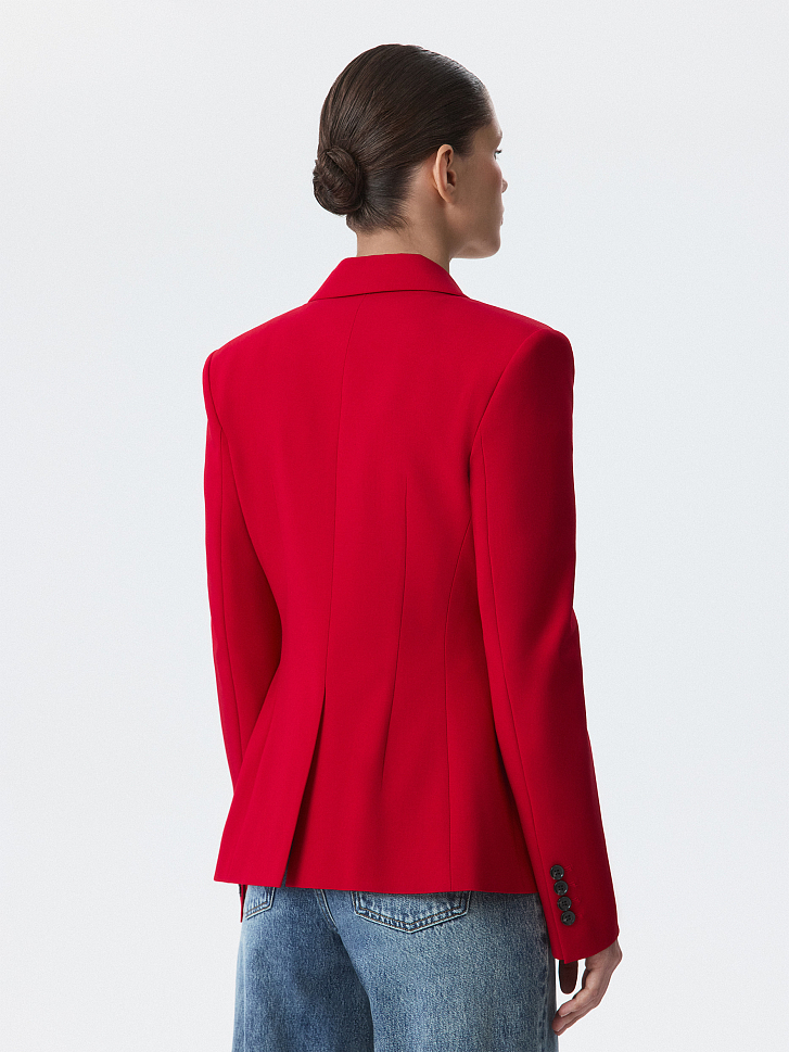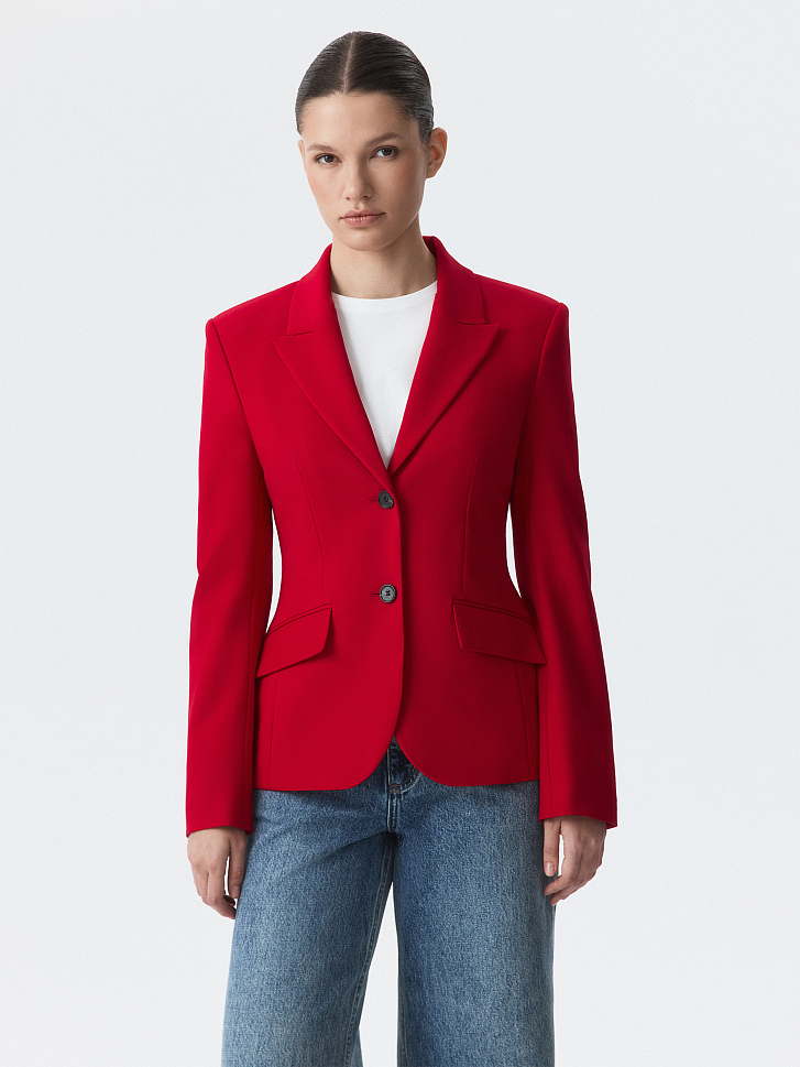 Приталенный однобортный жакет с равным успехом сработает и в деловых, и в вечерних образах. Для пошива модели выбрали плотный текстиль на основе вискозы, который не тянется и комфортно садится по фигуре за счет гладкой подкладки. Завершить костюм можно брюками из аналогичного материла.