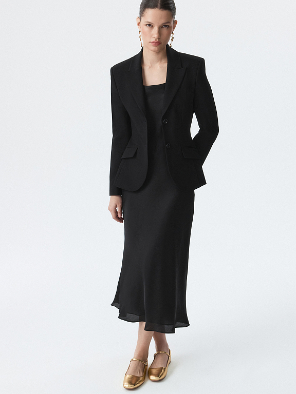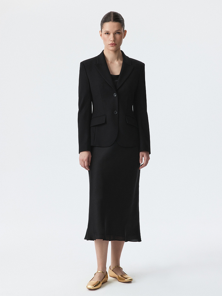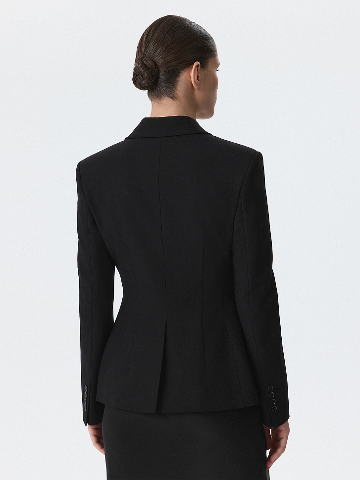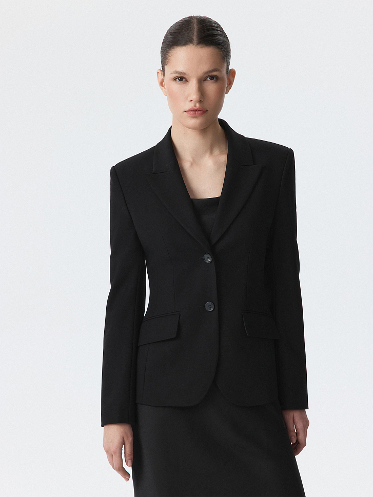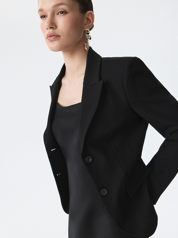 Однобортный жакет приталенного кроя звучит женственно и уверенно. Плотный текстиль на основе вискозы не тянется и комфортно садится по фигуре за счет гладкой подкладки. Костюм можно дополнить парной юбкой или брюками.