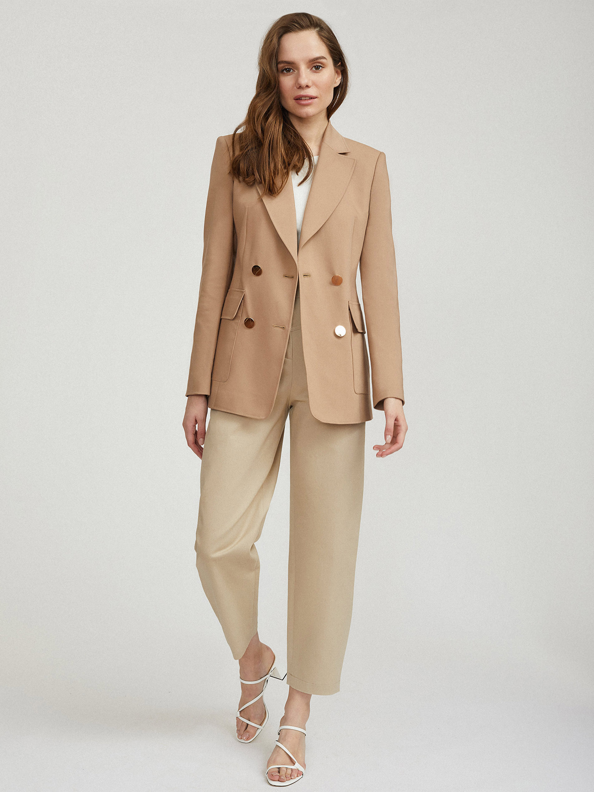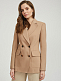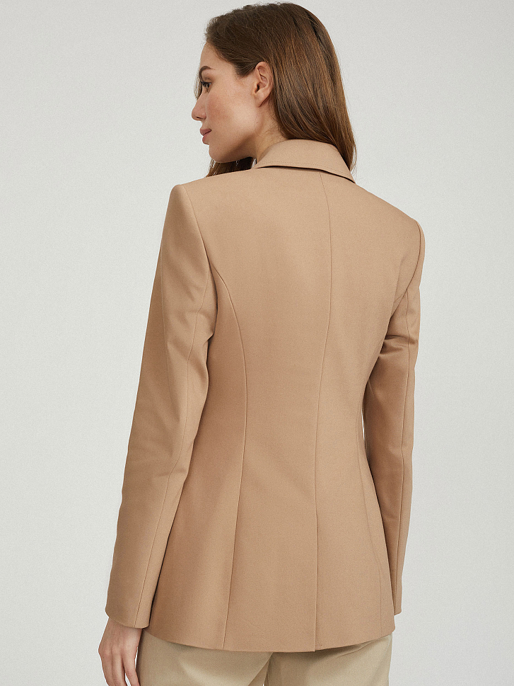 Двубортный жакет приталенного кроя, выполненный из плотного смесового хлопка. Отложной воротник с лацканами, крупные накладные карманы, шлица, подкладка. Застегивается на два ряда крупных металлических пуговиц.