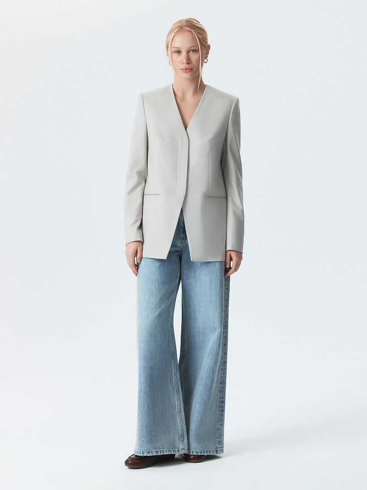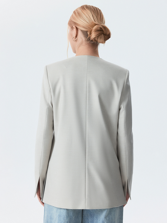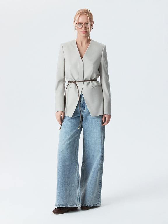 Жакет с V-вырезом настроит на деловой лад. Плотный текстиль из поливискозы хорошо держит форму и не мнется, а гладкая подкладка дарит комфортное прилегание. Прямой жакет можно приталить кожаным шнурком из комплекта.
