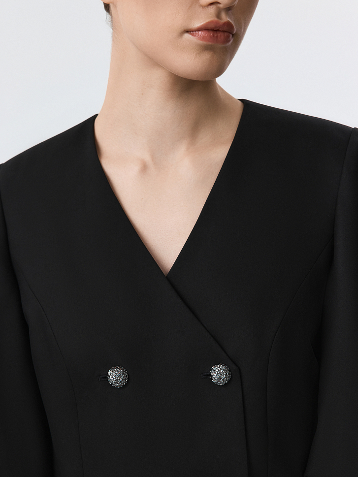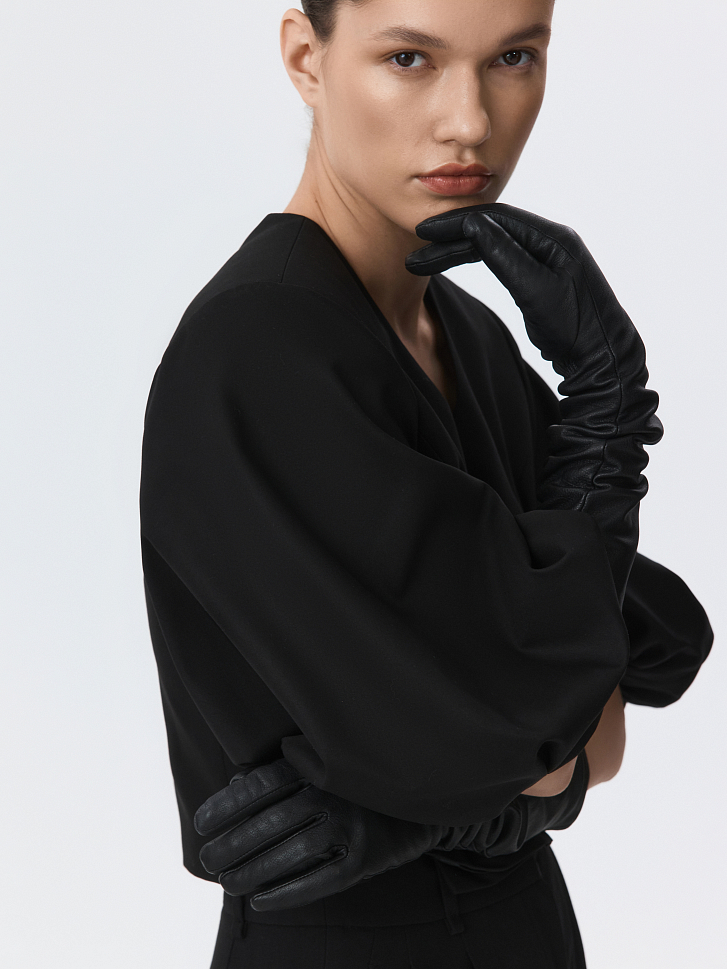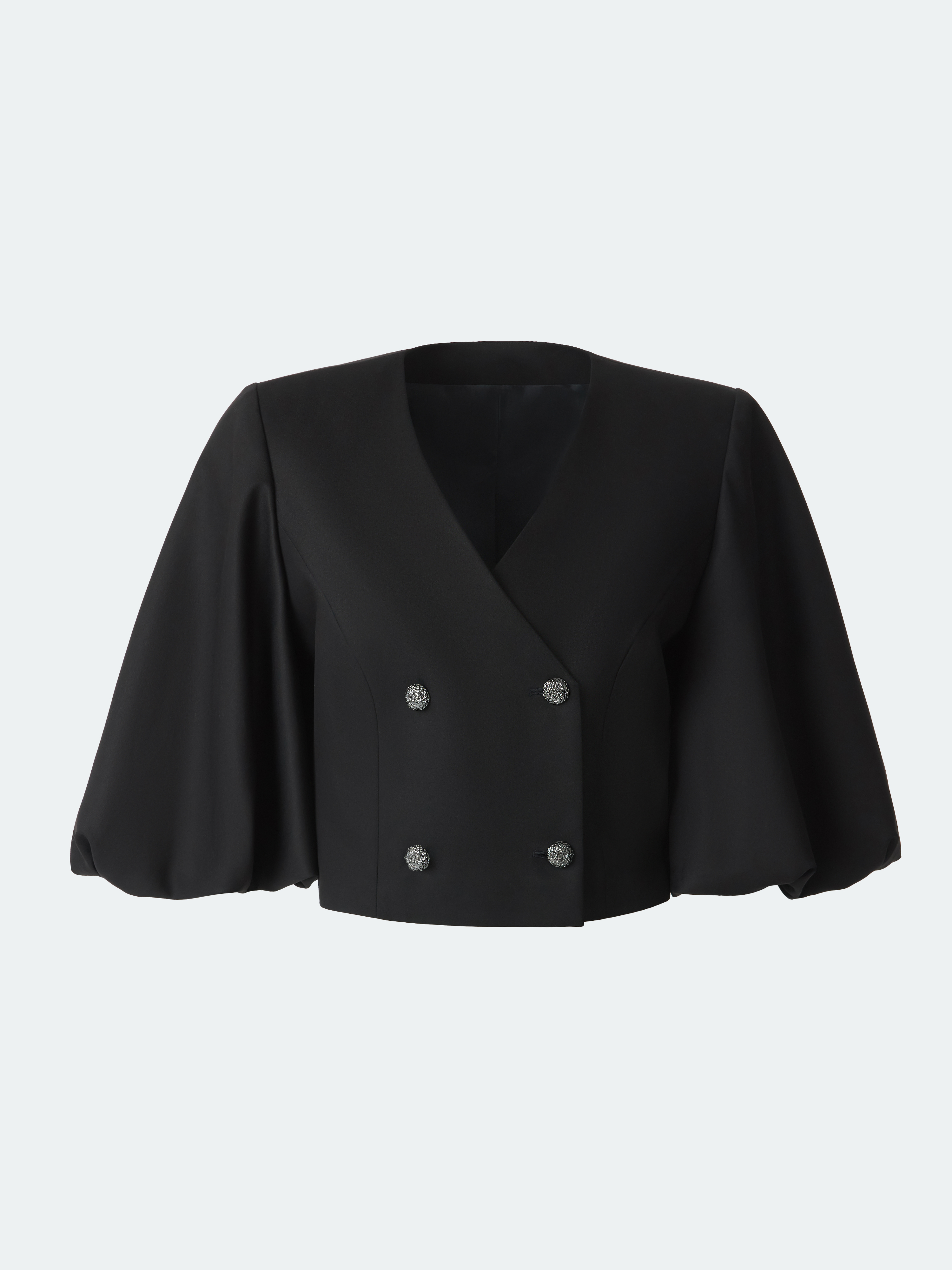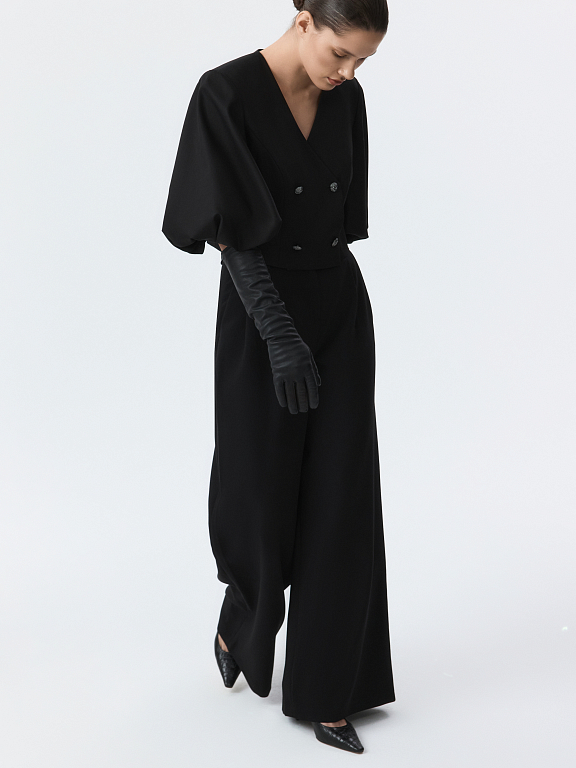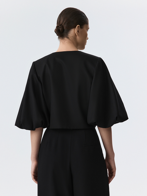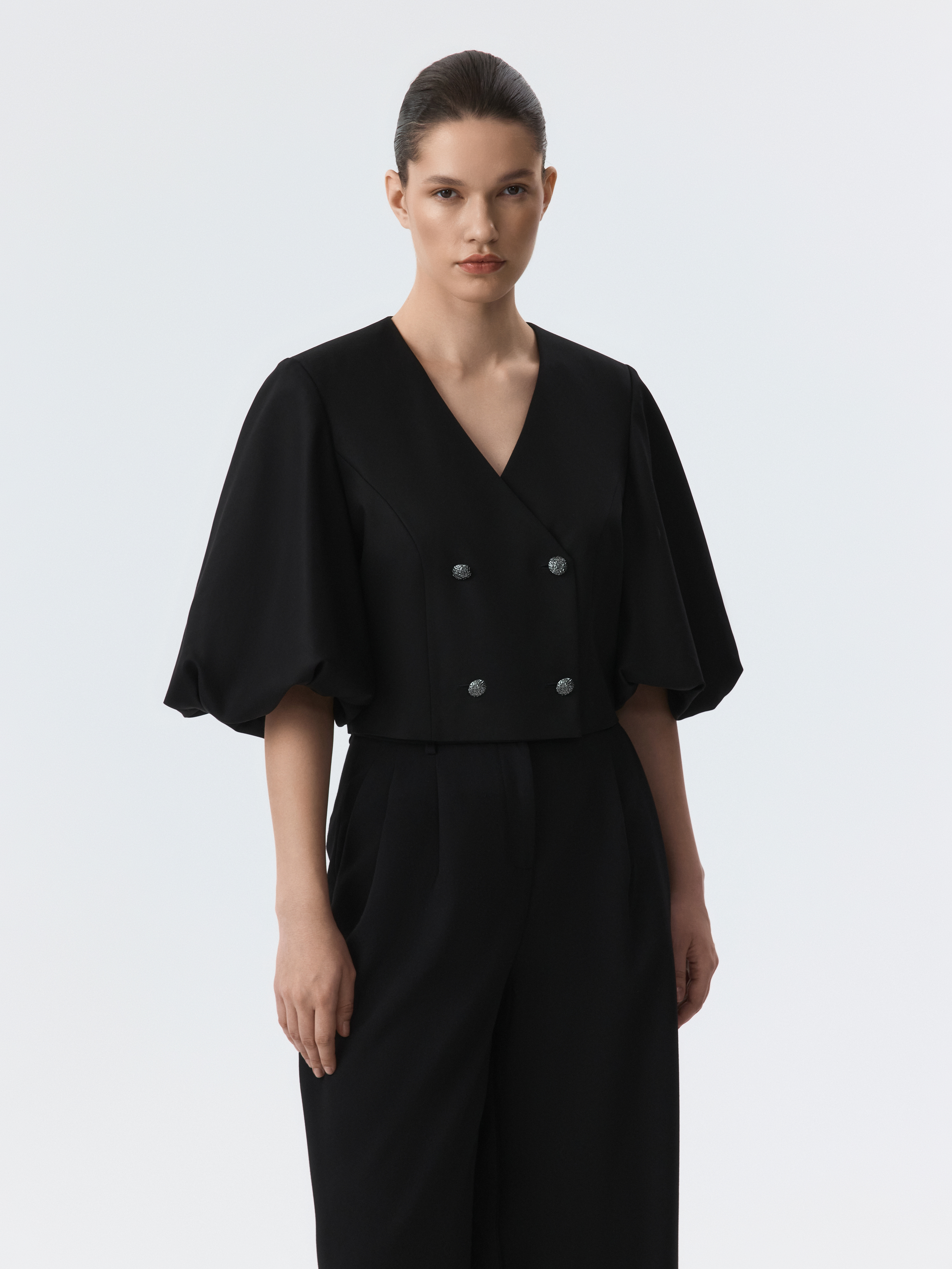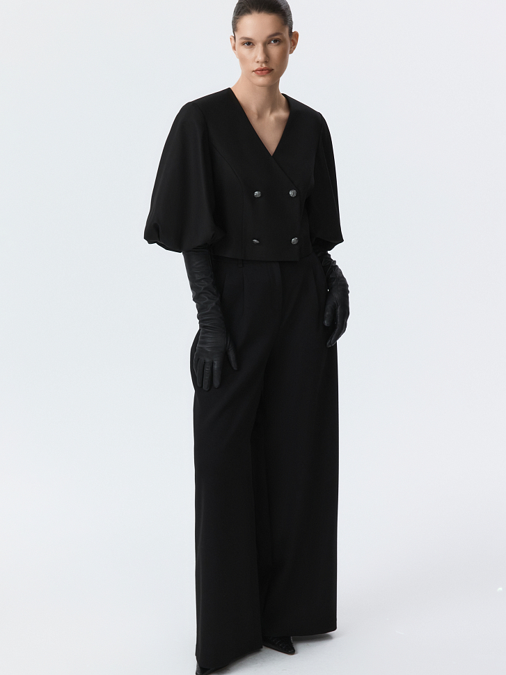 Укороченный жакет с рукавами-буф мгновенно преобразит любой образ, сделав его более праздничным. В меру плотный текстиль на основе вискозы не тянется и не мнется, а за счет гладкой подкладки комфортно прилегает. Дополнить костюм можно парными брюками.