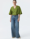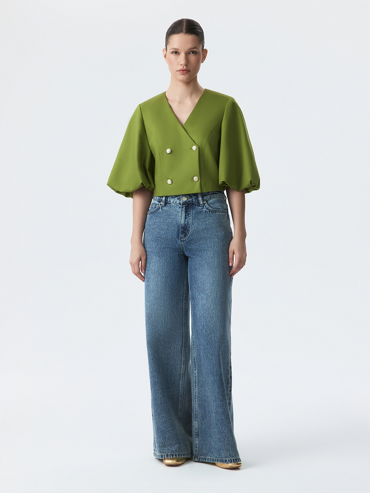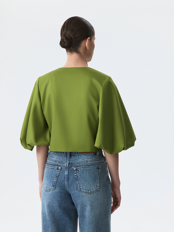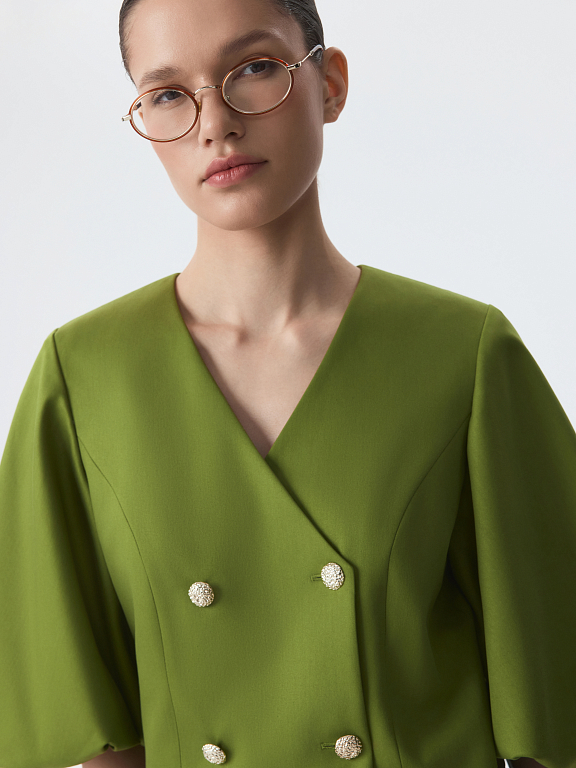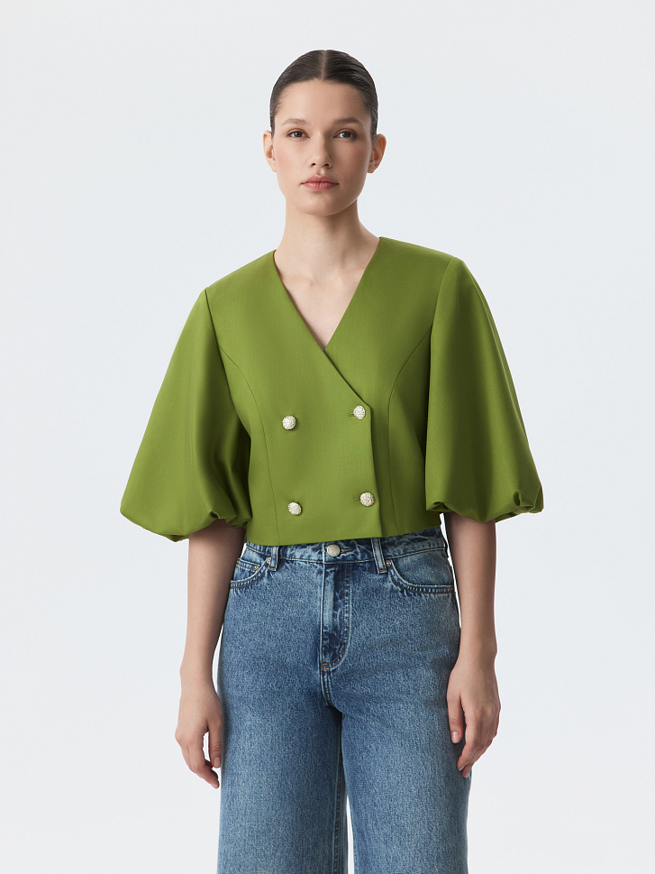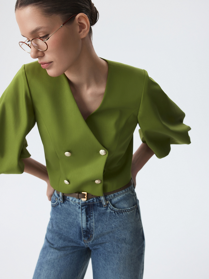 Укороченный жакет с рукавами-буф мгновенно преобразит любой образ, сделав его более праздничным. В меру плотный текстиль на основе вискозы не тянется и не мнется, а за счет гладкой подкладки комфортно прилегает. Дополнить костюм можно парными брюками.