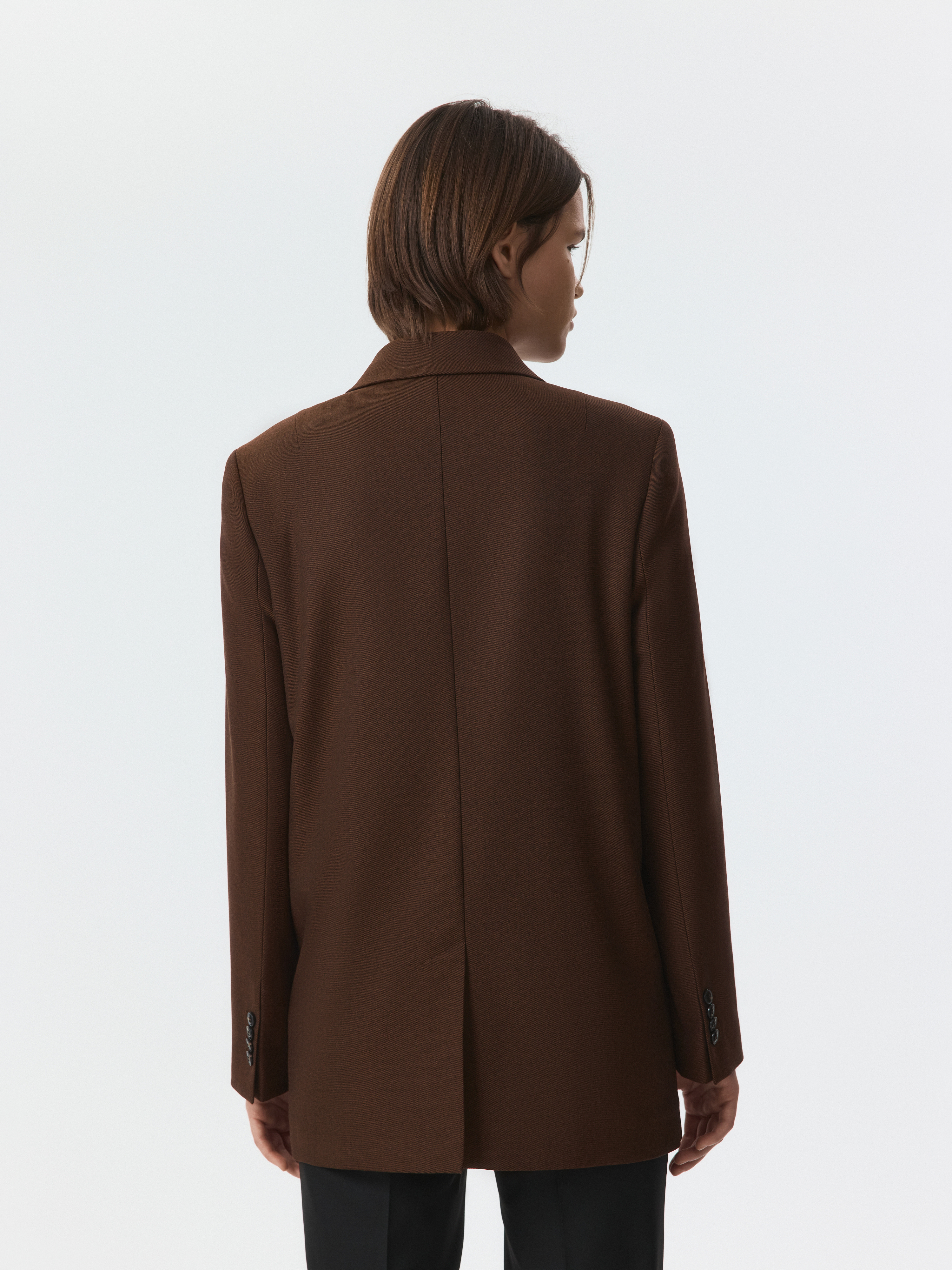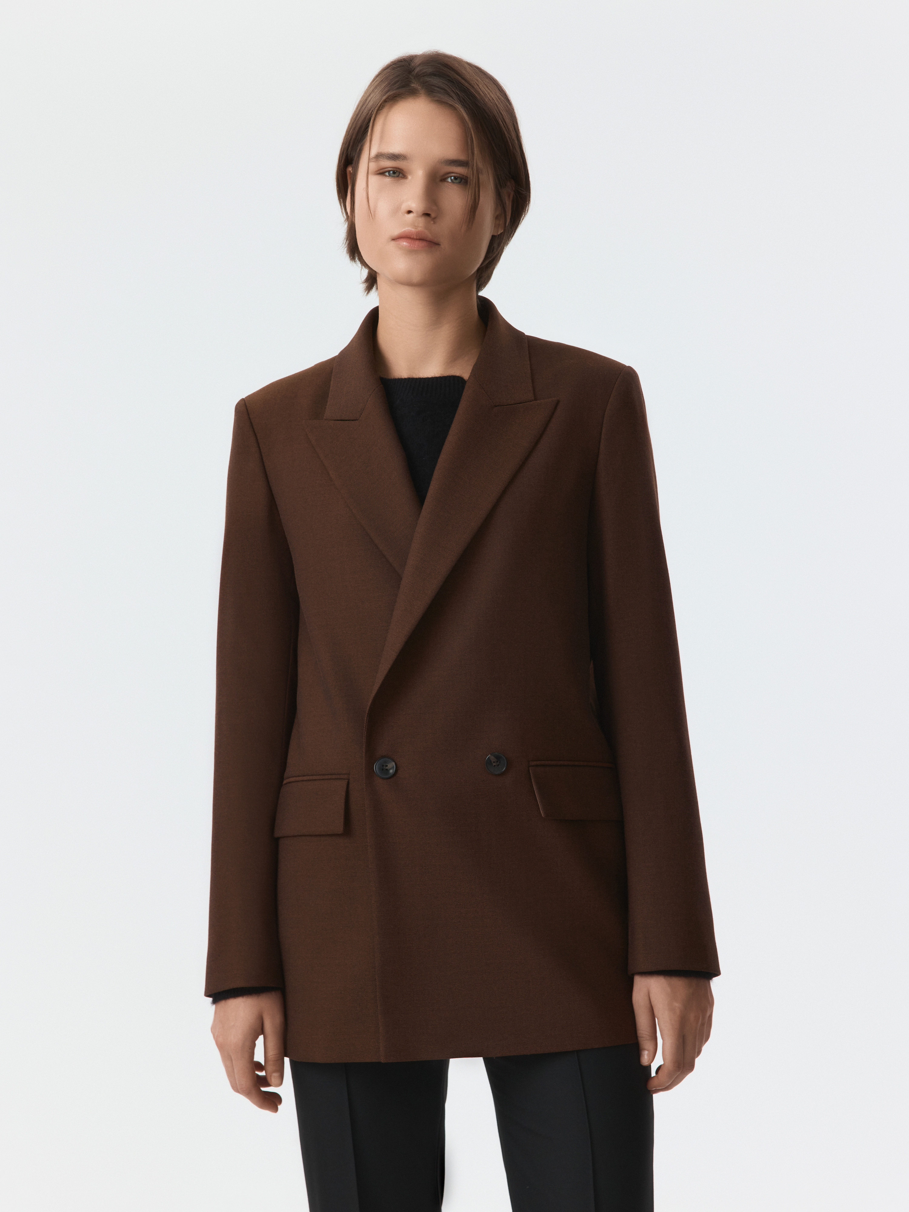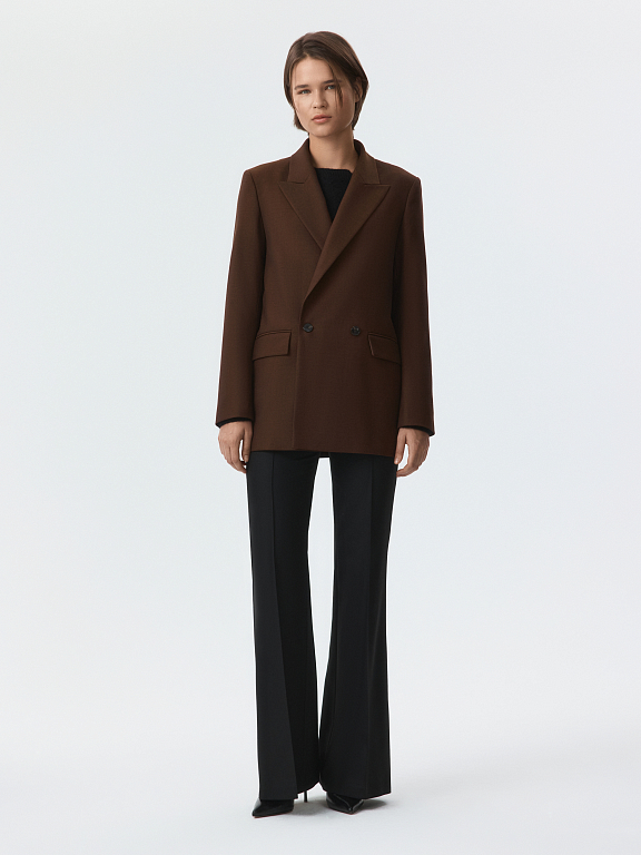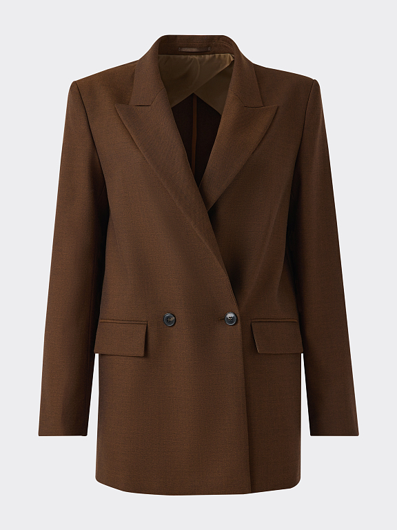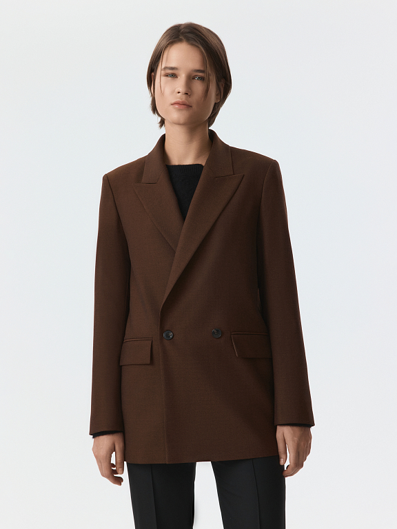 Двубортный жакет свободног кроя гармонично впишется в современный гардероб. В меру плотный костюмный текстиль с содержанием шерсти не тянется и хорошо держит форму, а частичная подкладка дарит комфортное прилегание. Модель расслабленно сидит по фигуре и не сковывает движения.