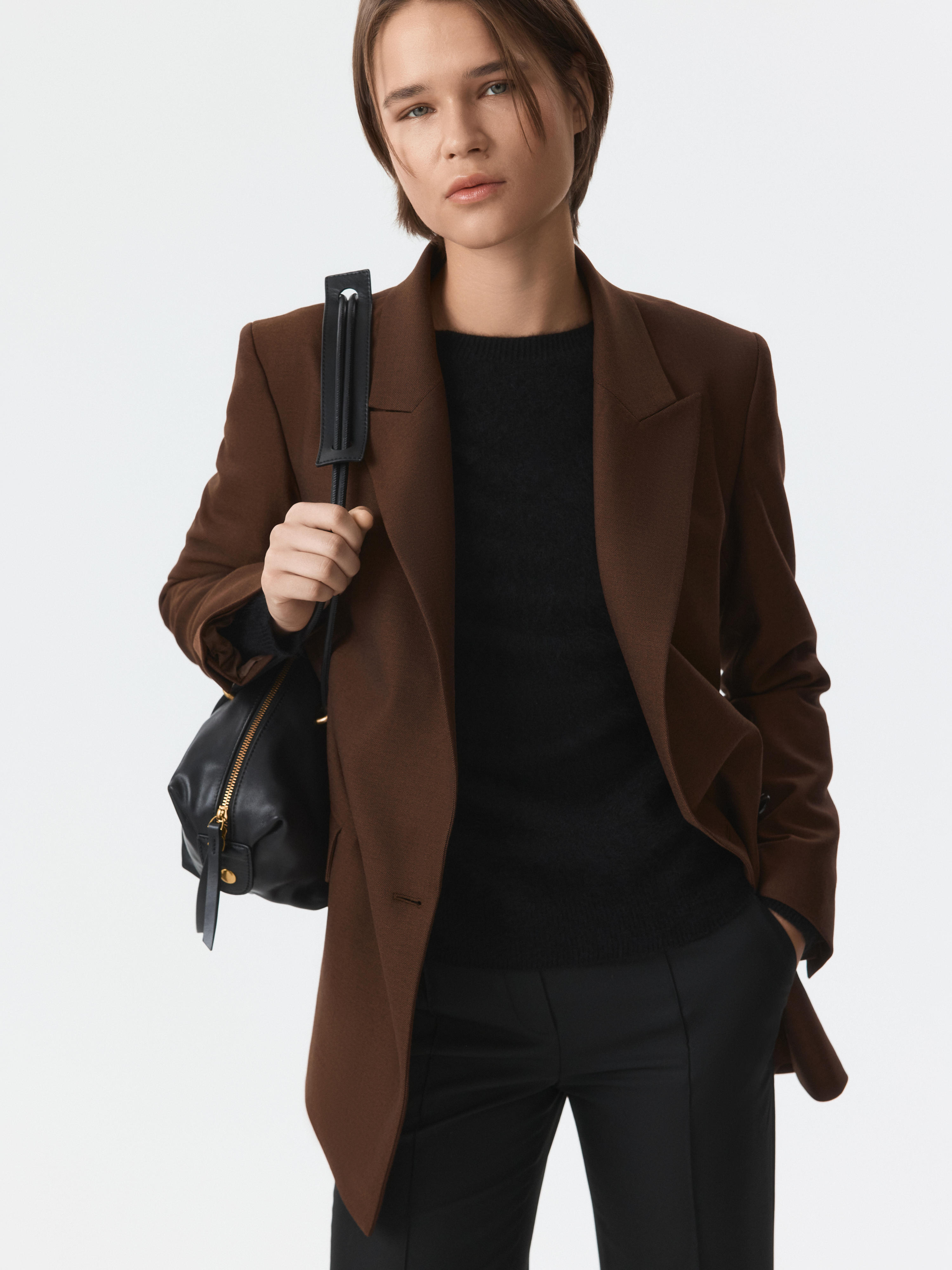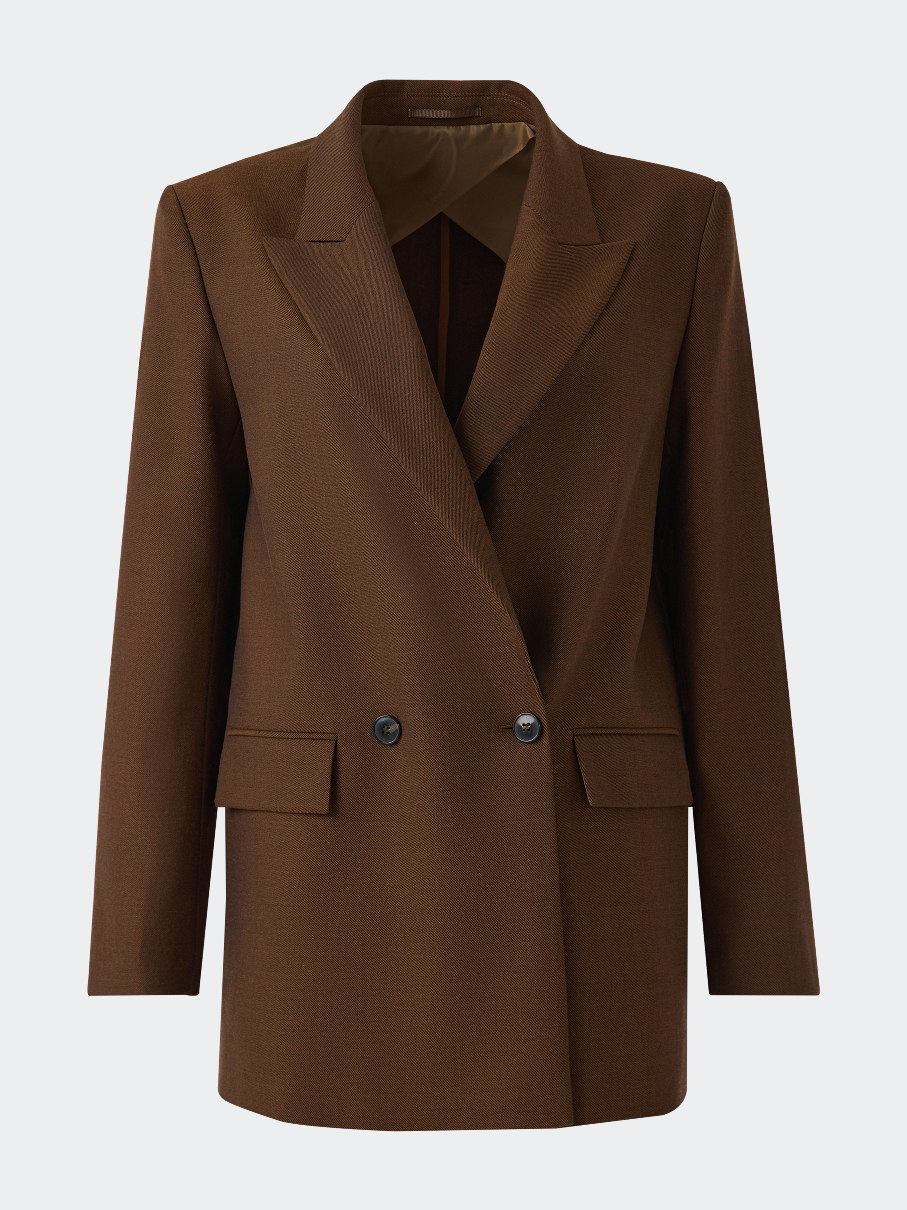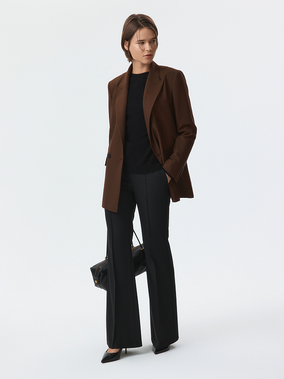 Двубортный жакет свободног кроя гармонично впишется в современный гардероб. В меру плотный костюмный текстиль с содержанием шерсти не тянется и хорошо держит форму, а частичная подкладка дарит комфортное прилегание. Модель расслабленно сидит по фигуре и не сковывает движения.