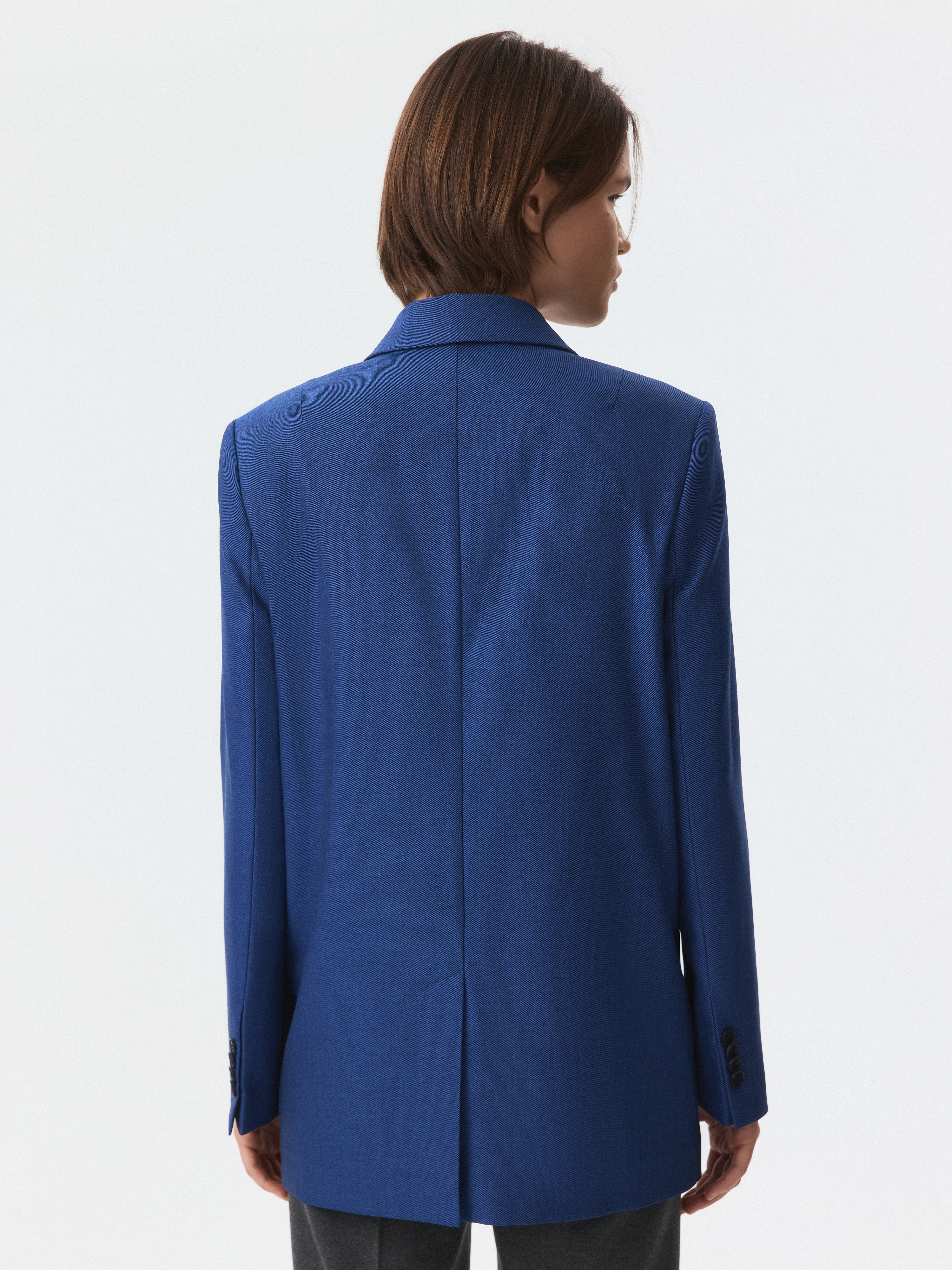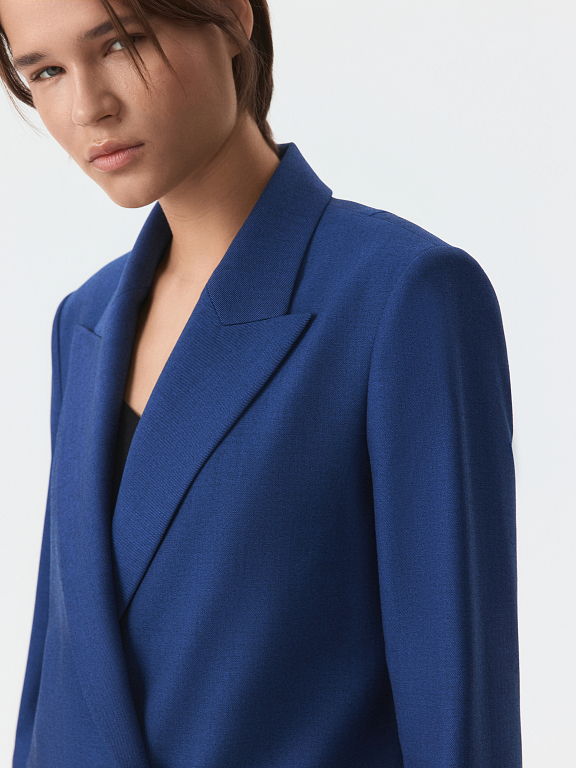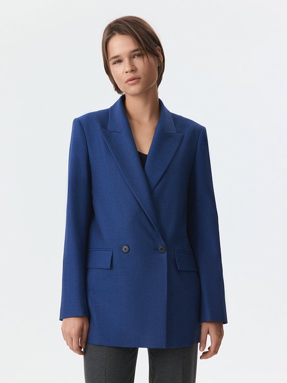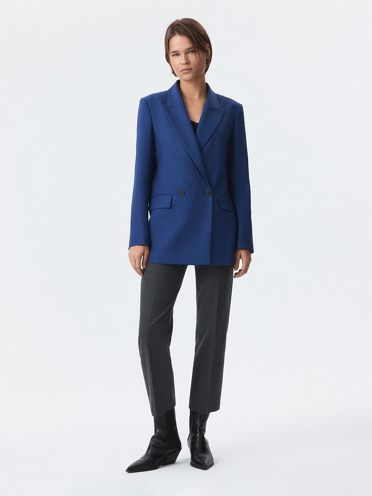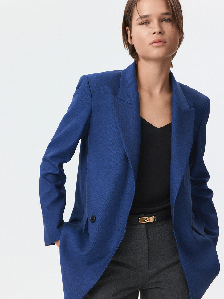 Двубортный жакет свободног кроя гармонично впишется в современный гардероб. В меру плотный костюмный текстиль с содержанием шерсти не тянется и хорошо держит форму, а частичная подкладка дарит комфортное прилегание. Модель расслабленно сидит по фигуре и не сковывает движения.