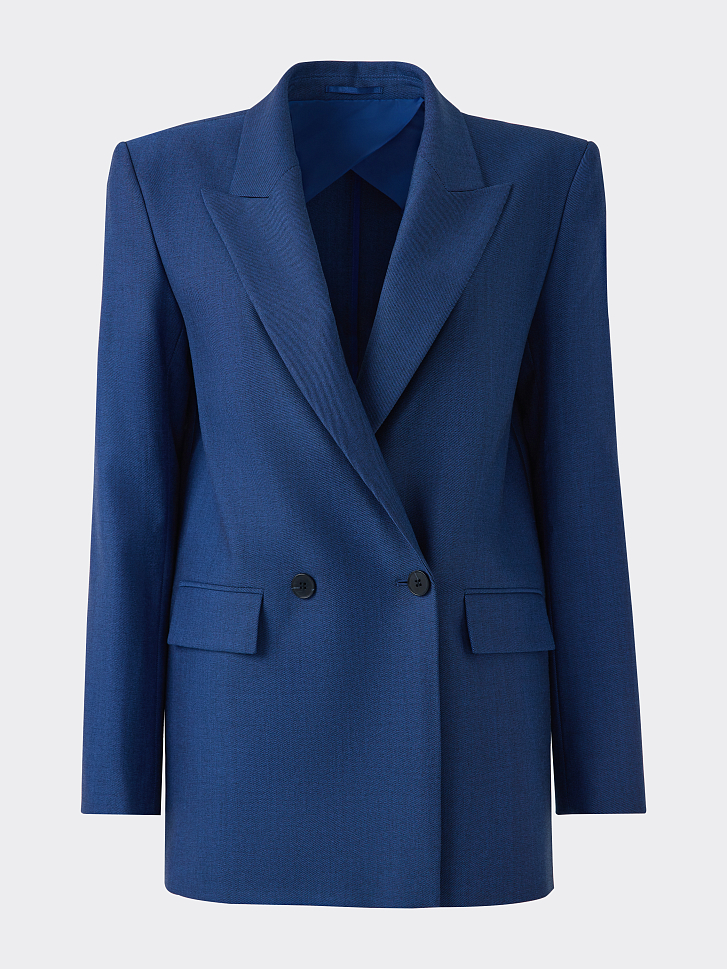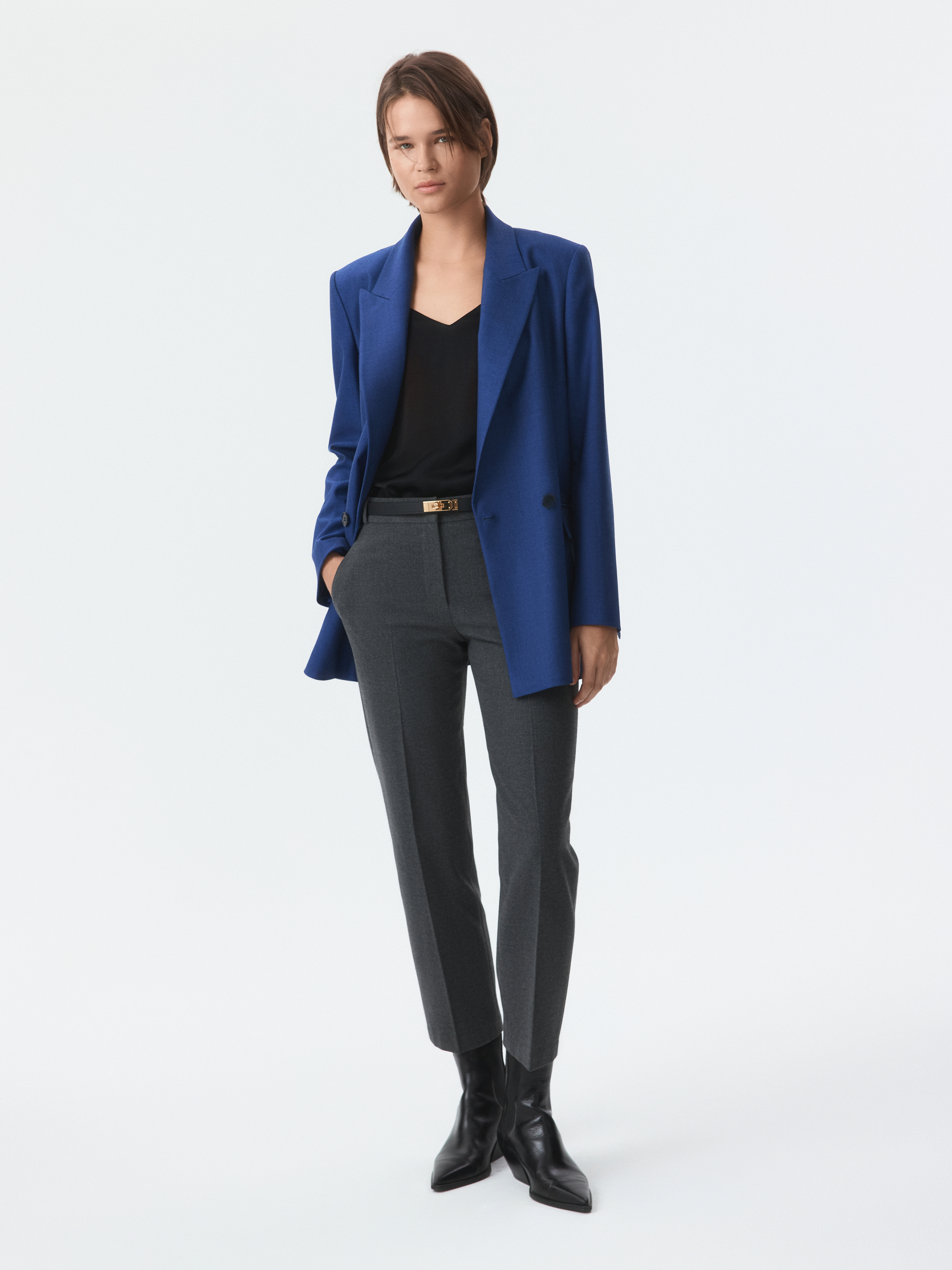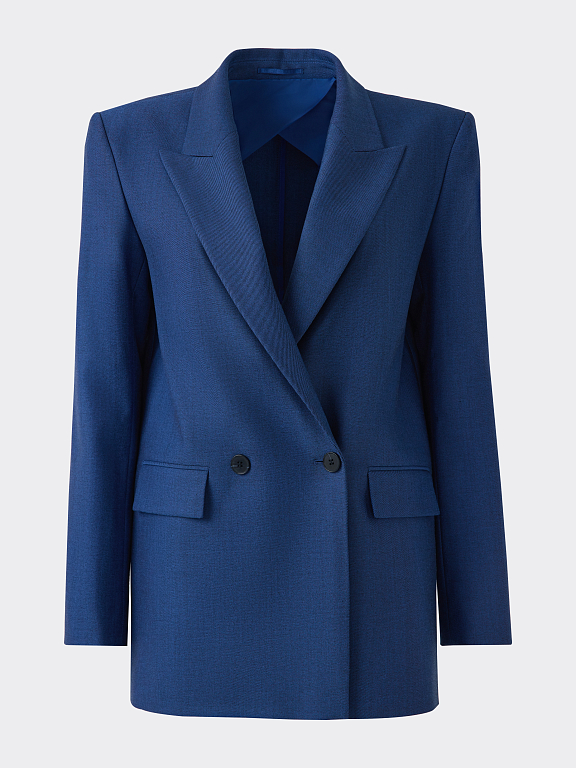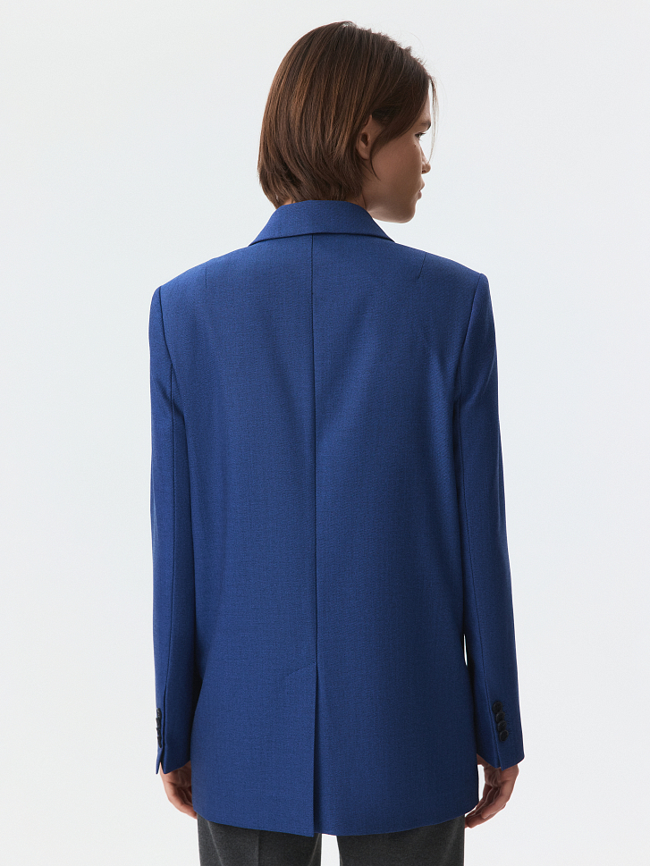 Двубортный жакет свободног кроя гармонично впишется в современный гардероб. В меру плотный костюмный текстиль с содержанием шерсти не тянется и хорошо держит форму, а частичная подкладка дарит комфортное прилегание. Модель расслабленно сидит по фигуре и не сковывает движения.