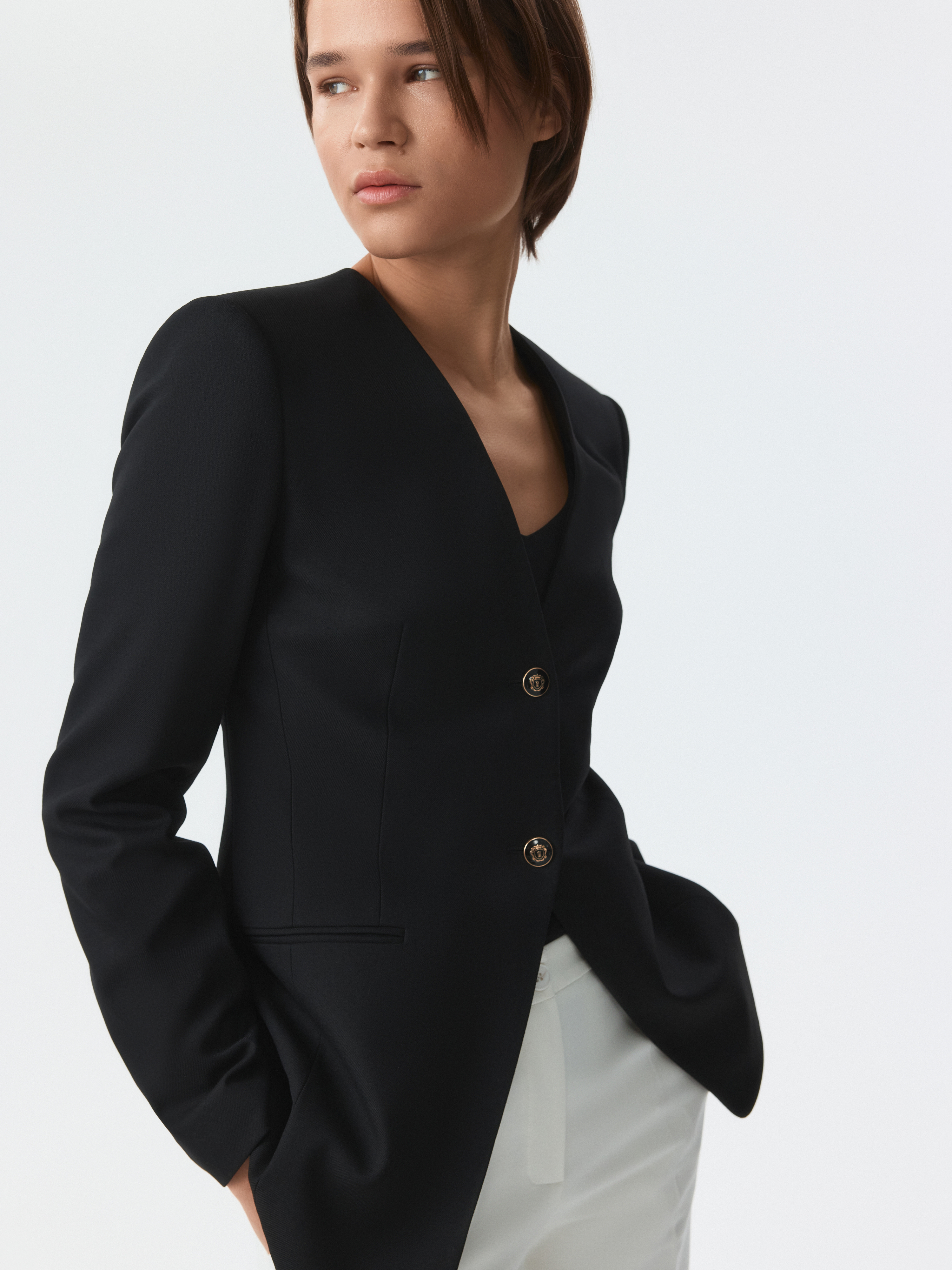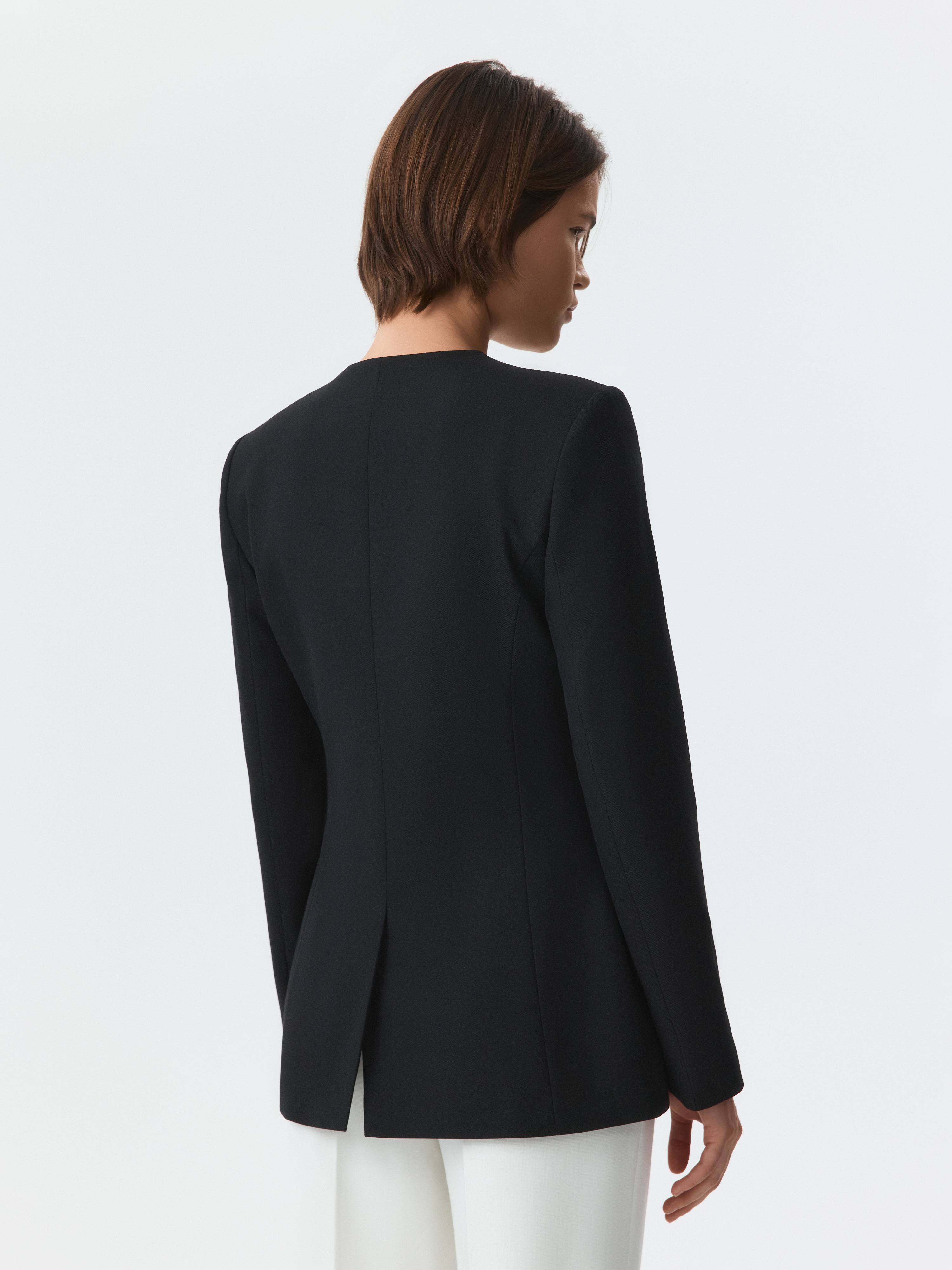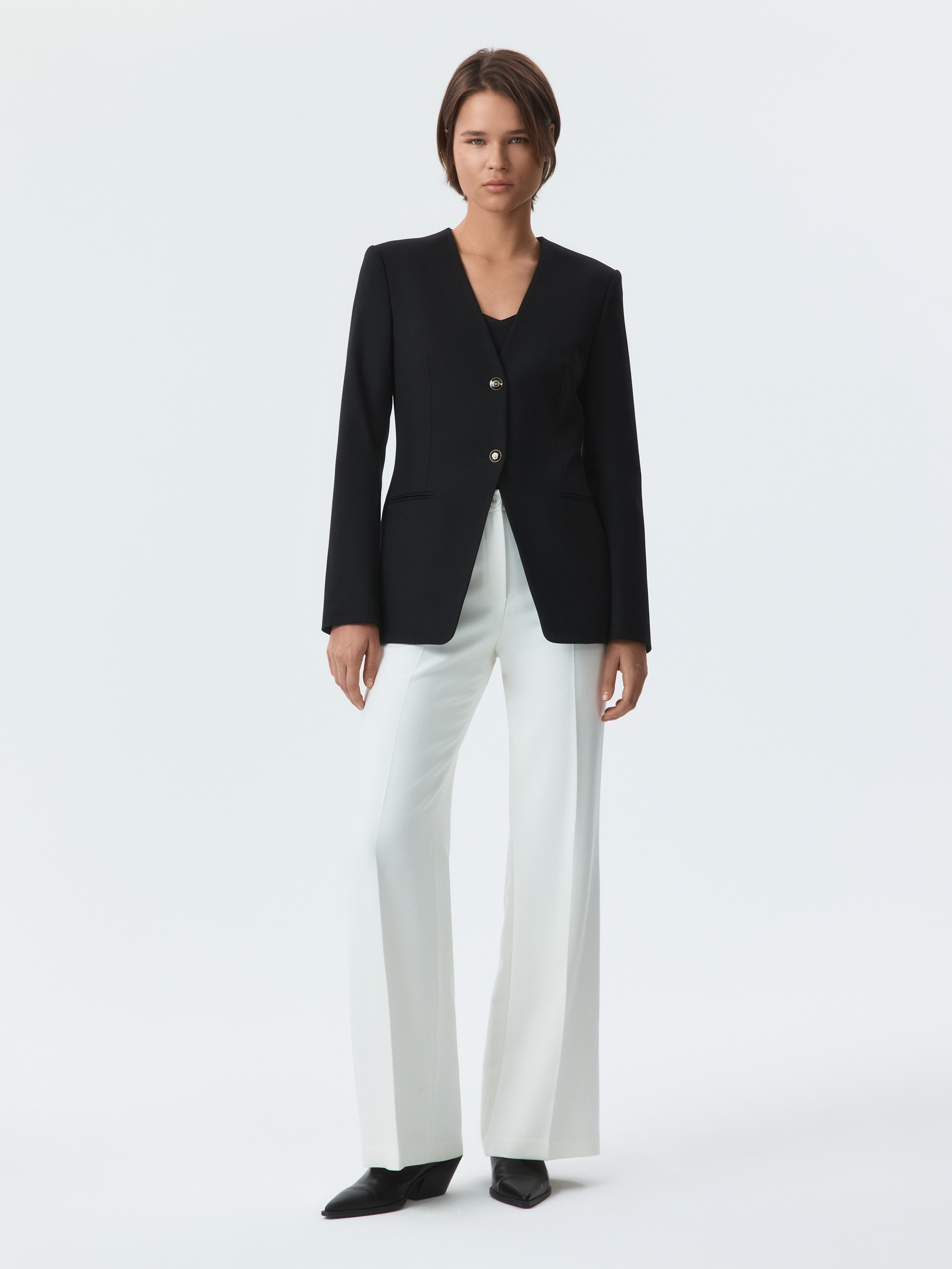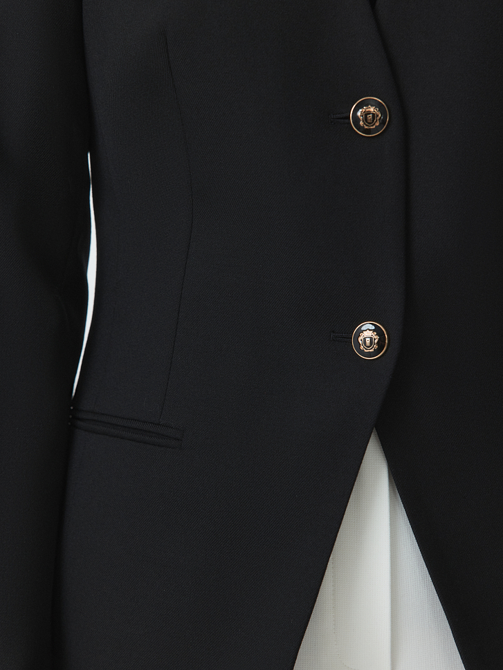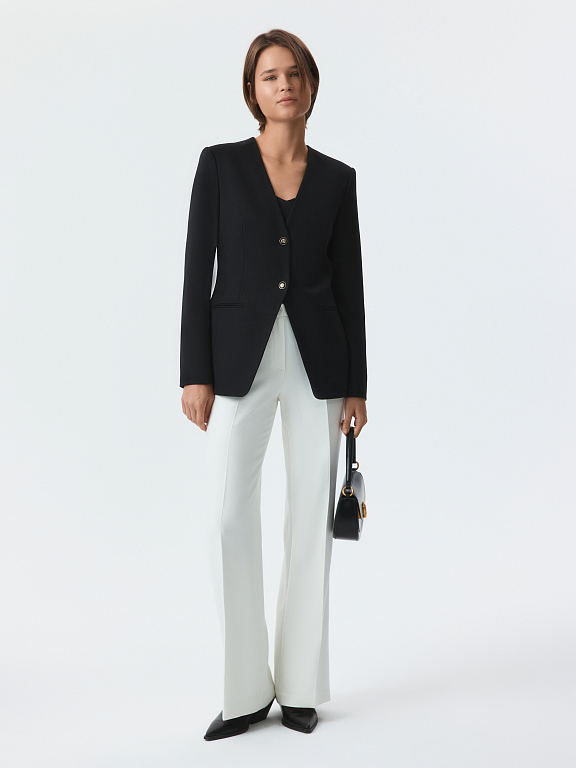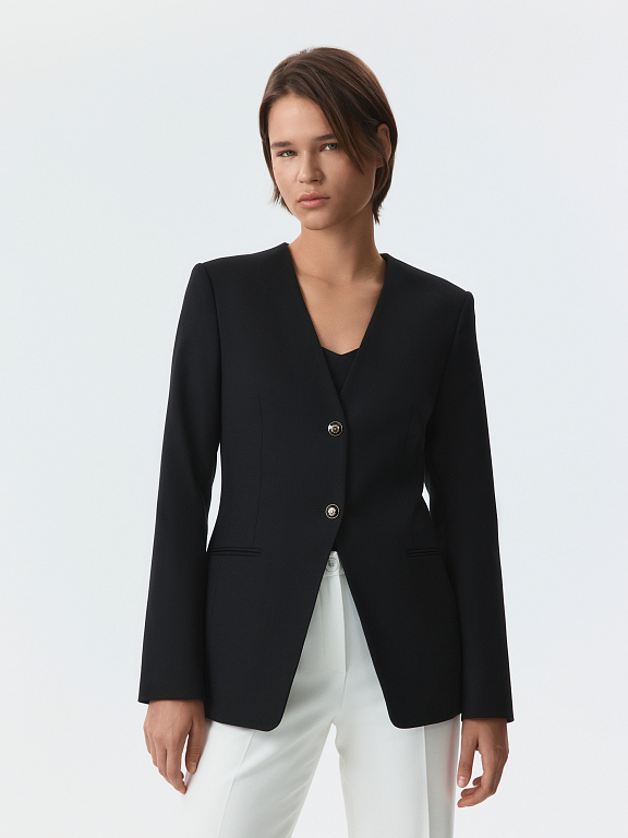 Приталенный однобортный жакет соответствует принципам делового дресс-кода — строгие линии без лишних деталей. В меру плотный текстиль с содержанием натуральной шерсти не вытягивается и комфортно прилегает благодаря гладкой подкладке. Парные брюки (1-44205_50194) завершат костюм.