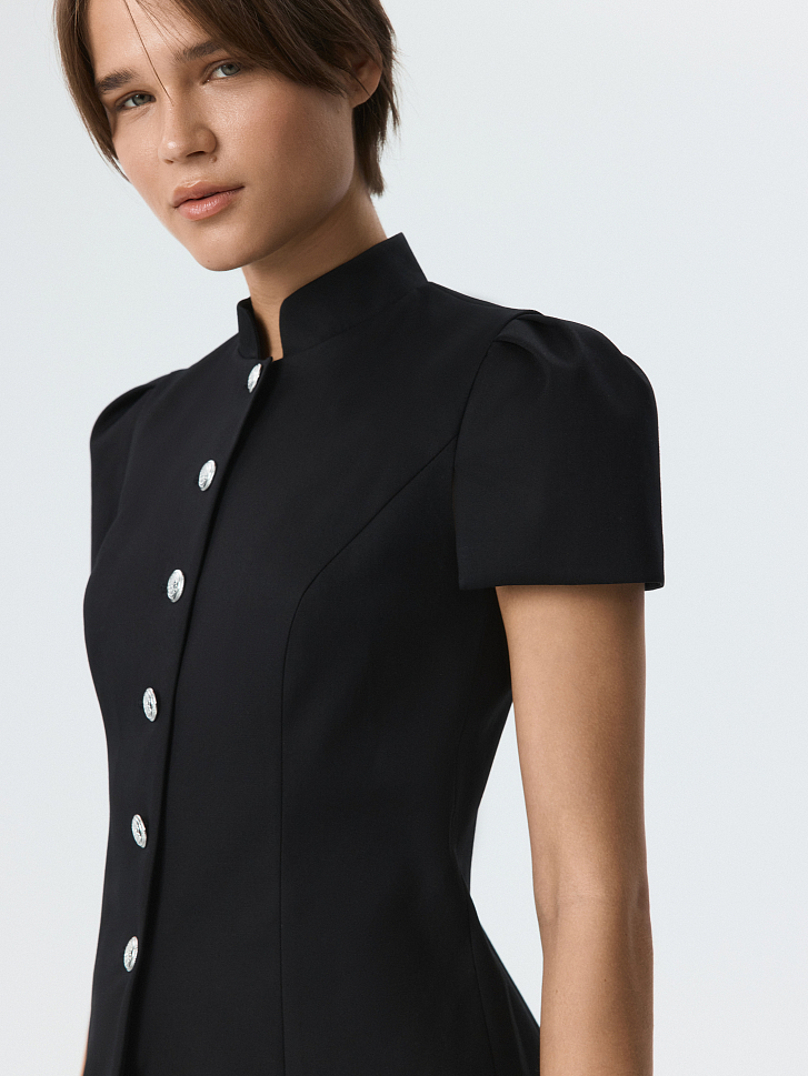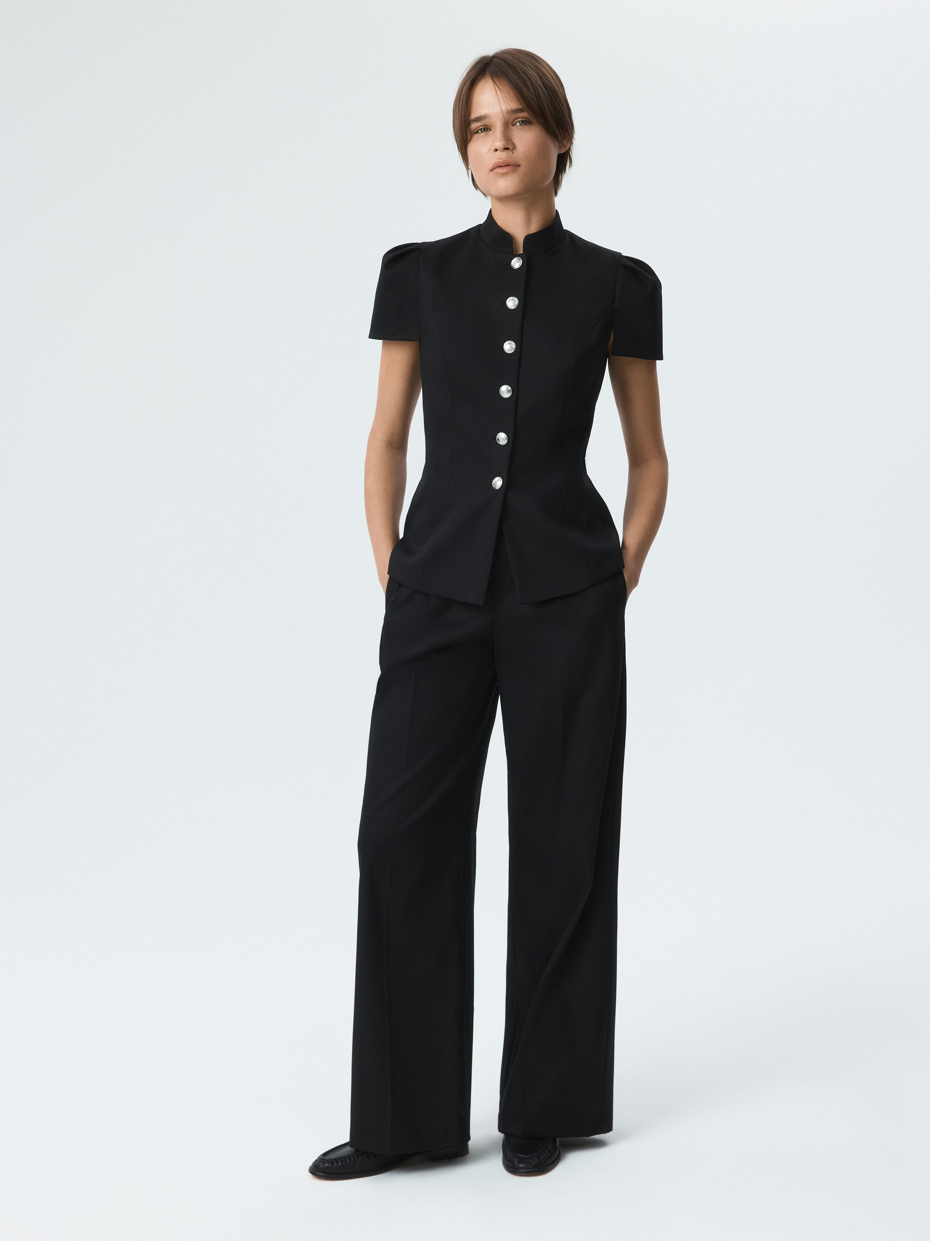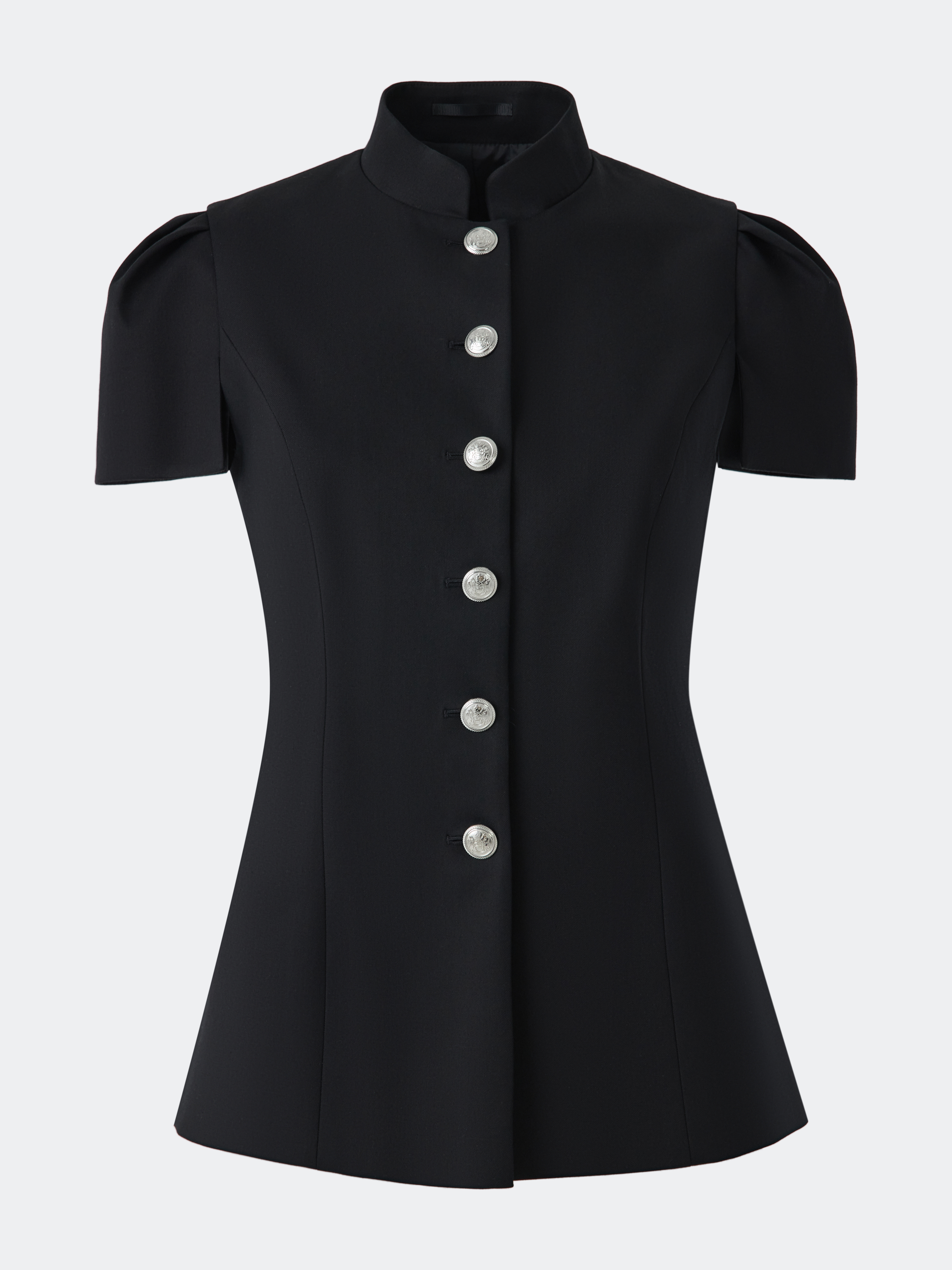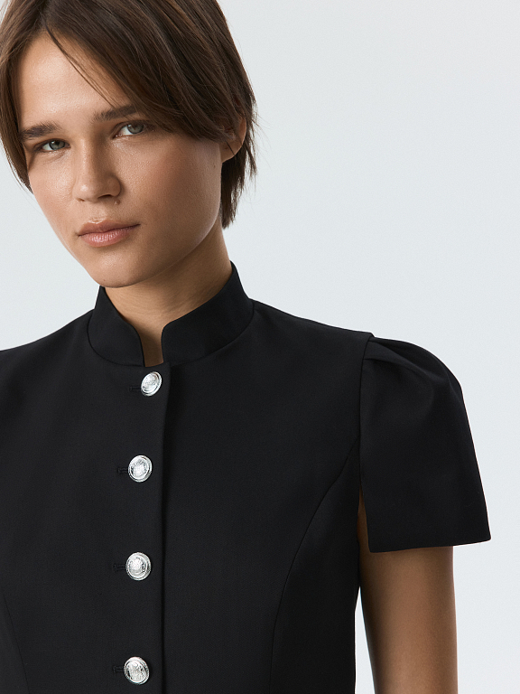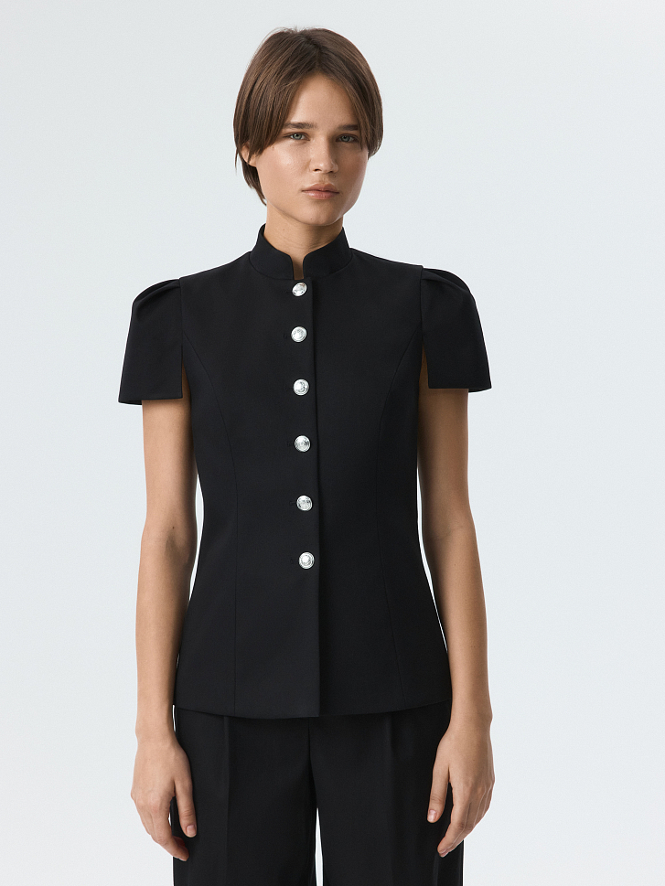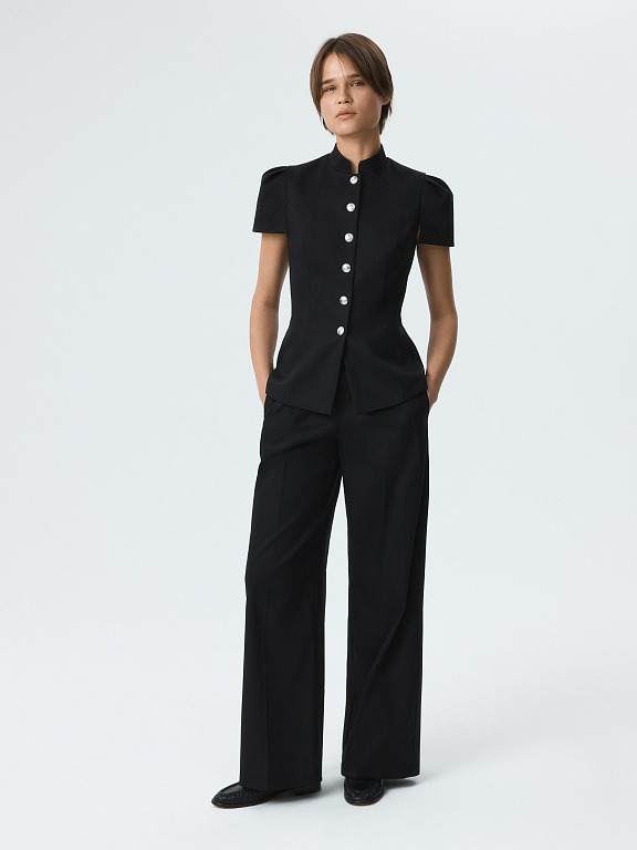 Рукава-фонарики и акцентные пуговицы превращают классический жакет в праздничный элемент гардероба. Облегченный костюмный текстиль на основе хлопка мягко прилегает и комфортно сидит по фигуре благодаря гладкой подкладке. Дополнить образ можно комплектными брюками или любым другим низом.