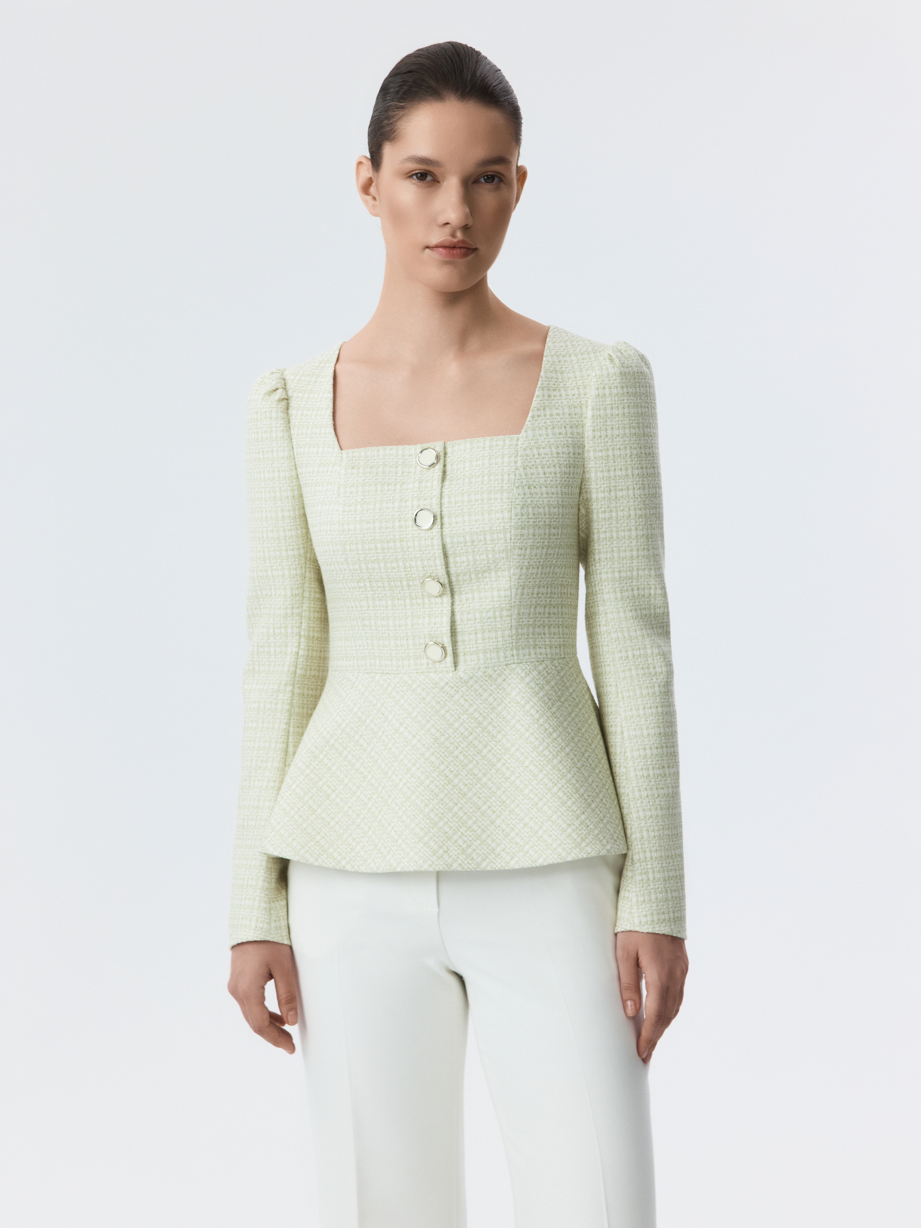 Приталенная блуза с вырезом каре привлекает внимание сочетанием элегантного кроя и выразительного материала. В меру плотный твид не тянется и не мнется, хорошо сохраняя форму, а гладкая подкладка дарит комфортное прилегание. Пуговицы с эмалью играют роль акцентов.